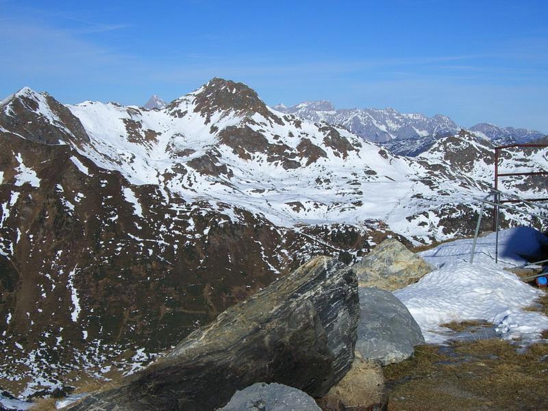 Seekareck, Panorama, Seekarspitz, Kringsalm, Gamsleiten sehr schön. Schönalm steinig. Zehnerkar sehr, sehr eisig. Beim Skiweg von Gamsleiten zum Schaidberg ging nach der Schibrücke der Schnee aus. Hier hieß es die Fußmaschine anzuwerfen. Schaidberg auch hart. Gründwalkopf äußerst schlecht, steinig, weich.