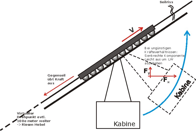 Christoph Lütz hat geschrieben:- Bei bergseitigem Zugseilriss beschleunigt der Restseilzug des talseitigen Zugseils das Laufwerk, und dreht dieses um den Massenschwerpunkt in der Kabine. Bei Windenbahnen und Standseilbahnen ohne Gegenseil entfällt dieser Effekt.
