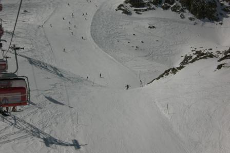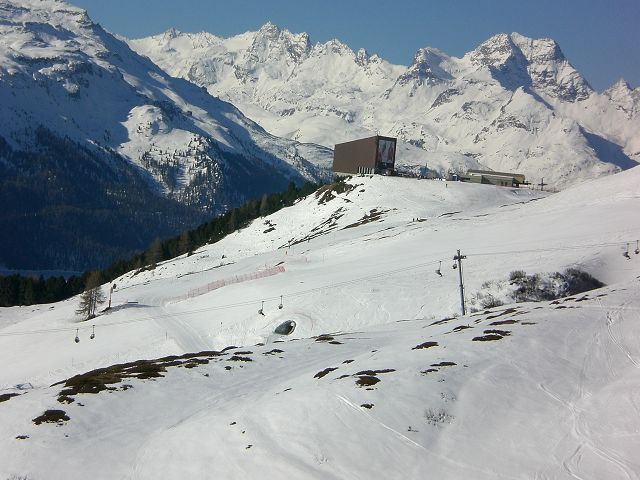 Nach 10.00 Uhr: über 2500-3057 m.ü.M Pulver, von 2100-2500 Sulz/firn und schliesslich von 1772- 2100 m.ü.M Klebepappe mit teilweise Wasserski auf der Piste Waldweg nach St. Moritz Bad