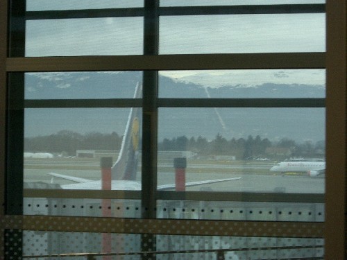 ^^ Am nächsten Tag am Flughafen. Beim Blick übers Rollfeld zeigt sich in den dahinter liegenden bewaldeten Bergen eine verdächtige Schneise (schwer zu erkennen, ungefähr auf halber Höhe des Heckleitwerks). Google Maps wird befragt und findet in der Gegend von Crozet eine „Route de la Télécabine“. Ich habe offenbar dies hier gesehen: