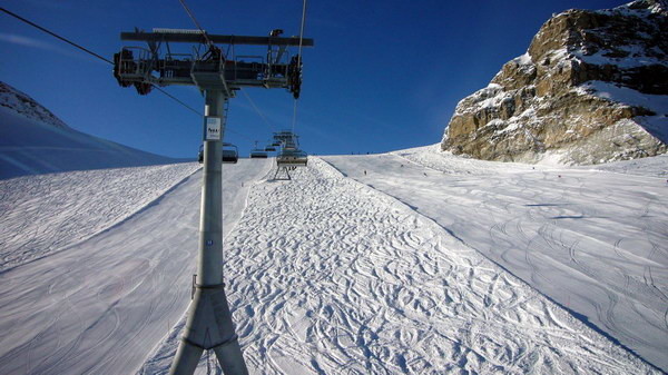 Aber zurück in die Schweiz: Nach dem schönen Hang am Furggsattel kommt eine laaaaange Ebene, nicht wirklich spassig, dann der Ziehweg zum Trockenen Steg. Toll... von da aus kommst Du nur mit der Gondel (waaaaarten...) nach Klein Matterhorn, wo du oben zunächst mal laaaang durch den Tunnel spazierst, dann einen extrem flachen Hang nehmen musst, bevor du einen weiteren schönen Hang hast (bei den zwei parallel verlaufenden Gletscherskiliften). Das wars dann auch schon: Flaaaaach gehts mit Anlauf und Stockstössen zum Trockenen Steg.