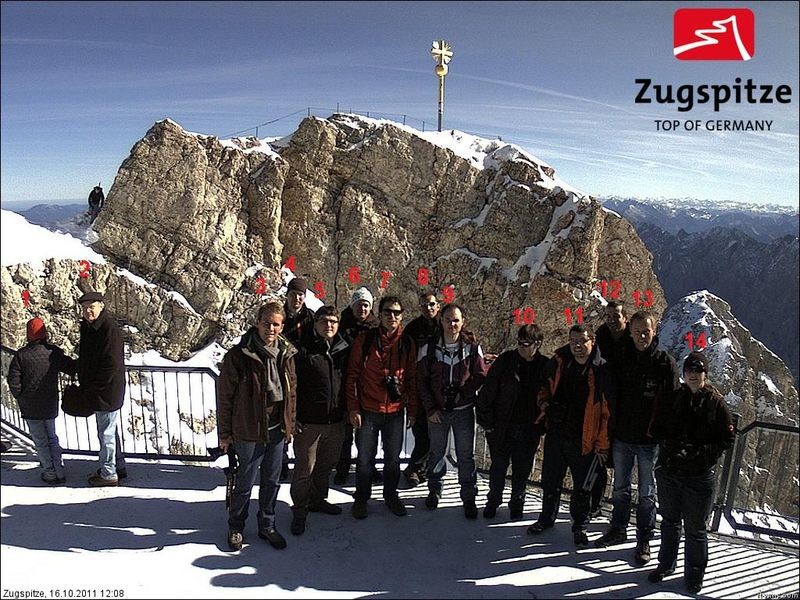 Dieser Bericht ist eine Gemeinschaftsproduktion der Teilnehmer (v.l.n.r. oben im Gruppenbild): Person mit roter Mütze, älterer Herr, Bergsteiger, Münchner, vovo, F. Feser, Hebi, k2k, Martin Hurm (BZB), Huppi, GMD, Dachstein, Flo, Tobias Benthin (BZB), Schafi. Irgendwo dazwischen: Zugspitzgipfel