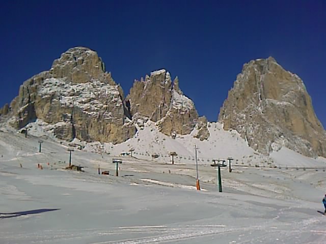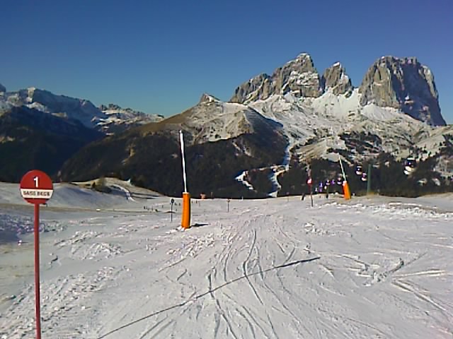 Grundsätzlich kommt man auch heute schon von Dantercepies bis Belvedere und zurück, wenn man am Sellapass 10min Fußmarsch in Kauf nimmt. (Rif Passo Sella => Rif Valentini). Denn die Steinerne Stadt und retour bis Piz Seteur Sole sind schon geöffnet! Sasso Levante und Grohmann sollten aber bald aufmachen. Alle Kanonen liefen heute nachdem sich der Wind um 13 Uhr gelegt hatte.