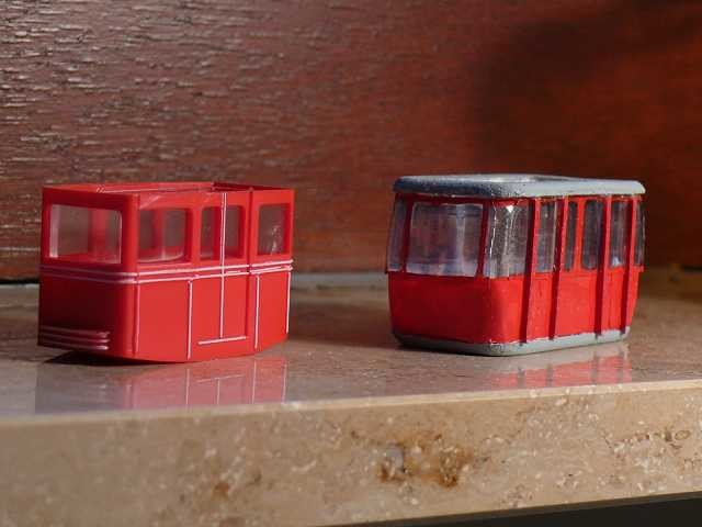 Dann ecken die Kabinen garantiert irgendwo an und man muss hier und da etwas wegschneiden/feilen. Ich denke da an den Befestigungssockel, wo die 4 Schrauben durchkommen und diesen breiten Fachwerk-Aufsteller für die Ausfahrtsschiene.