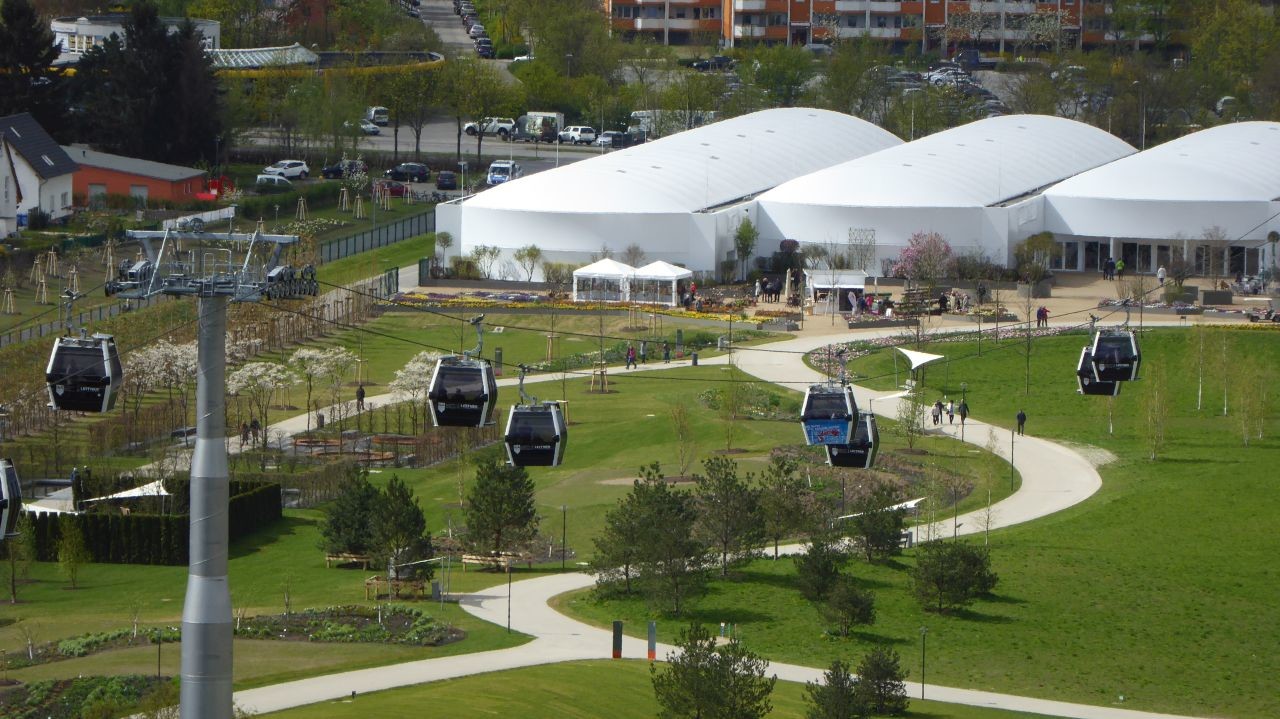 So, zum Abschluss noch ein paar Worte zur Zukunft der Bahn. Anders als in Rostock und München wird sie nicht ende des Jahres wieder abgebaut. Leitner hat sich verpflichtet sie noch mindestens drei Jahre weiter zu betreiben. Was danach passiert ist noch nicht klar, aber die Stimmung scheint schon jetzt eher pro Seilbahn zu sein. Und anders als in Koblenz droht hier auch keine UNESCO (und wir wissen ja wie gut die Drohungen in Koblenz gewirkt haben). Der Kienbergpark wird ab nächstem Jahr wieder öffentlich zugänglich sein, nur die, für die IGA vergrößerten, Gärten der Welt bleiben kostenpflichtig. Die Seilbahn liegt dann nicht mehr im umzäunten Bereich. Da die Gärten der Welt aber durch die IGA auch einen neuen Haupteingang bekommen haben und dieser in der Nähe der Seilbahn liegt, bietet sie sich auch weiterhin als Verbindung zur U-Bahn an. Es ist auch schon klar, dass die Fahrt im Eintritt zu den Gärten der Welt enthalten sein wird. Derzeit laufen noch die Verhandlungen zur Aufnahme in den normalen ÖV Tarif, ich hoffe mal das klappt. Der Kienberg bleibt auch weiterhin ein nettes Ausflugsziel, denn der Aussichtsturm soll ebenfalls erhalten bleiben, hoffentlich auch mit dem Café das sich an dessen Fuß befindet.