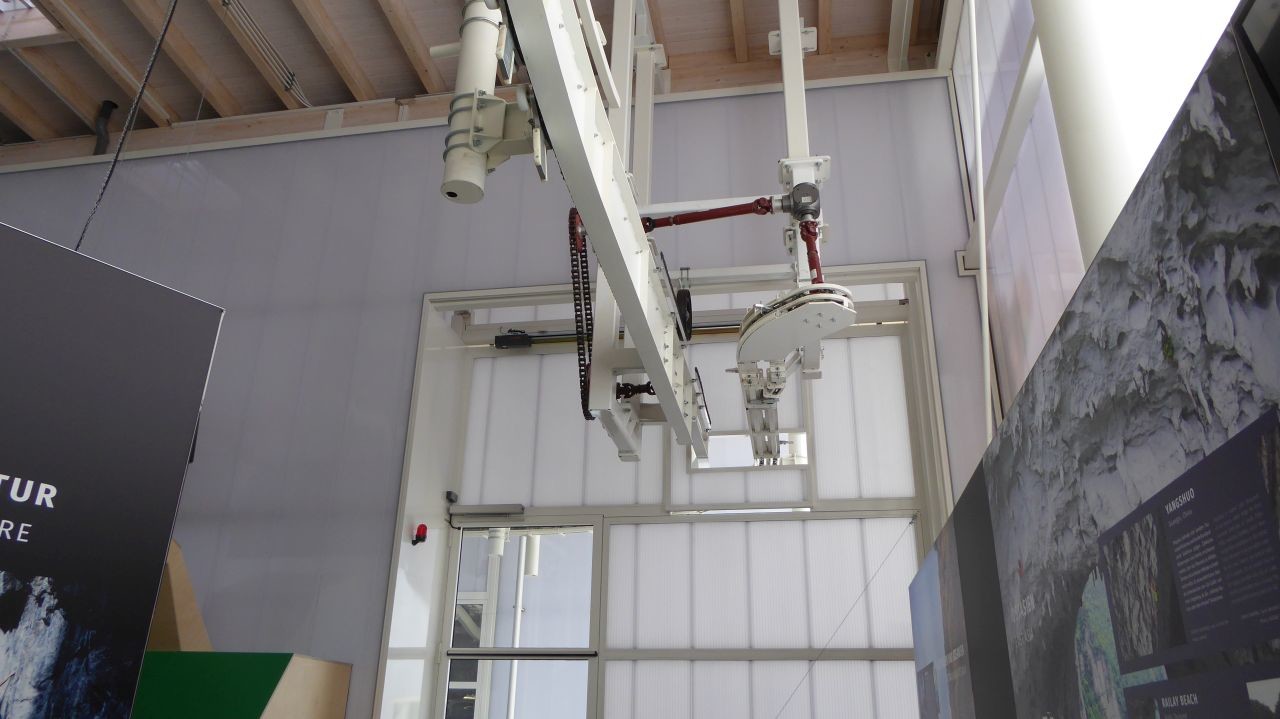Überrascht hat mich, dass es tatsächlich einen Bahnhof gibt. Es steht zwar auch auf der Homepage, ich hatte das bisher aber immer überlesen. An den Gärten der Welt ist dieser hinter der eigentlichen Station als Verlängerung angebaut. Es handelt sich aber um zwei Gebäude mit einer Lücke dazwischen die sich ein durchgehendes Dach teilen. Den Bahnhof hat man sehr geschickt gelöst. Er ist ungewöhnlich hoch und damit entstand darunter Platz für zwei Ausstellungsbereiche. Hier präsentieren sich die BUGA Gesellschaft und Leitner. Leitner hat eine schöne kleine Ausstellung über Klettergärten der Welt aufgebaut und informiert natürlich auch über urbane Seilbahnen und frühere Veranstaltungsbahnen. Für uns noch interessanter ist aber, dass man dadurch natürlich ganz einfach die Möglichkeit hat sich den Bahnhof von innen anzuschauen. Es handelt sich um einen Stichgleisbahnhof mit einem einzelnen Stichgleis das sich durch die ganze Halle schlängelt. Einen Wartungsstand gibt es hier nicht, der ist in der anderen Station. Dort hängt auch der Revisionskorb, Ersatzgondeln gibt es keine.