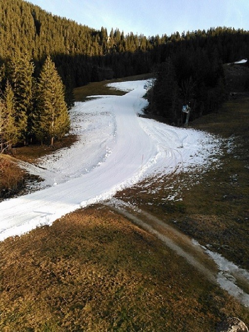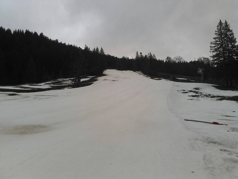 Kompakter Kunstschnee auf der Suttenpiste, vom Naturschnee ist nix mehr übrig. Verschoben wurde noch nix. Hauptproblem wird wohl (mal) wieder das Stück zwischen unterer- und oberer Suttenalm sein,falls es keinen Neuschnee gibt. Der untere und obere Teil der Piste mit satter Kunstschneeauflage, viel fehlt da nicht mehr.