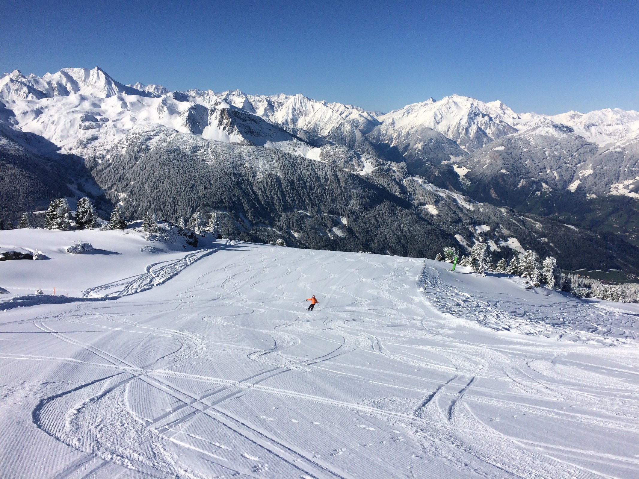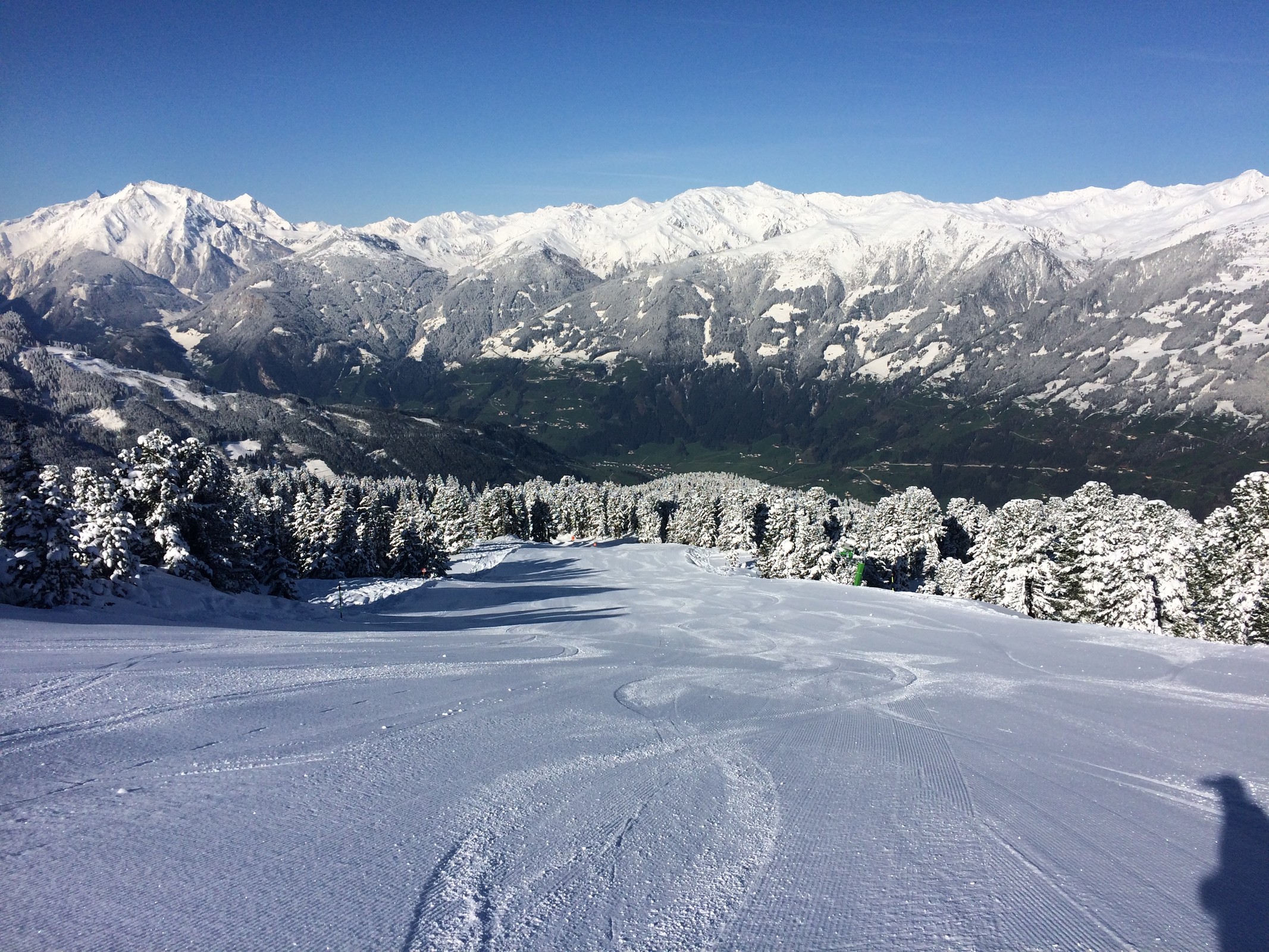 Heute war es genau umgekehrt: Rund um den Penken waren die Pisten tip top, am Rastkogel zu viel Neuschnee drauf. Insgesamt heute der deutlich bessere Tag: Wir starteten erst um 10 Uhr in Vorderlanersbach und ab 11 Uhr schien oder zumindest drückte stetig die Sonne und wir hatten gute Sicht.