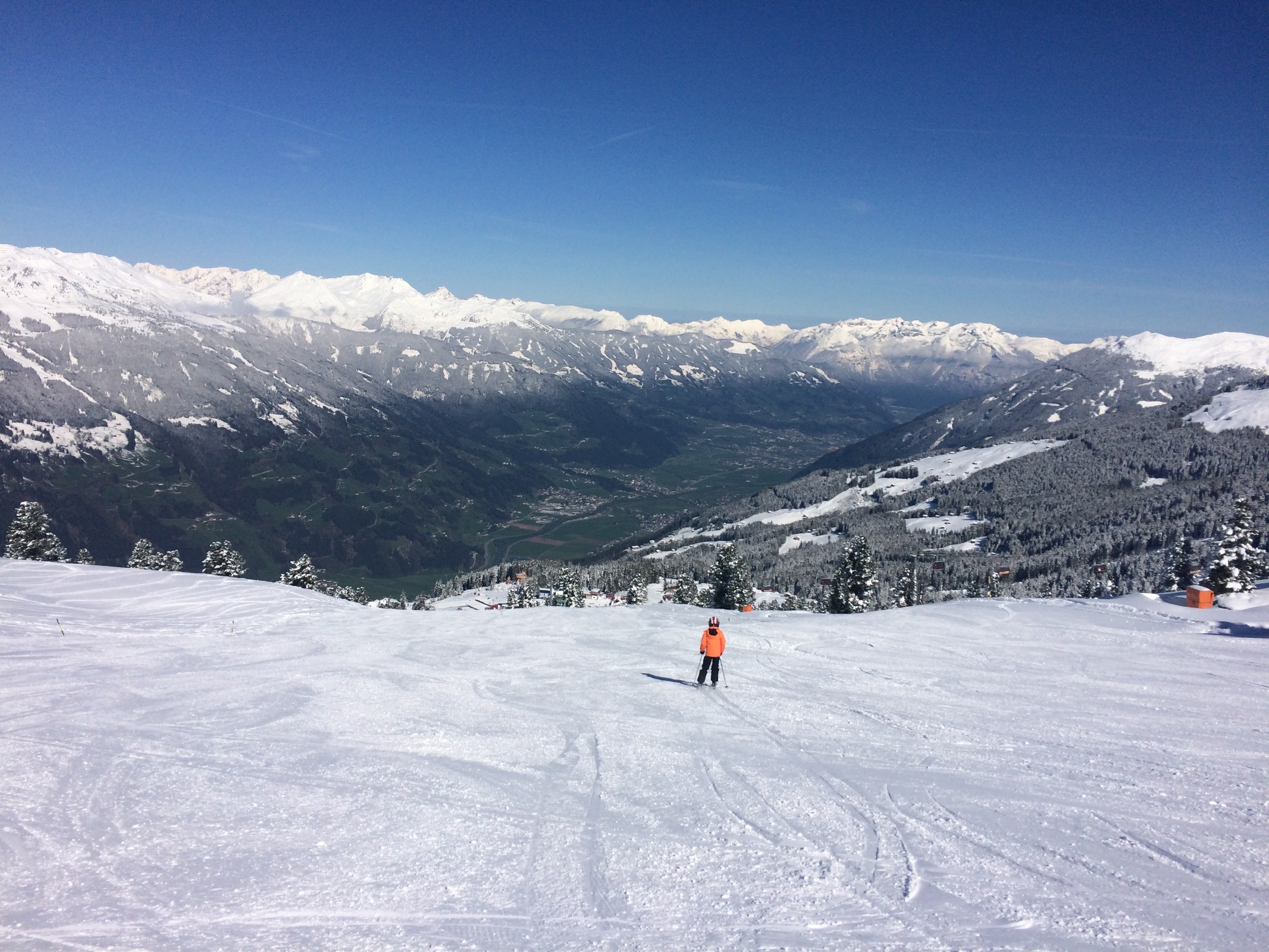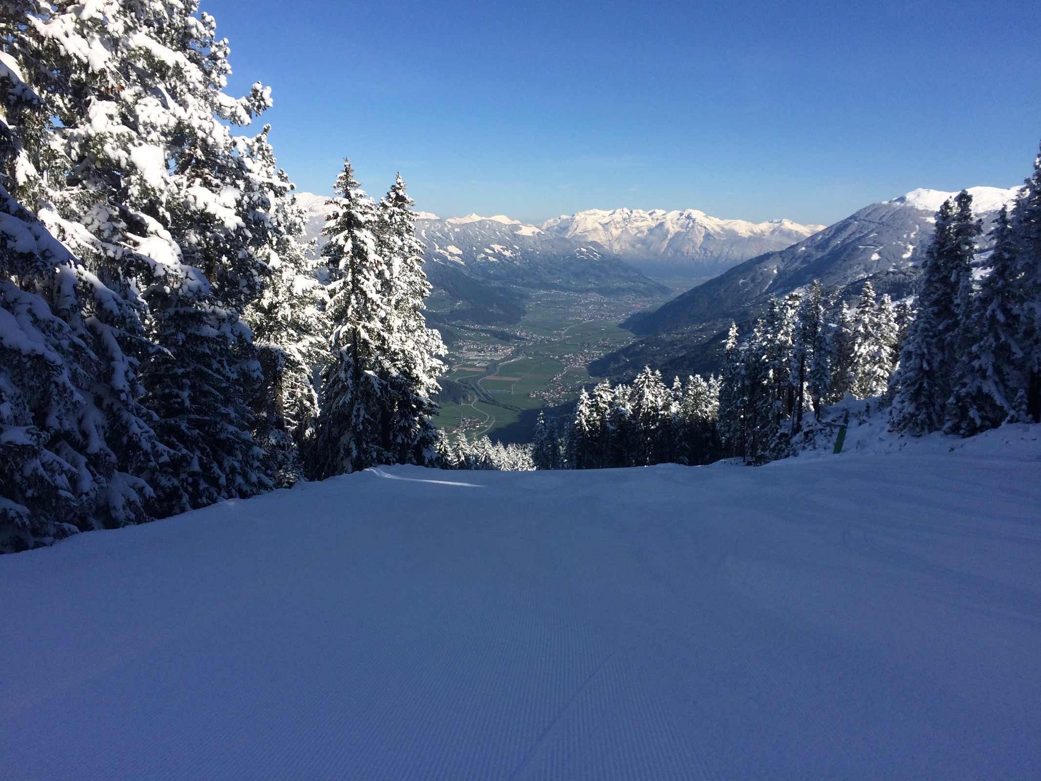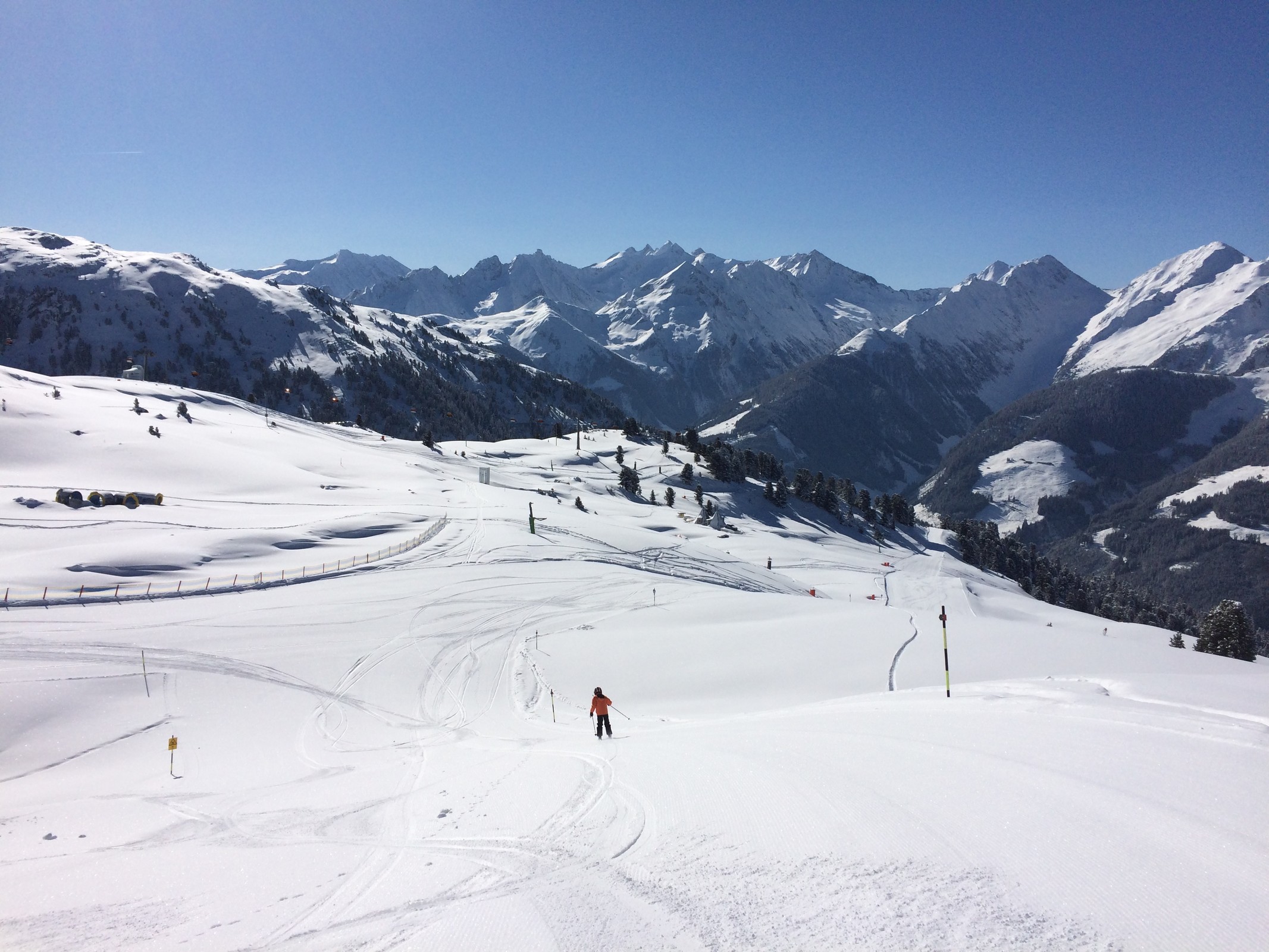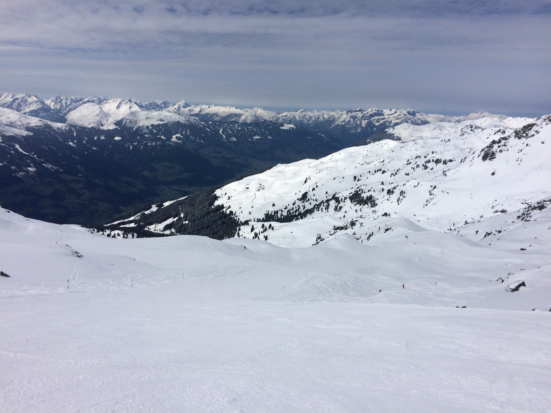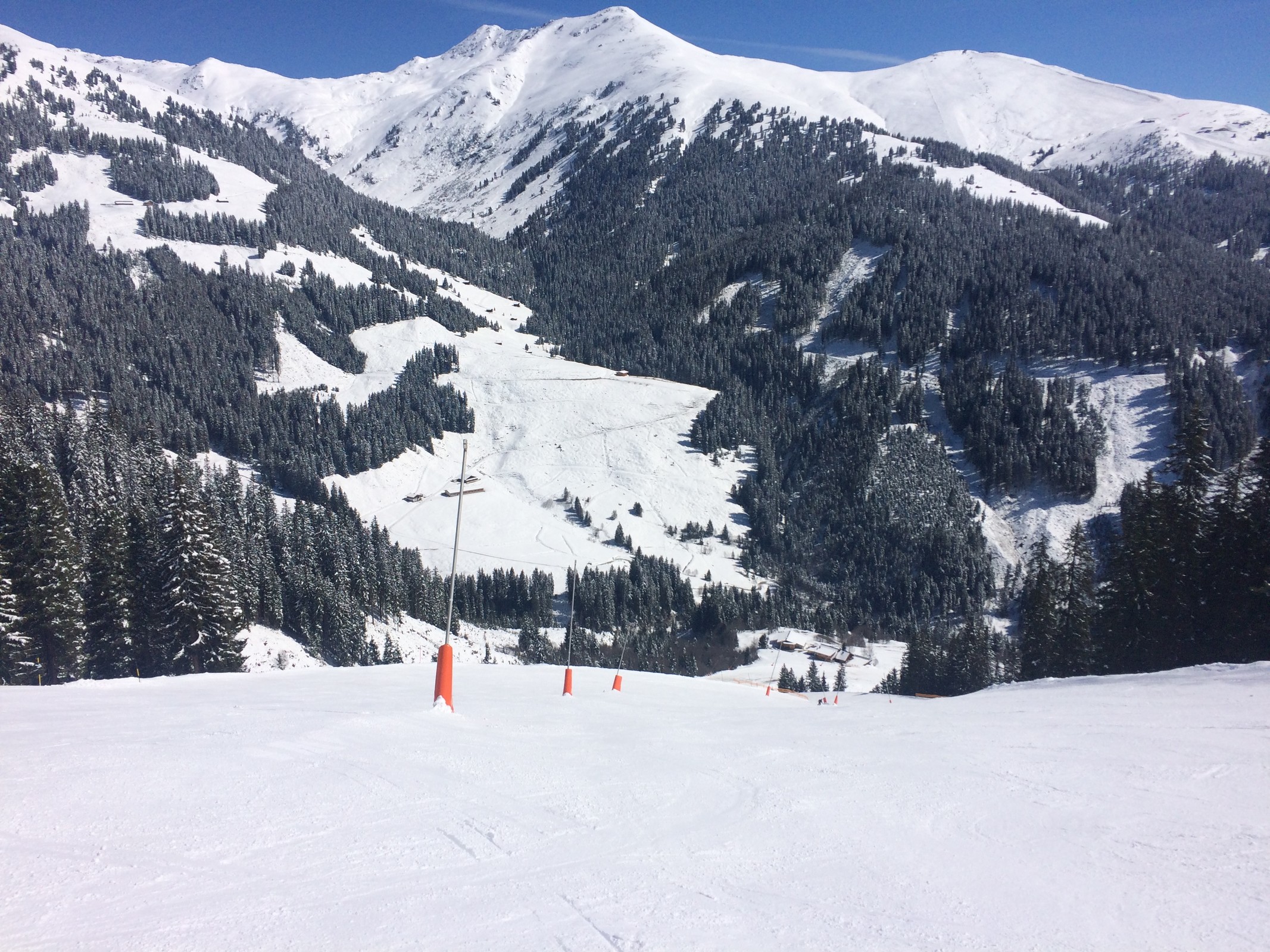 Die Abfahrt ins Krummbachtal hat zwar wenig Schnee und braune Stellen, ist aber viel besser als so oft, weder eisig noch verbuckelt. Fussalm so leer wie selten. Leider aber etwas härter. Generell kommen die Gerloser Pisten grad nicht an die Zeller ran.