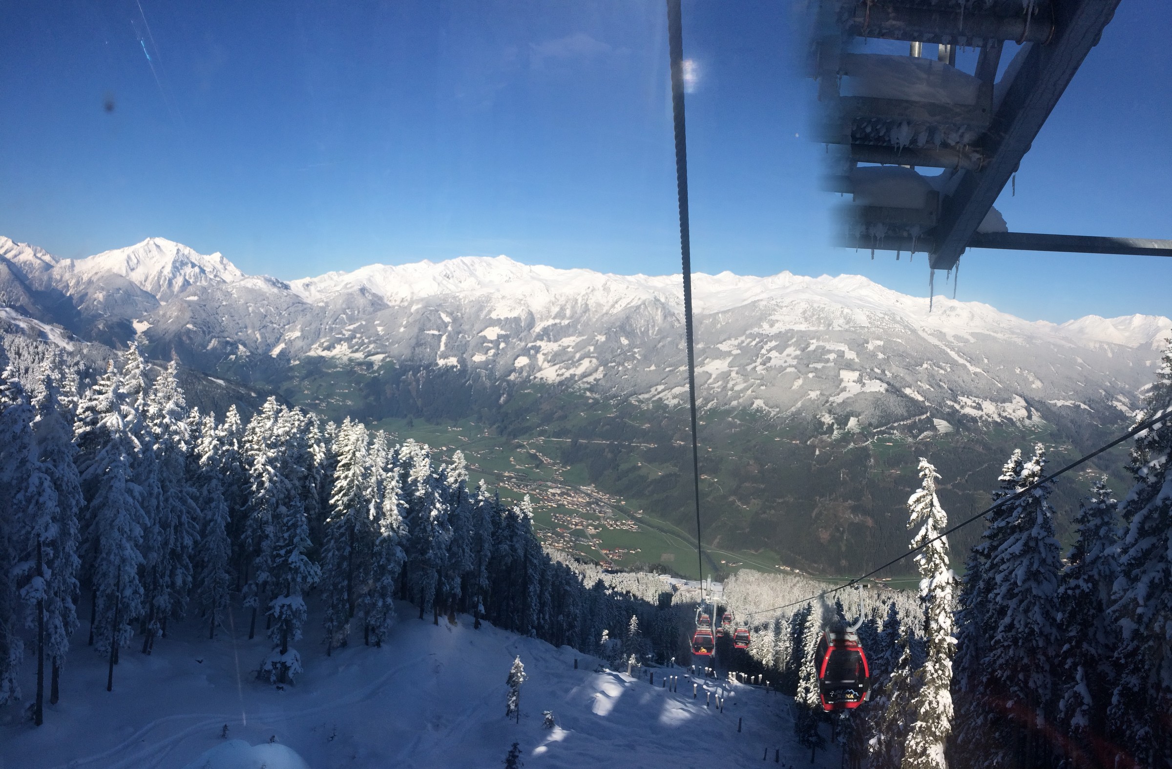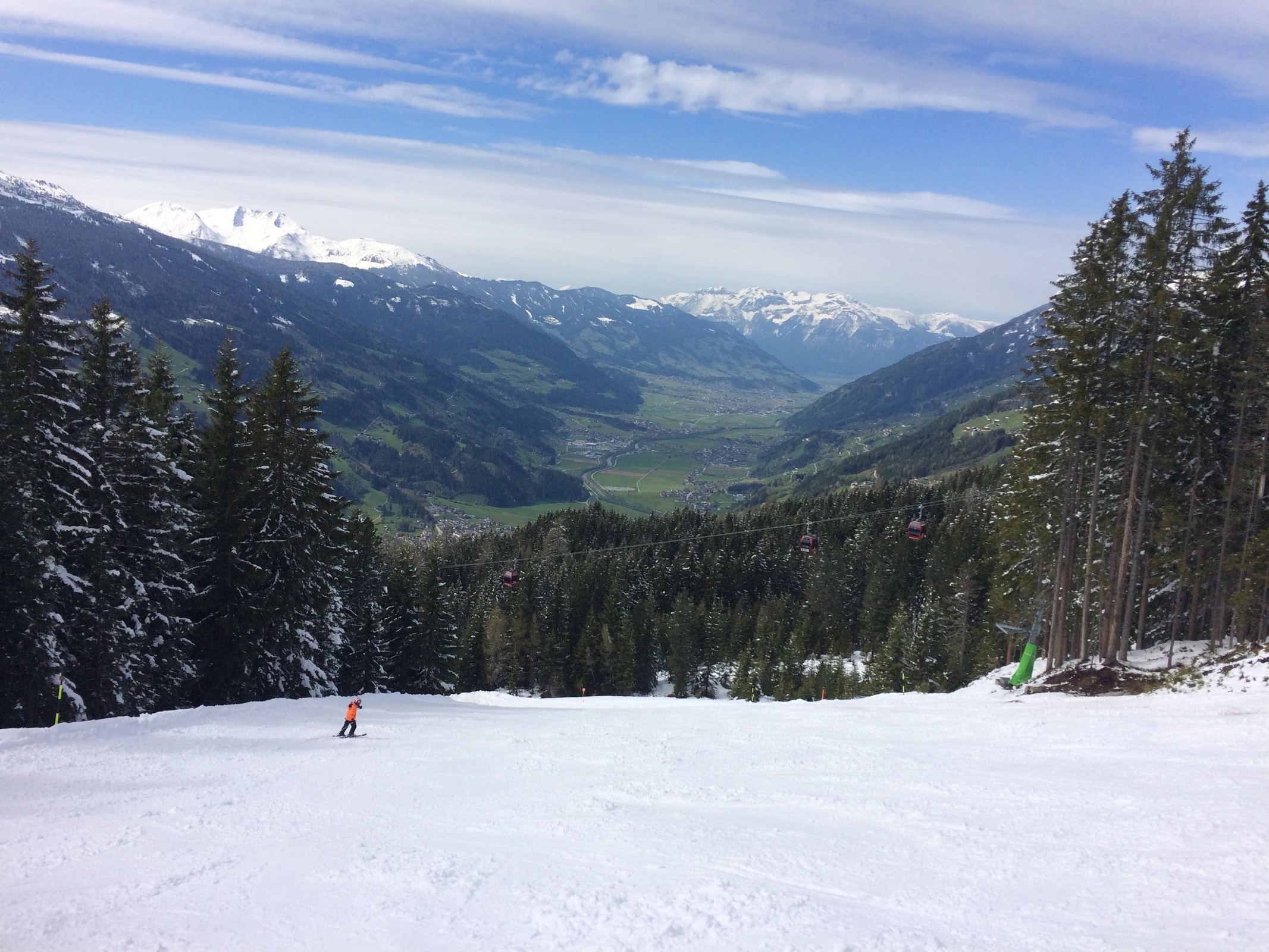Winterlicher Ausblick in Vorderlanersbach: In der Karspitzbahn. Winter am Berg, Frühling im Tal. Die Sportabfahrt bis auf die letzten zwei Hänge ein Traum. Der Schluss dann etwas hart aber problemlos. Wir fahren sie gleich 3x! Kreuzwiesen. Auch schön aber die Piste halt nichts besonderes: Auch die 14 perfekt zu Carven! Und leer. Nix los. Als wir um 8.20 Uhr an der Rosenalmbahn eintrafen, warteten dort viele Leute. Ich machte mir schon Sorgen. Aber offenbar kam nachher nichts nach.