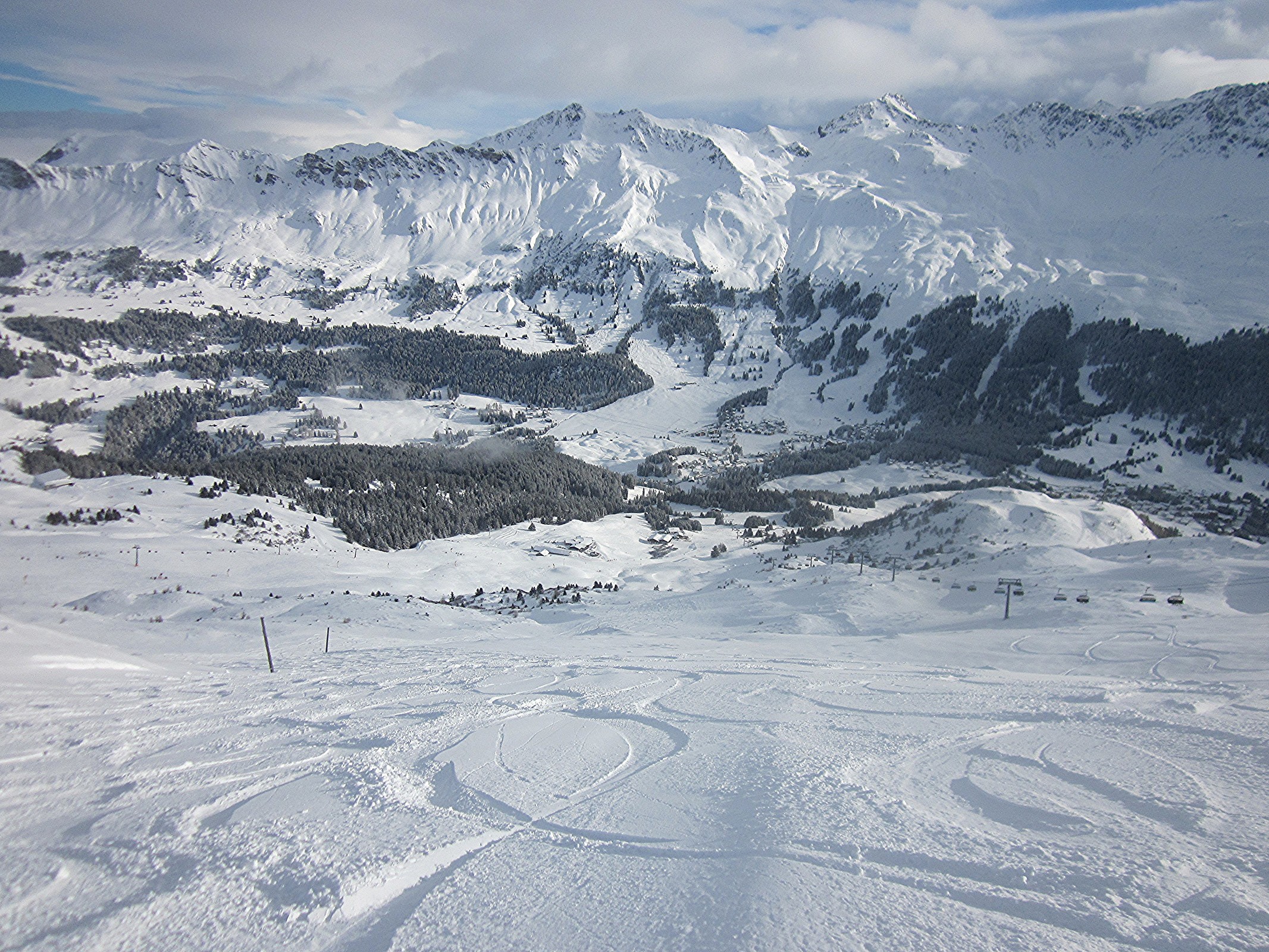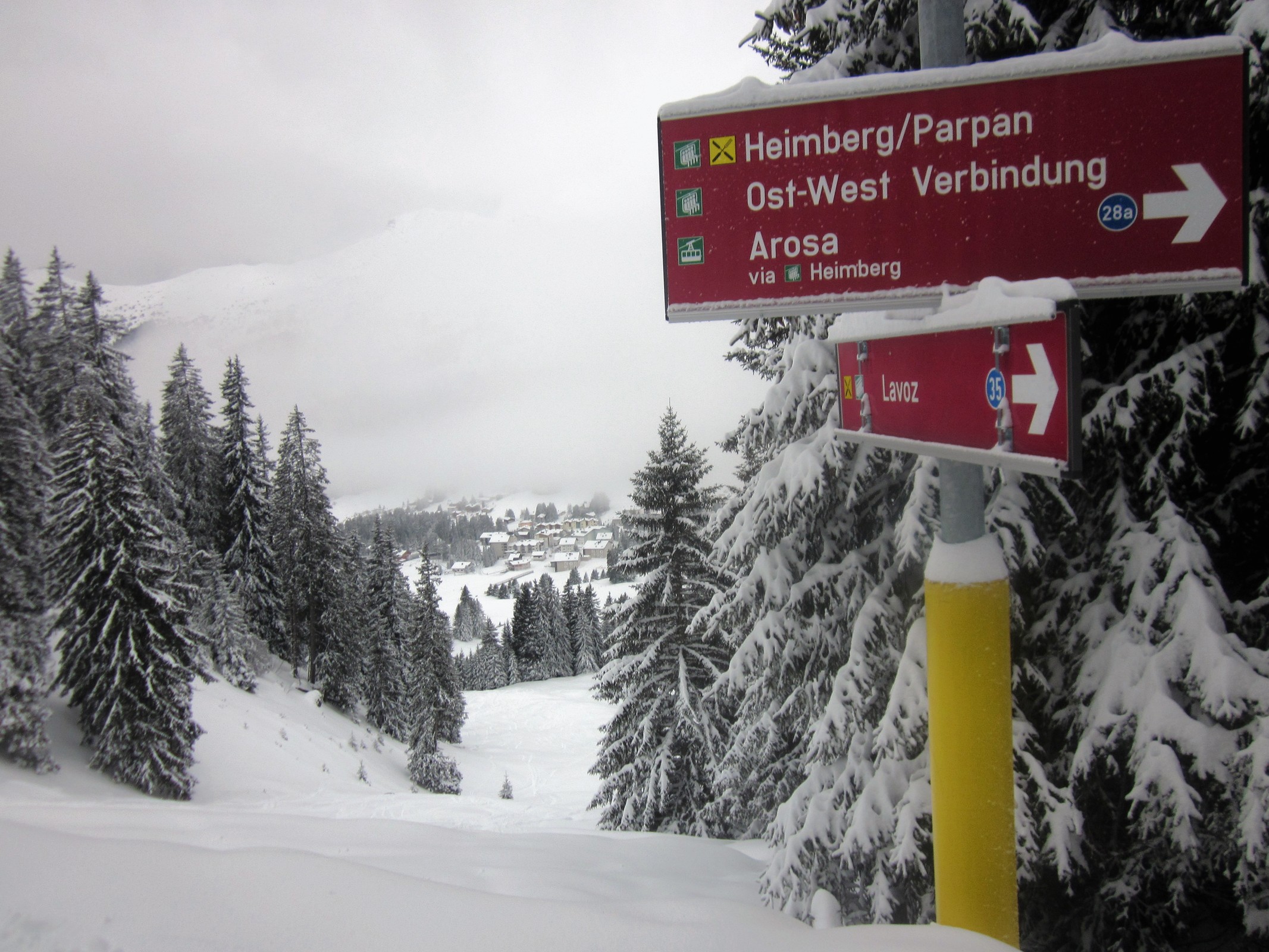 Ohne weiteres habe ich eine Vielfliegerprämie eingelöst und bin letzte Woche auf eine fünf-tägige Skireise abgereist. Für die ersten zwei Tage habe ich mich schließlich entschieden, eine Skiregion zu erkunden, worüber ich noch nie nachgedacht hatte: Arosa/Lenzerheide. Ich wusste nur, dass vor vier Jahren diese separaten Skigebiete durch eine Luftseilbahn miteinander verbunden wurden. Somit ist es zum richtigen Grossraumgebiet geworden. Nach der Landung in Zürich um 8:30 Uhr bin ich eine halbe Stunde später mit dem Mietwagen durch abwechselnd strömenden Regen und Schneegestöber in Richtung Osten losgefahren und trotz des schlechten Wetters gegen 11 Uhr im Skigebiet angekommen. Die Bedingungen waren nicht gut für Fotos -- niedrige Wolken, flaches Licht, leichter Schnee -- aber eine gute Gelegenheit die Skisaison zu starten. Am nächsten Morgen hat das Gebiet bis zu 25cm Neuschnee gemeldet. Während der ersten Stunde gab es einige Restwolken. Glücklicherweise hat sich gegen 10:30 der Himmel aufgeklärt: GAME ON!