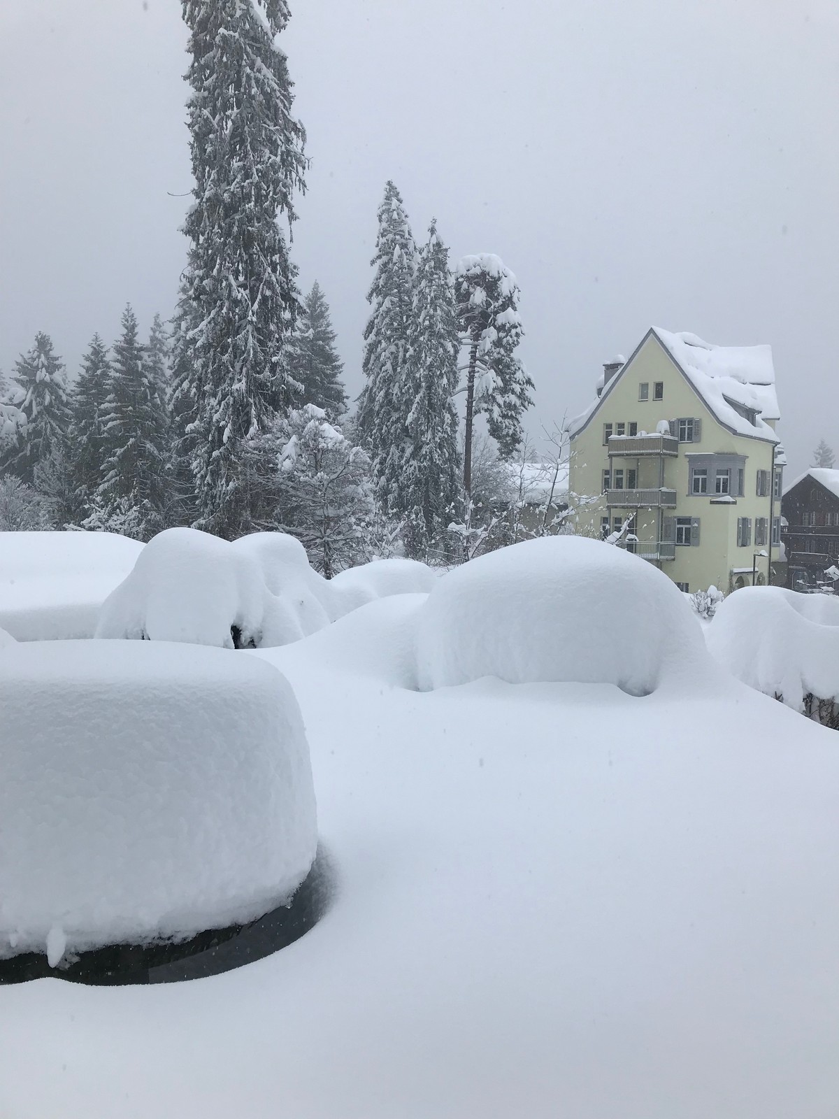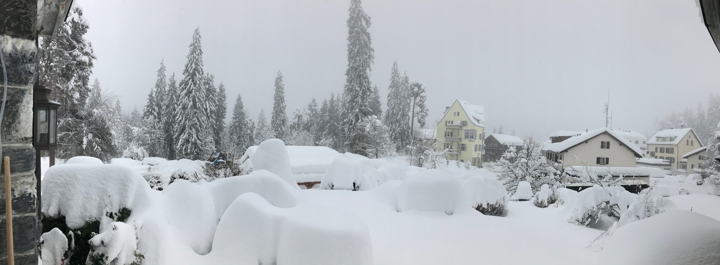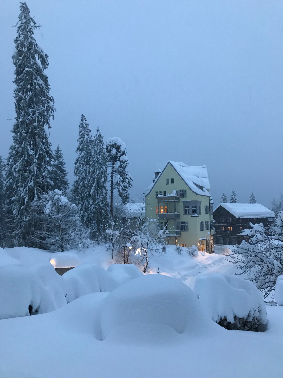 Es hätte schon ordentlich geschneit bevor wir Samstag arrivierten. Pünktlich nachdem wir einquartiert hatten, fing es dan neu an zu schneien. Wir genossen eine Abendwanderung in schon tief verschneites Flims