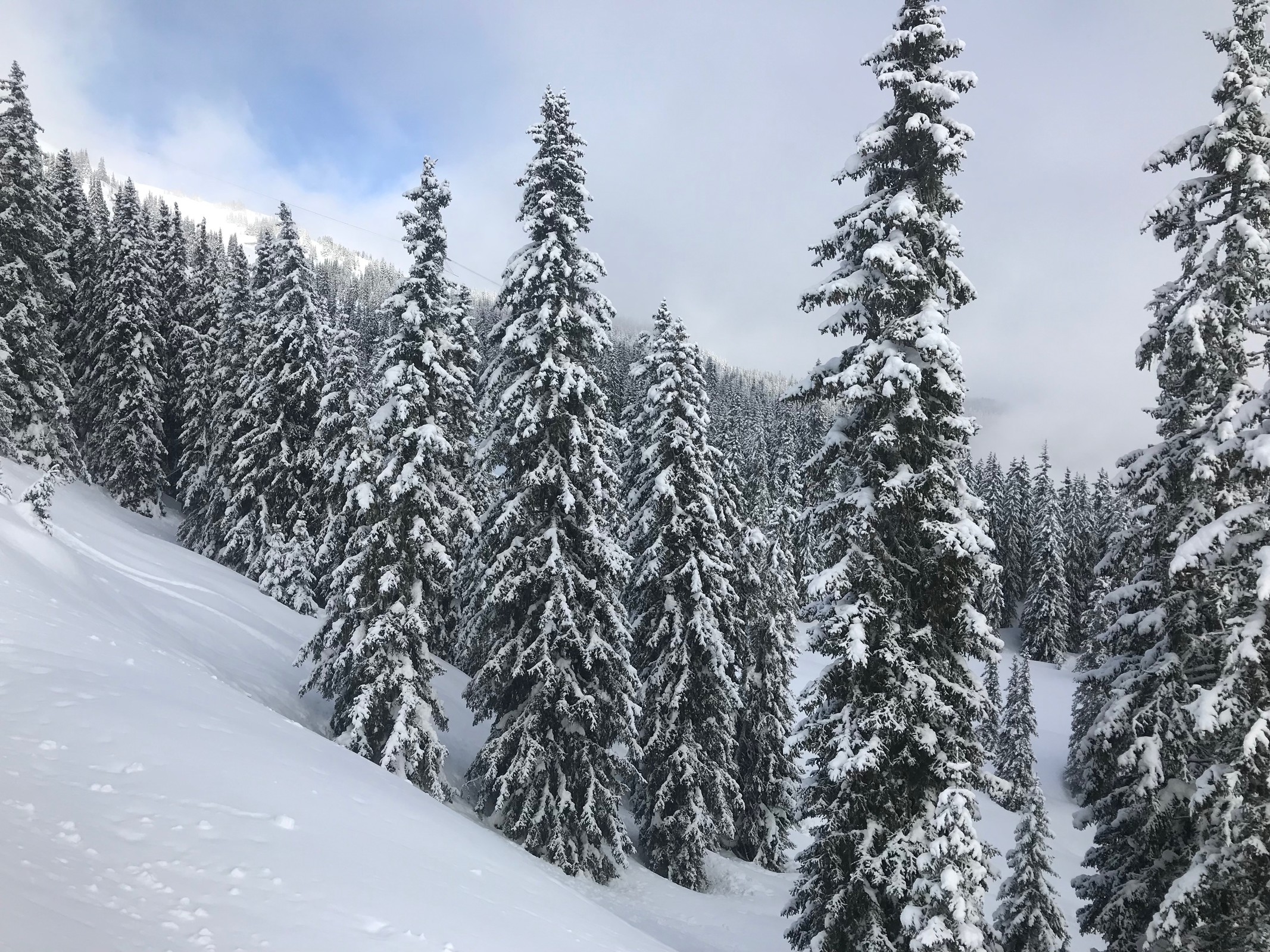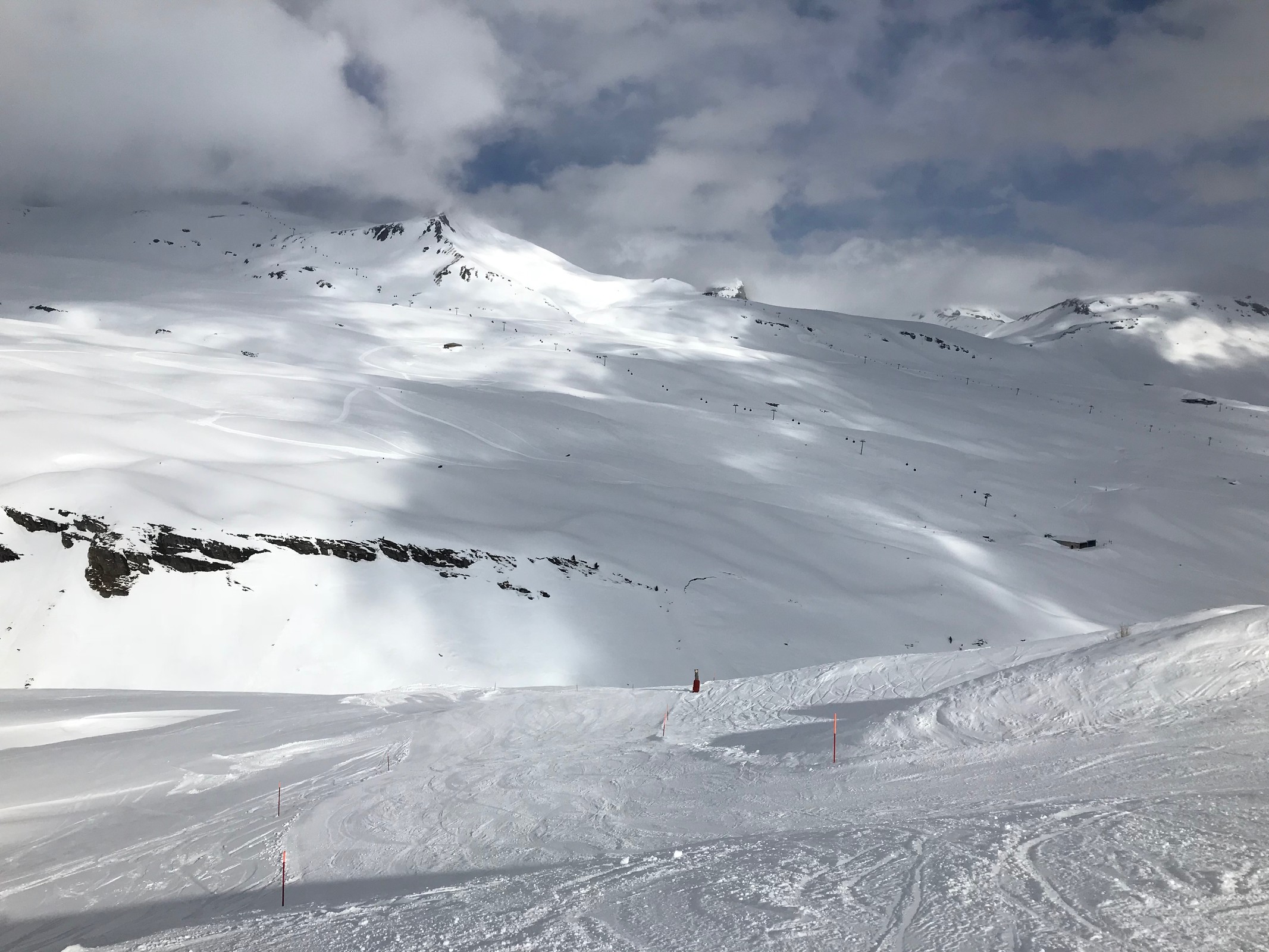 Dienstag schneite es zwar nicht mehr, es gab immer noch Wolken. Trotzdem sind wir im laufe des Morgens hoch gefahren und ziemlich schnell zeigte sich dann immer mehr die Sonne. Zum Glück hat die regen die Pisten nich all zu schlimm ramponiert. Und ab ca 1800 m war es einfach Neuschnee ohne ende.