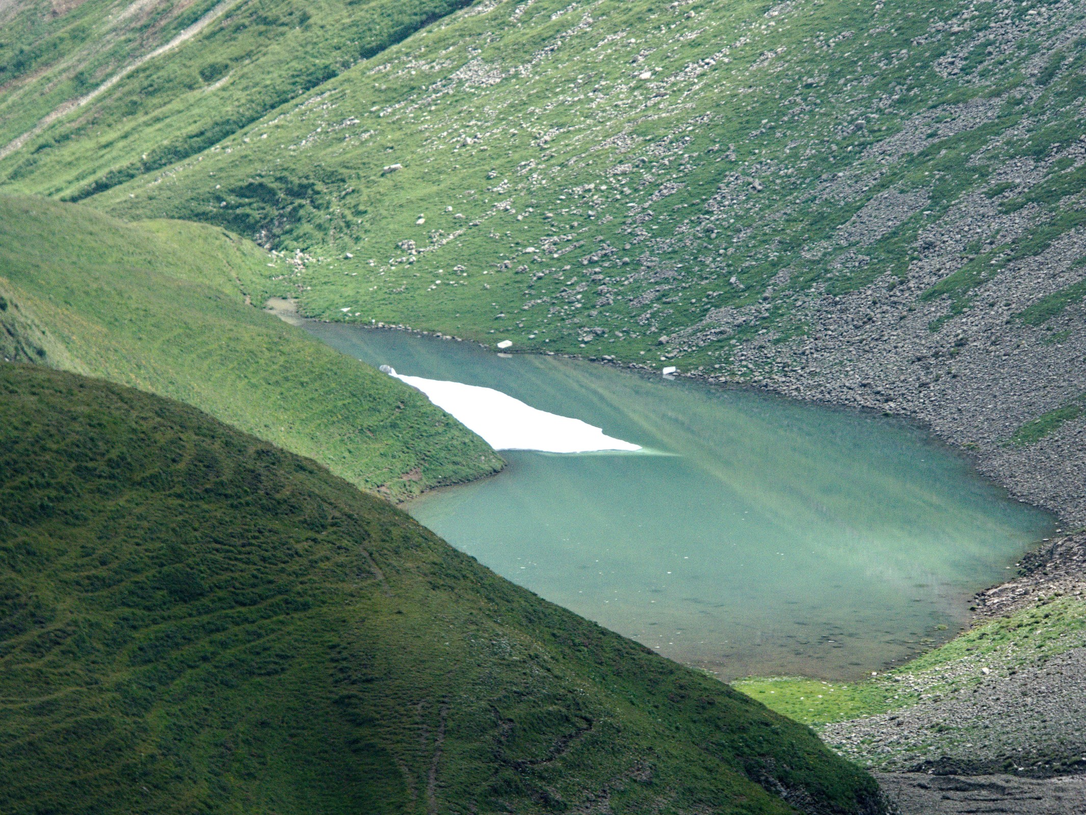 Eine Eisscholle treibt auf diesem Bergseelein.