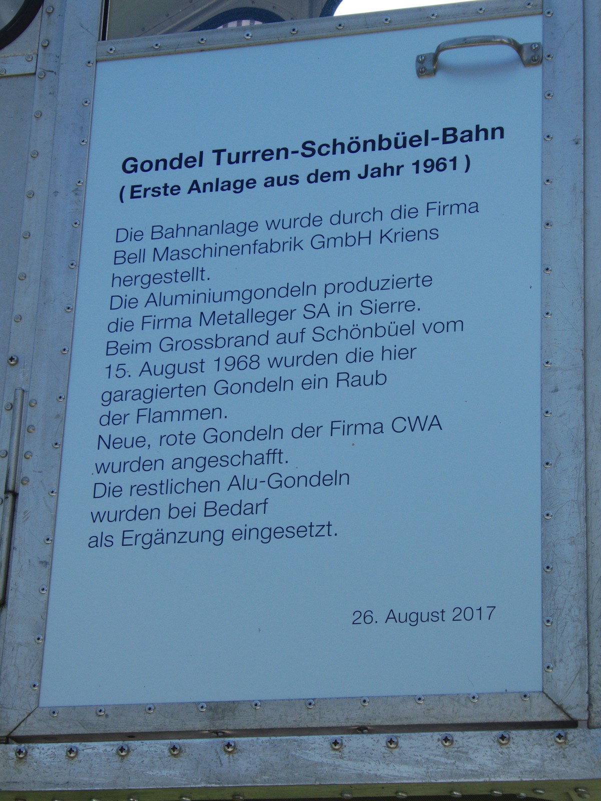 Bei der Station hängen die alten Kabinen und Seseln der alten Bahn nach Schönbüel. Auf ihnen sind Informationstafeln zur Bahn angebracht.