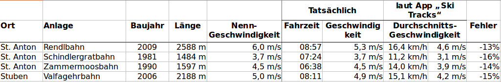 - GPS-Messungen mit dem Handy können ein völlig falsches Bild ergeben. Für die App „Ski Tracks“ konnte ich feststellen, dass sie systematisch eine deutlich zu geringe Liftgeschwindigkeit auswies. Details dazu in diesem Beitrag.