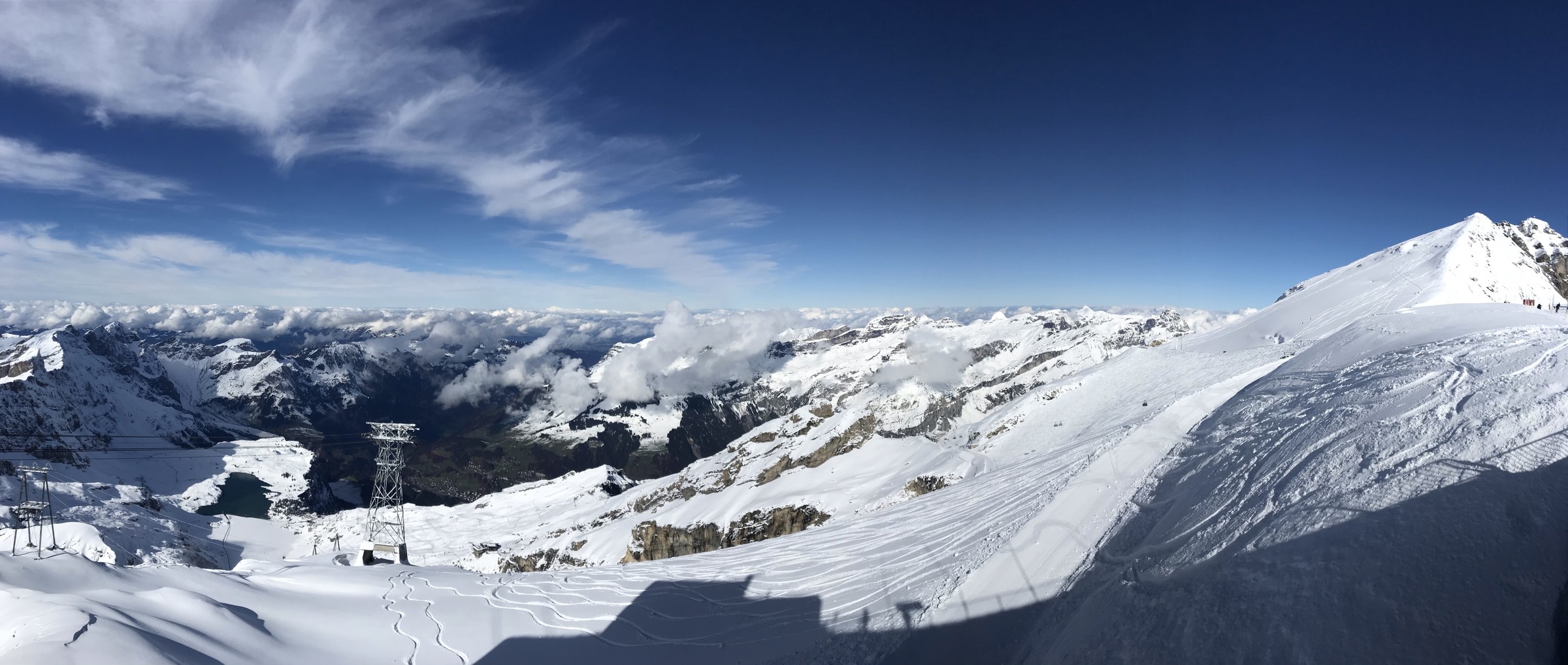 Bergfahrt um 10 Uhr (geöffnet wurde um 9.30 Uhr). Es hat schon weit runter geschneit: Aber die Schneedecke für eine Abfahrt bis Trübsee erachte ich als zu dünn: Eins muss man dem Titlis lassen: Die Aussicht ist phänomenal: Der Eindruck täuscht: Es ist wie üblich schlecht präpariert. Wobei ich heute nach den nächtlichen Niederschlägen Verständnis habe. Bei der ersten Fahrt am SL ist noch wenig los, später dann deutlich mehr, aber kein Problem. Die Piste rechts vom SL hält noch etwas besser: Die am Iceflyer hingegen ist rasch zerfurcht: Jetzt im Oktober mag die Sonne noch gut rein: Ein Besuch der Hängebrücke darf nicht fehlen. Blick zur Steilimni, wo ich letzten Frühling mit zwei Kollegen hochgetourt bin: Und den Berner 4000ern: Jetzt bei der Mittagspause im SB-Restaurant ist es richtig angenehm ohne die drängelnden Asiaten. Und es riecht auch viel besser.