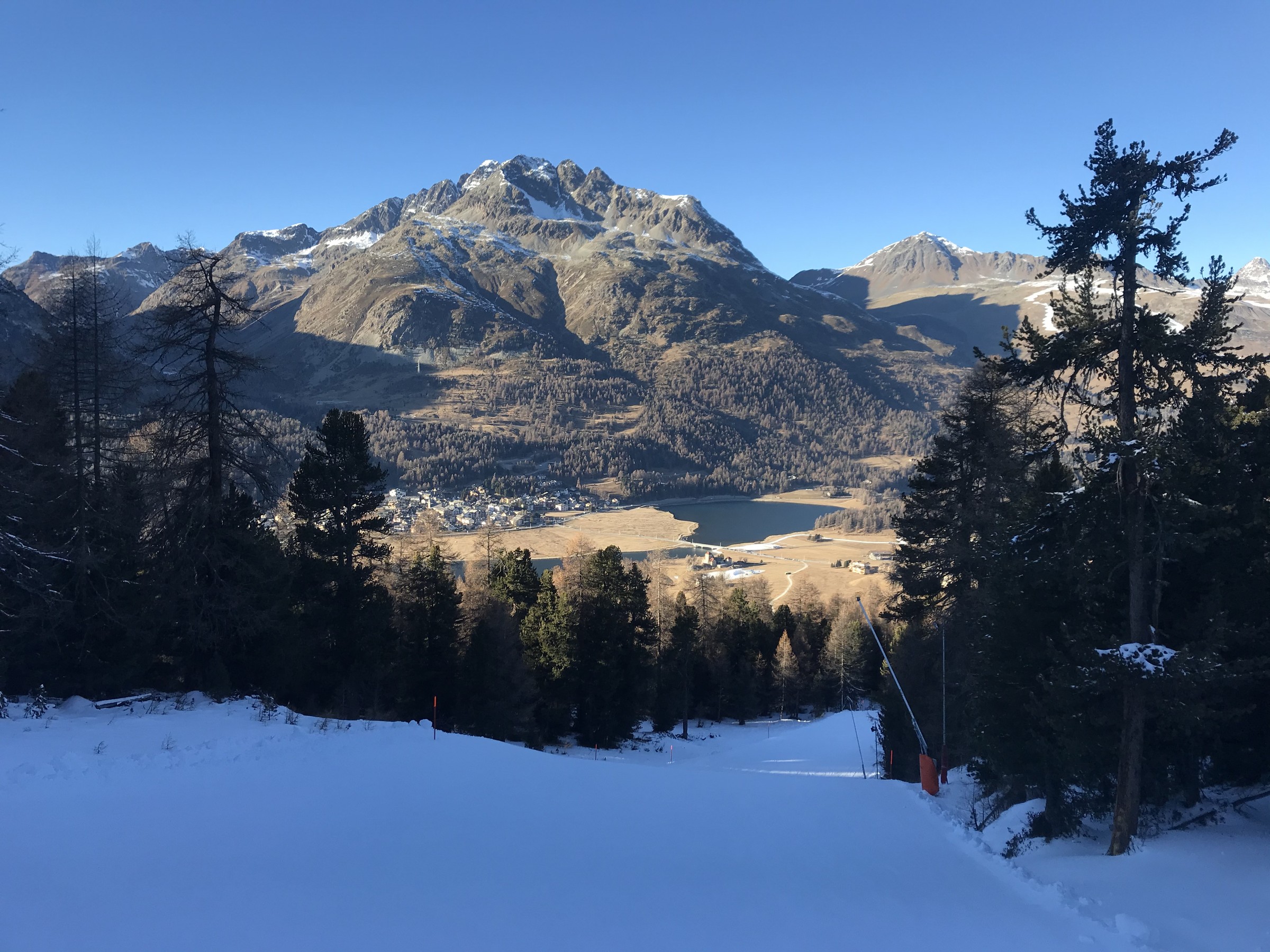 Richtung Alp Giop: Seeblick: Wirklich lohnend ist Alp Giop nicht. Wegen den doofen Skirennen ist da ja keine Piste offen. Die Salastrains-Piste sähe perfekt aus. Weiter geht’s zum Trais Fluors. Mein Lieblingshang ist noch nicht ganz bereit