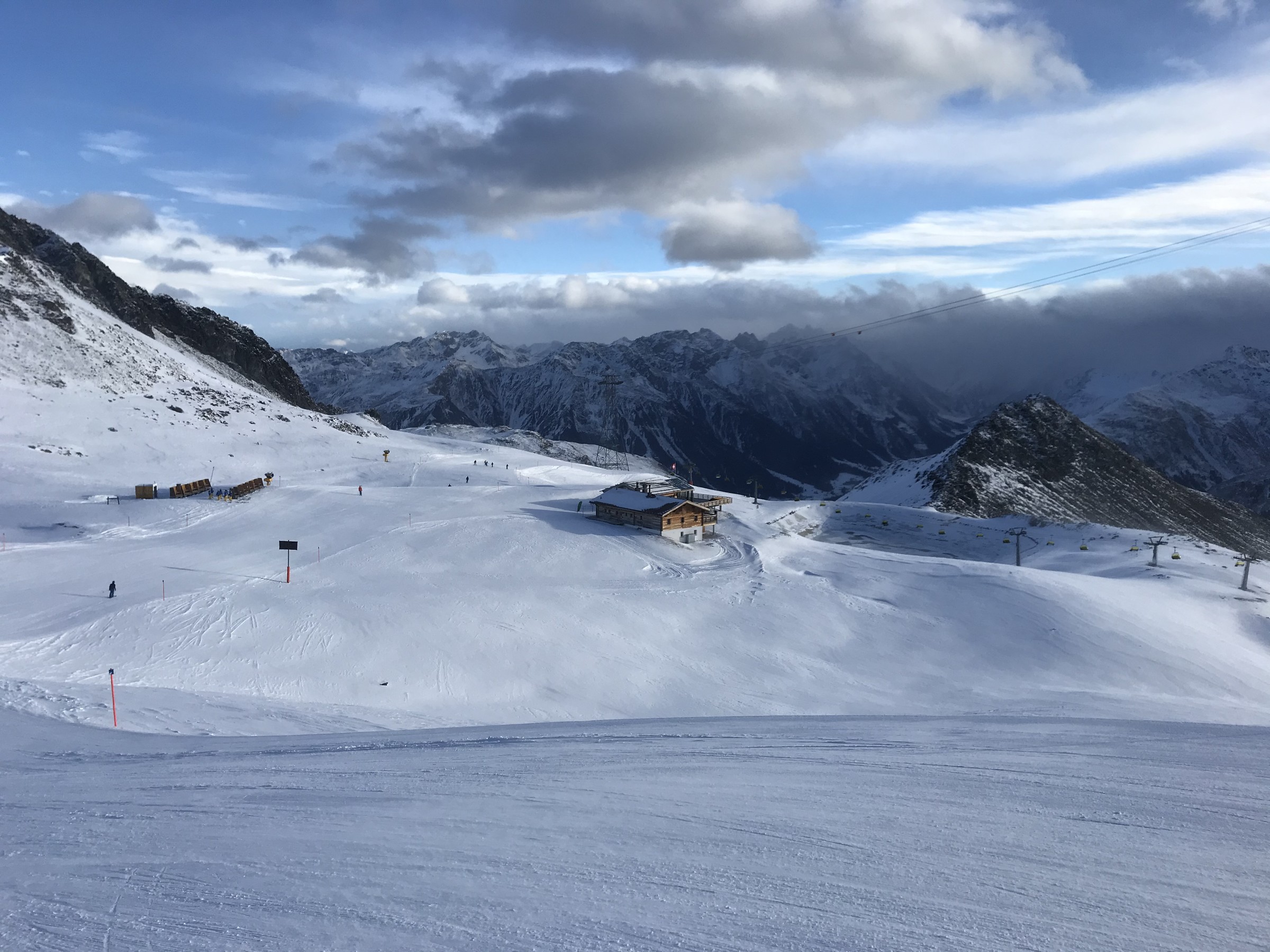 Gegen 15.30 Uhr hatten wir genug und wagten uns auf die noch nicht geöffnete Talabfahrt. Unverständlich, dass sie diese nicht grad richtig machen. Wenn die Zeit nach den Schneefällen zu kurz für eine perfekte Piste sein sollte, könnten sie ja trotzdem halbwegs gut präparieren und eine Tafel hinstellen, dass sie noch nicht den üblichen Anforderungen entspricht oder es so wie in Ischgl machen. Aber dieses Gemüse der Grundpräparierung zu hinterlassen, naja... schon eine etwas schwache Leistung... Obwohl, viel besser ist es auf dem Stubaier ja schon im Normalfall auch nicht ;-). Den Spuren nach sind unzählige Leute runtergefahren und wir überholten auch einige, die da sichtlich ge- oder überfordert waren.