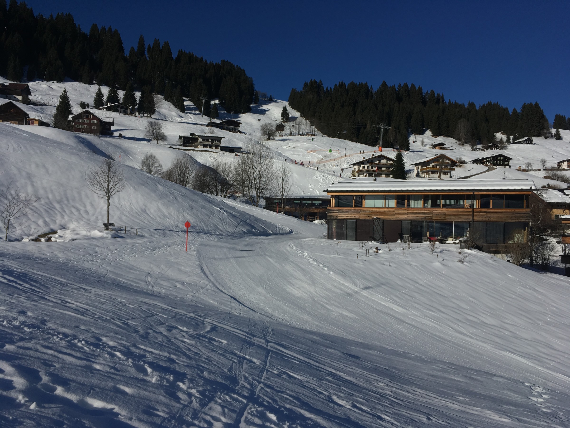 Seitenblick zur sehr netten Alternativ-Piste am Schlößle, führt idyllisch trassiert direkt am Haus entlang. Dahinter die 4KSB Heuberg, wo es doch schon ziemlich wuselt...