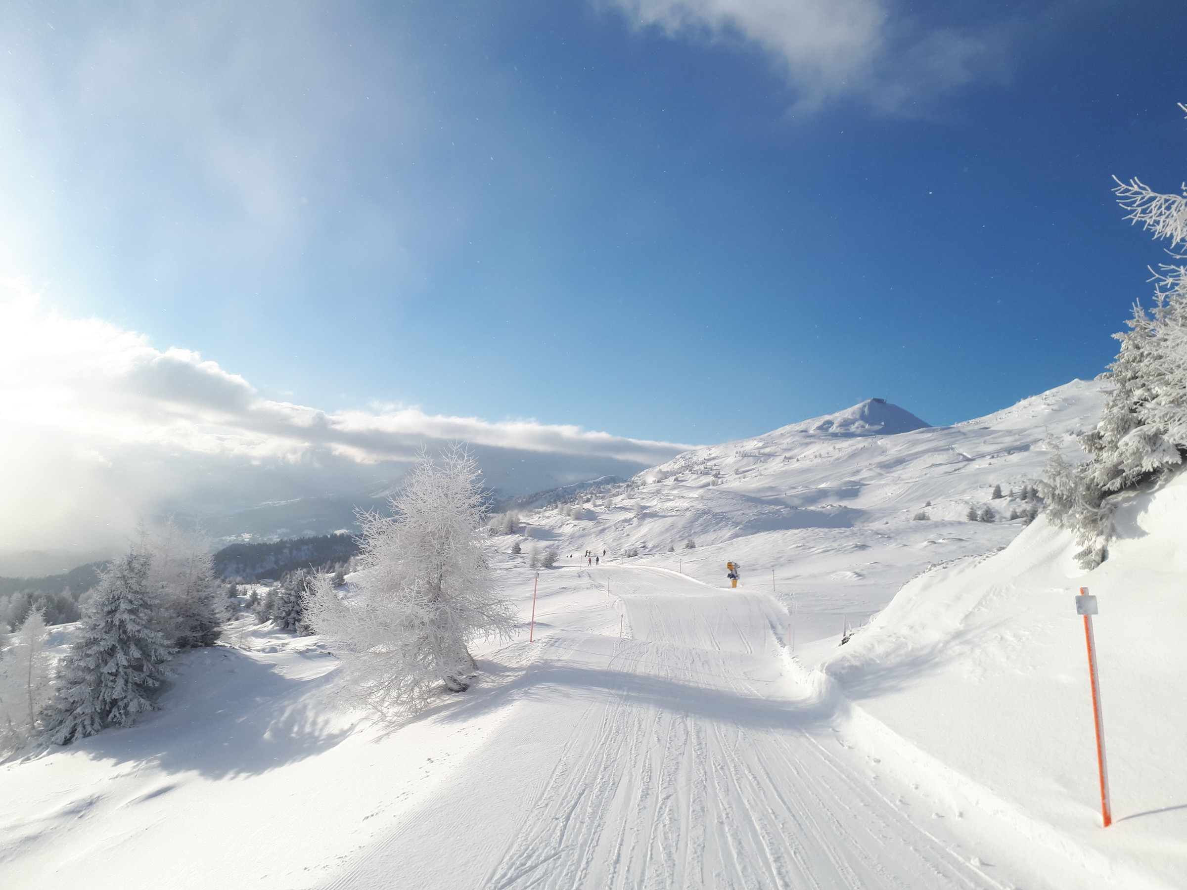 Heute ein malerische Wechselspiel aus tief verschneiter Winterlandschaft und Sonnenschein! Die Pisten sind sehr gut zu fahren.