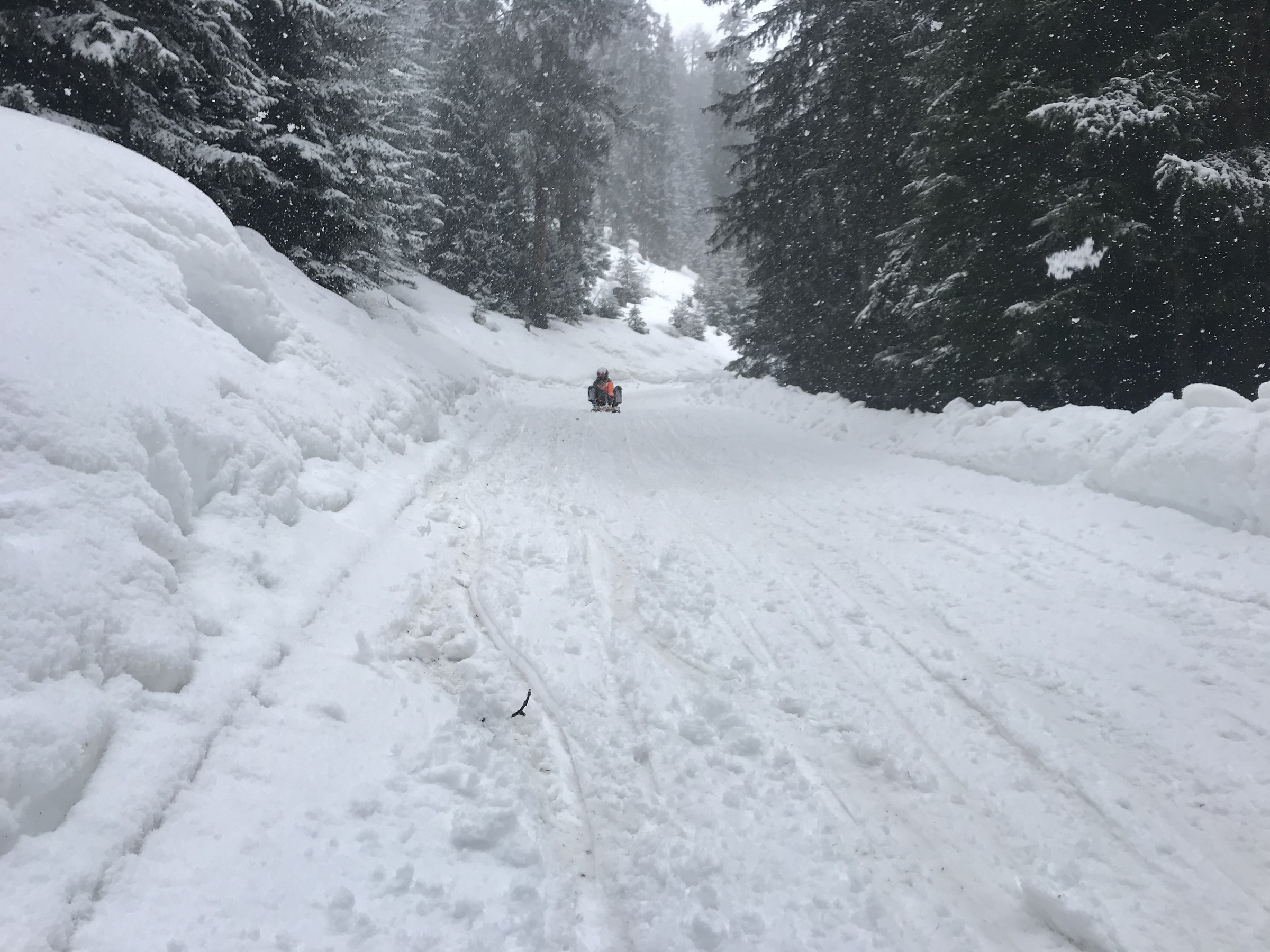 Uns war es zu grauslig zum Skifahren, aber Schlitteln ist immer wieder eine tolle Schlechtwetteralternative. Mit dem Zug fuhren wir von Reichenau (gäbiges Park&Ride mit Parkingpay) nach Preda, übernahmen dort den einen reservierten Rennrodel und machten uns auf den Fussmarsch bis zum Beginn der Schlittelbahn. Der Stiga meines Sohnes mochte in den weichen Verhältnissen nicht so richtig in Schwung zu kommen. So wechselten wir uns mit dem Rennrodel und Stiga ab.
