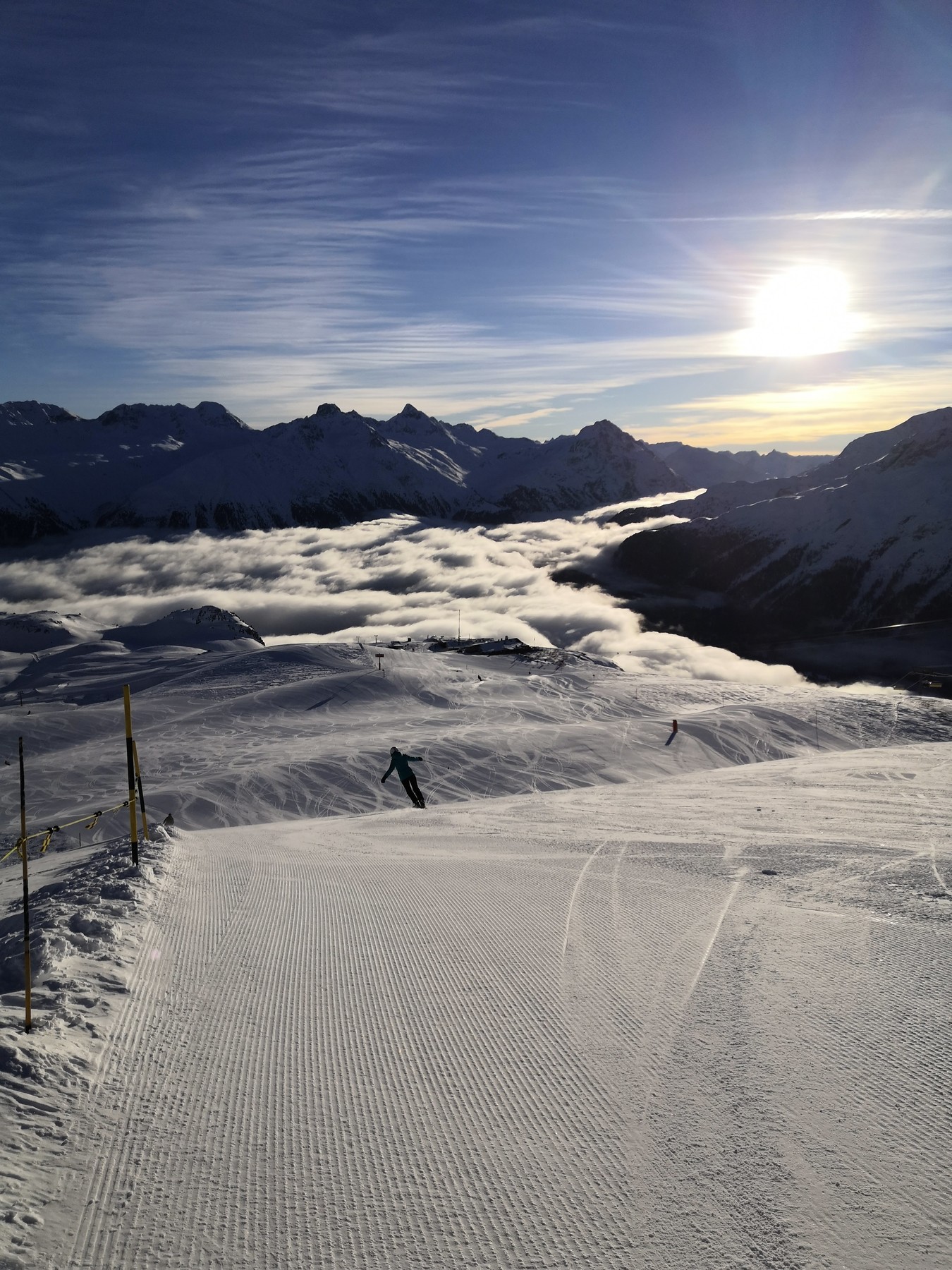 Dann traversierten bis nach Celerina hinüber und stiegen ins Auto in Richtung Diavolezza, denn wir wollten unbedingt noch die Gletscher-Abfahrt machen diese Woche. Bereits am Dienstag wollten wir das. Damals checkten wir zuerst zuhause, ob sie offen war, war sie. Auch an der Talstation war sie noch offen markiert, jedoch wurde sie als wir in der Bergstation ankamen wegen des Nebels geschlossen. Heute gab es jedoch keine Probleme und wir fuhren sie direkt. Ich hatte sie noch nie gemacht und freute mich umso mehr darauf.
