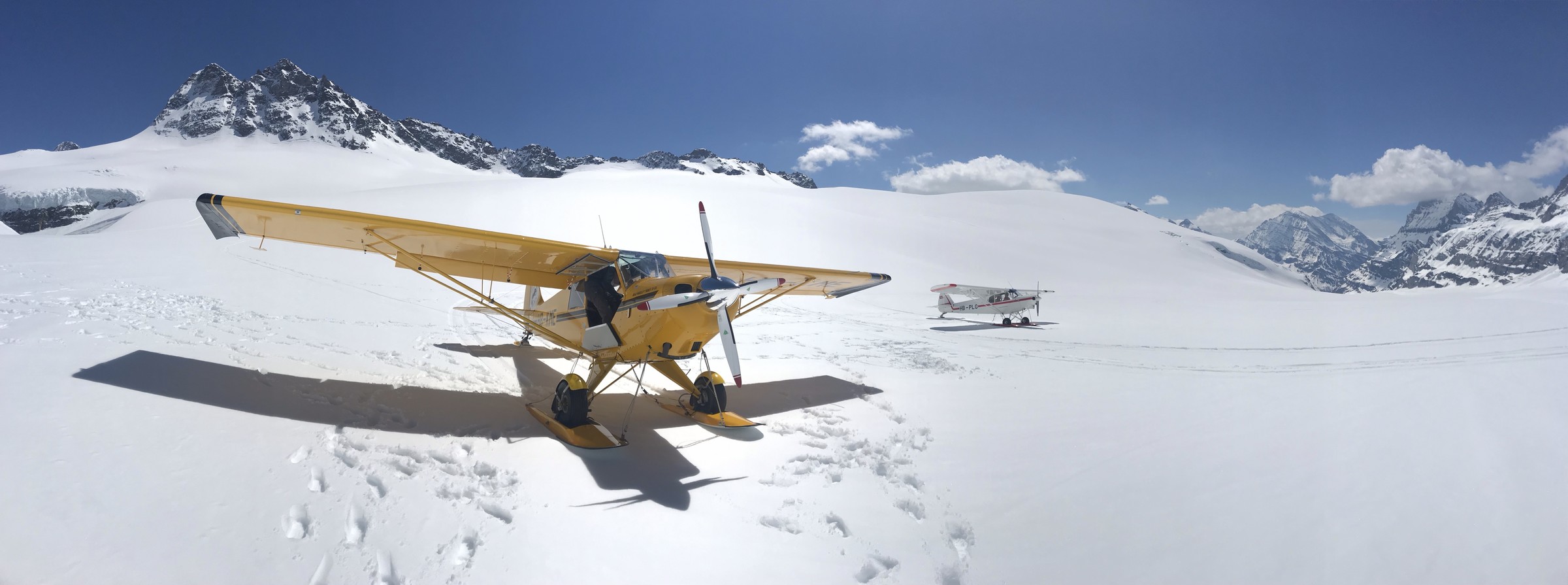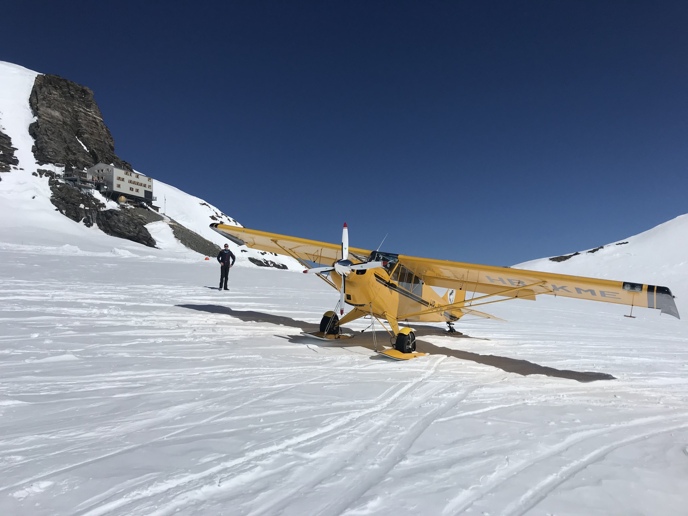 Zum Schluss gönnen wir uns auf dem Heimweg noch kurz eine Landung auf dem Petersgrat Süd, wo wir von zwei Kollegenflugzeugen beobachtet werden: An Eiger, Mönch und Jungfrau vorbei geht es nach Hause mit insgesamt 13 weiteren Gletscherlandungen. Toll war es!