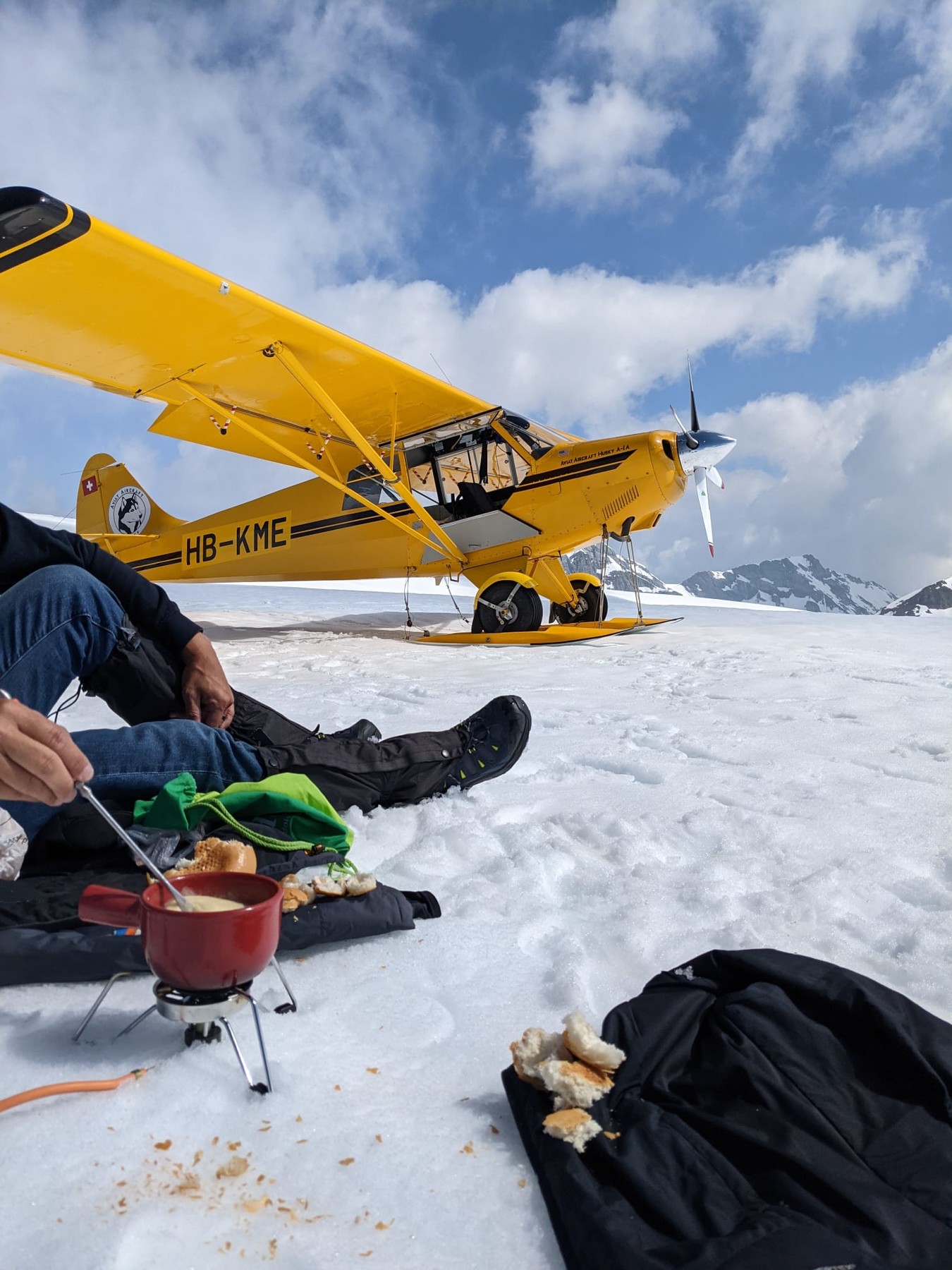 Obwohl der SW-Wind heute deutlich auffrischte, hatte ich mit einem weiteren Passagier nochmal einen Flug. Erneut ging es auf den Hüfifirn und zusätzlich noch auf den Glärnisch. An einer windgeschützen Landestelle konnten wir sogar ein Fondue zum Znüni essen:
