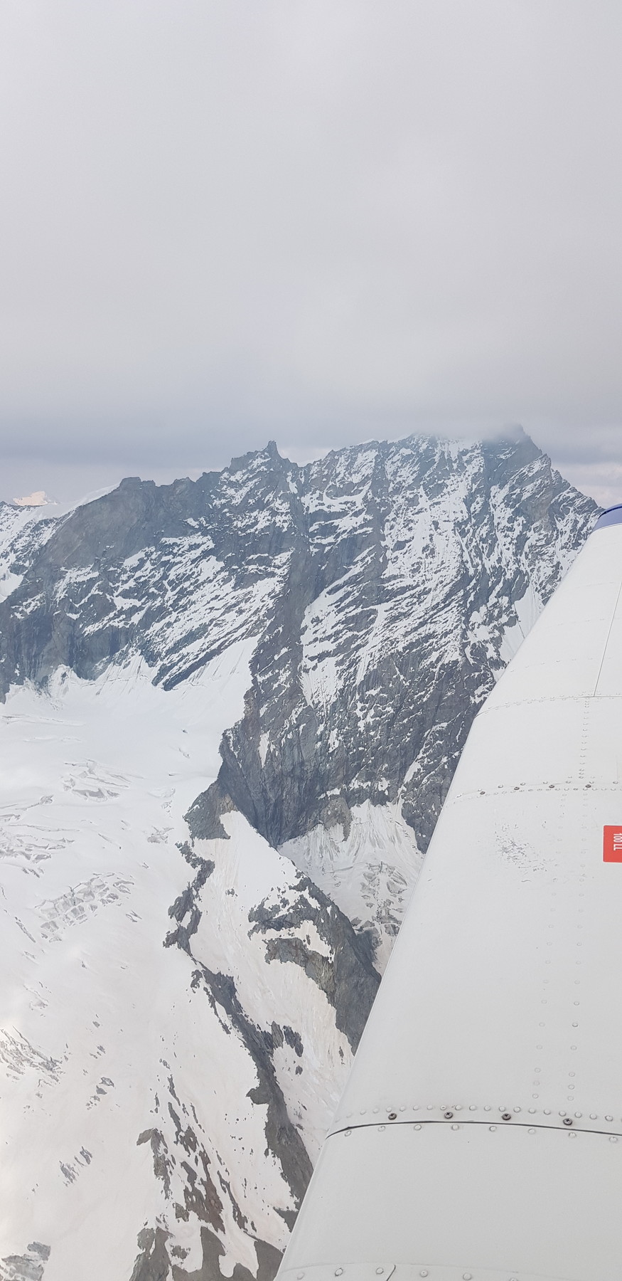 Über den Sarnersee ging es zunächst Richtung Meiringen-Hasliberg und Grimselpass mit Blick auf die Aarestauseen und -gletscher westlich und dem Rhonegletscher östlich ins obere Rhonetal. Von dort Rhone abwärts mit den Alpdörfern am Aletsch im Norden und em Blick zum Simplon im Süden stiegen wir langsam aber stetig weiter in die Höhe. Kurz hinter Brig drehten wir weiter nach Süden und hatten das Saastal mit Mattmarkdamm, Skigebiet und nicht zuletzt auch dem Dom linkerhand und die Weißhorngruppe rechterhand, um mittig auf das Matterhorn zuzusteuern. War die Bergwelt der 4.000er der Schweiz ohnehin schon beeindruckend, merkte ich dann auch, dass wir in einem kleinen Flugzeug unterwegs war, denn das Weißhorn (wie Chrigel meinte) versorgte uns in diesem Abschnitt mit einigen Turbulenzen. Der Matterhorngipfel war hier auch noch hinter den Wolken verborgen, die wir auf rund 4.000m Höhe unterflogen.
