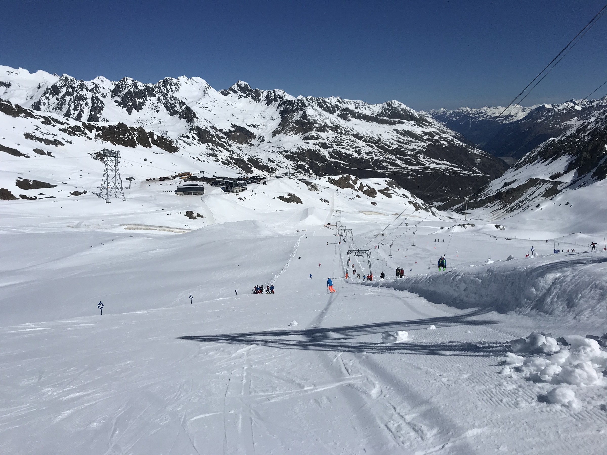 Die Ibex ist, wie alle anderen Pisten auch, noch recht hart aber mit guten Kanten griffig. Eine heisse Schoko (passend zu meinem Frühstücks-Lunchpaket aus dem Hotel) gibt’s auch hier nur gegen Impfausweis (oä.). Der Fernerlift ist für gar nix. Nöderjoch lohnt sich eher: Blick nach Süden: Edit 11.15 Uhr: