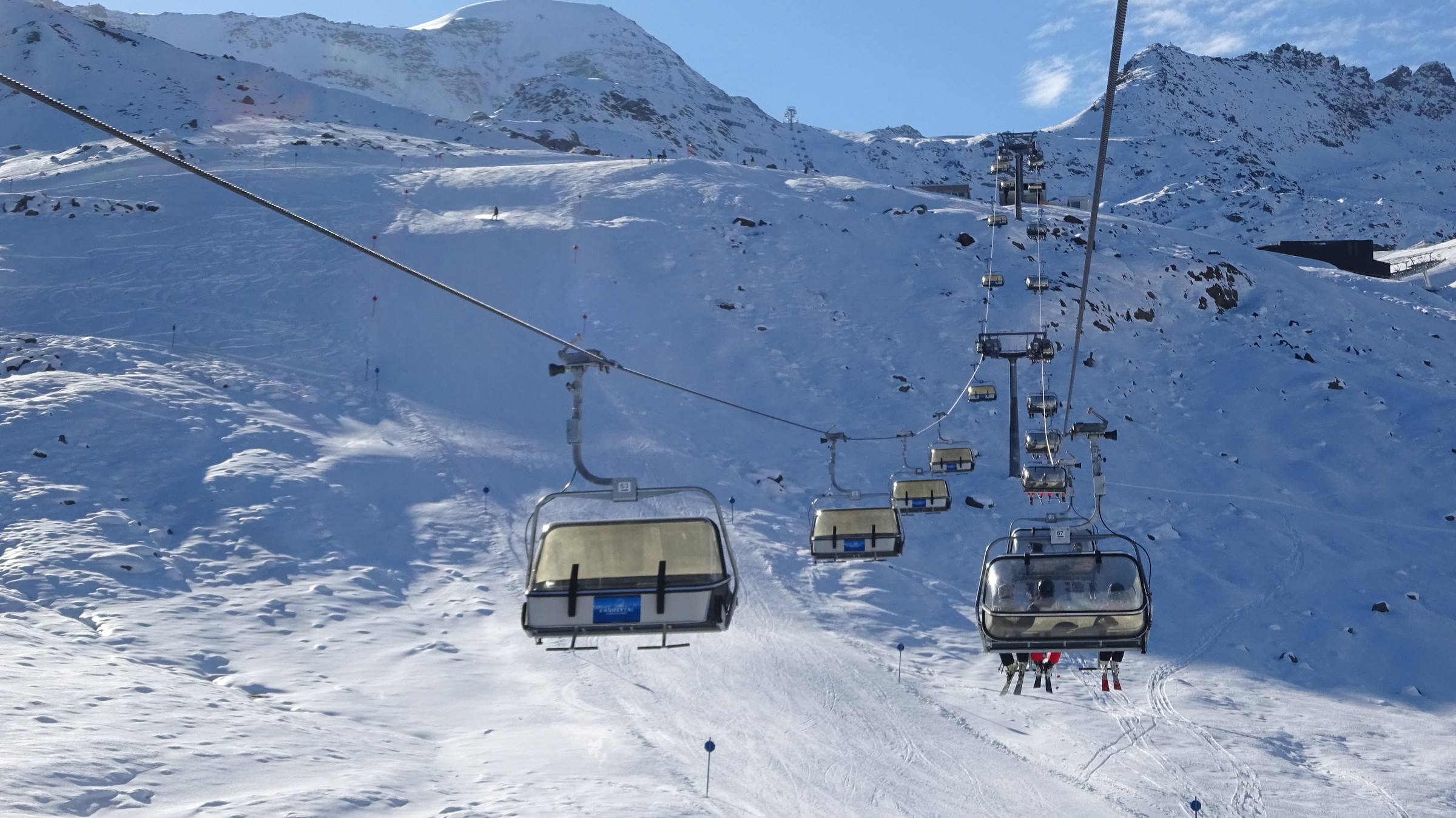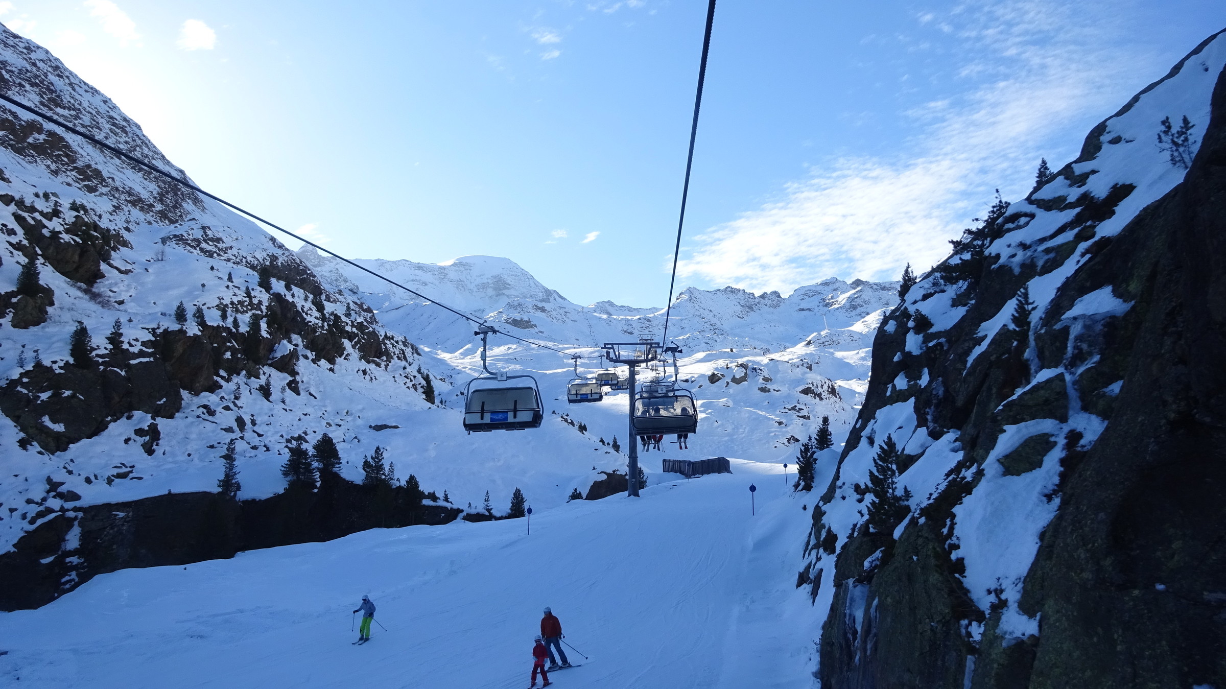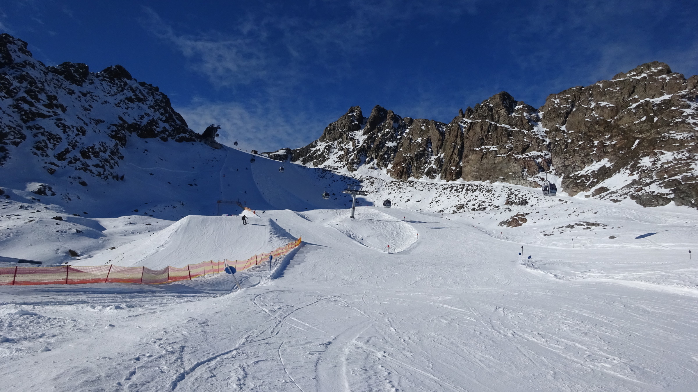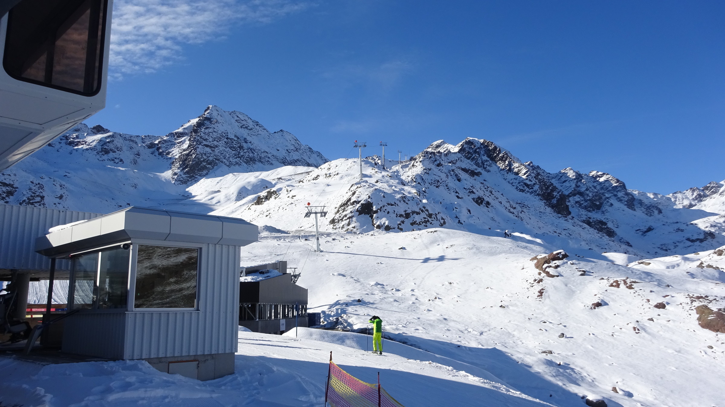 Morgendlicher Blick auf die Ochsenalmbahn vom Parkplatz aus, welcher um 8:30 nicht sehr gefüllt war. (Wir waren den ganzen Tag über der einzige Bus dort) Dann ging es zunächst gleich noch auf das Karlesjoch hinauf. Von dort aus hat man einen sehr schönen Ausblick in Richtung Südtirol VinschgauDie Karlesjochbahn, jedoch haben die an ihren beiden Kuppelbarenbahnen sehr komische Abstände. (z.B fehlen bei der Karlesjochbahn zwischendrin 2 Kabinen sodass, dort eine rießige Lücke entsteht:?: Blick auf die Piste Dann bin ich zunächst einmal von ganz oben bis nach unten gefahren. Die Pisten and der Karlesjochbahn wahren sehr schön sonnig. An der Ochsenalm war es sehr schattig aber die Pisten waren sehr schön griffigTalstation der neuen Weisseejochbahn. Es wurde sogar am Samstag gearbeitet EIn Blick auf die zukünftige Piste. Meiner Meinung nach wird das Pistentechnisch nix gescheites, da die wohl doch sehr schmal ausfallen wird