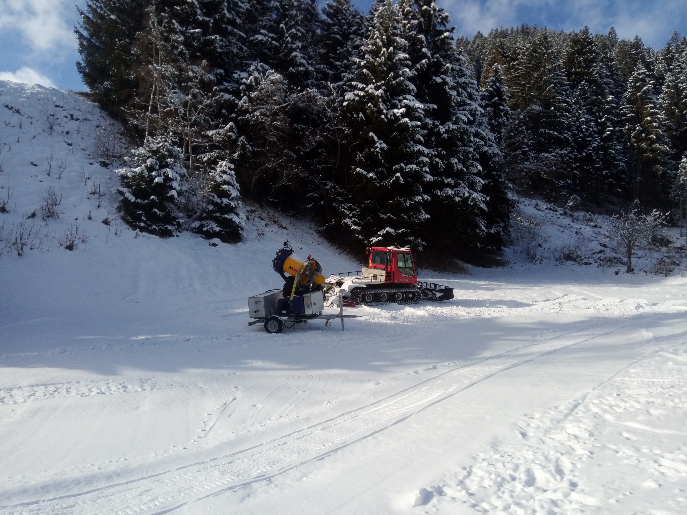 Die einzige Schneekanonen ruht sich bei der Pistenraupe aus: