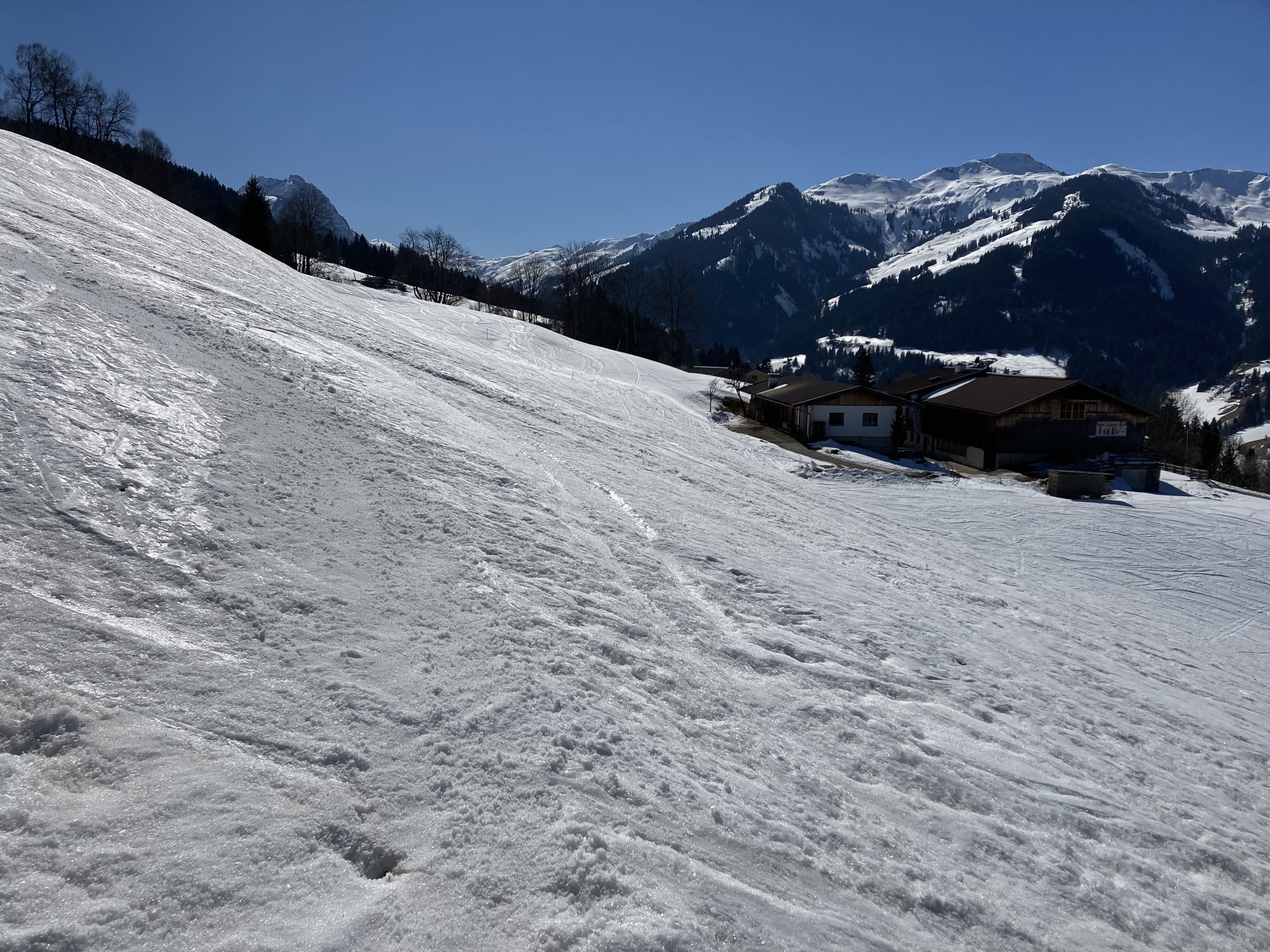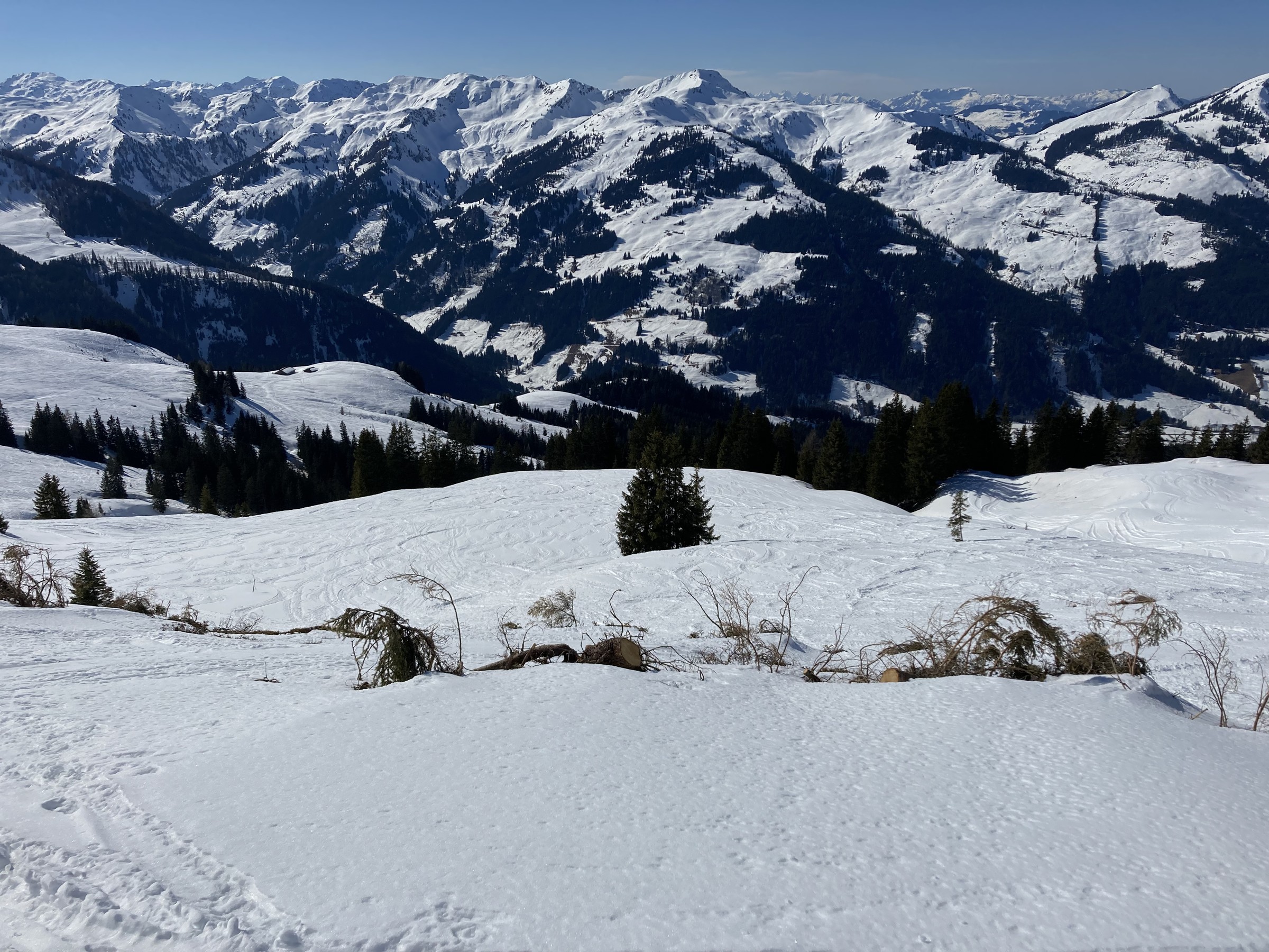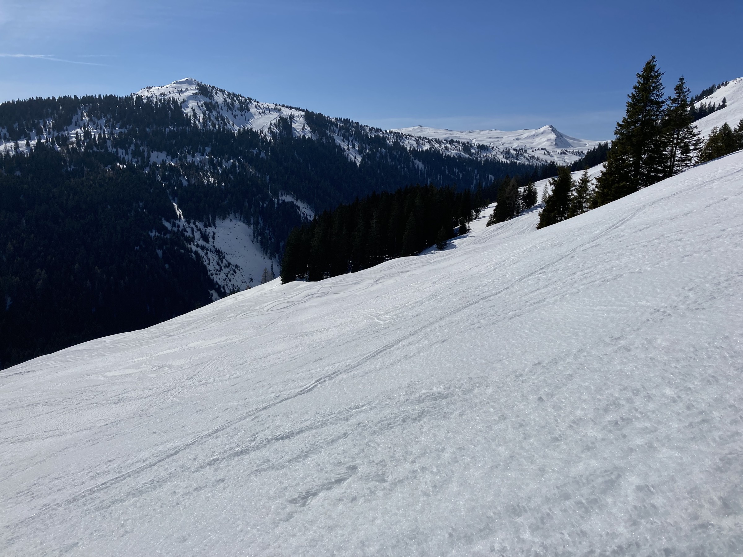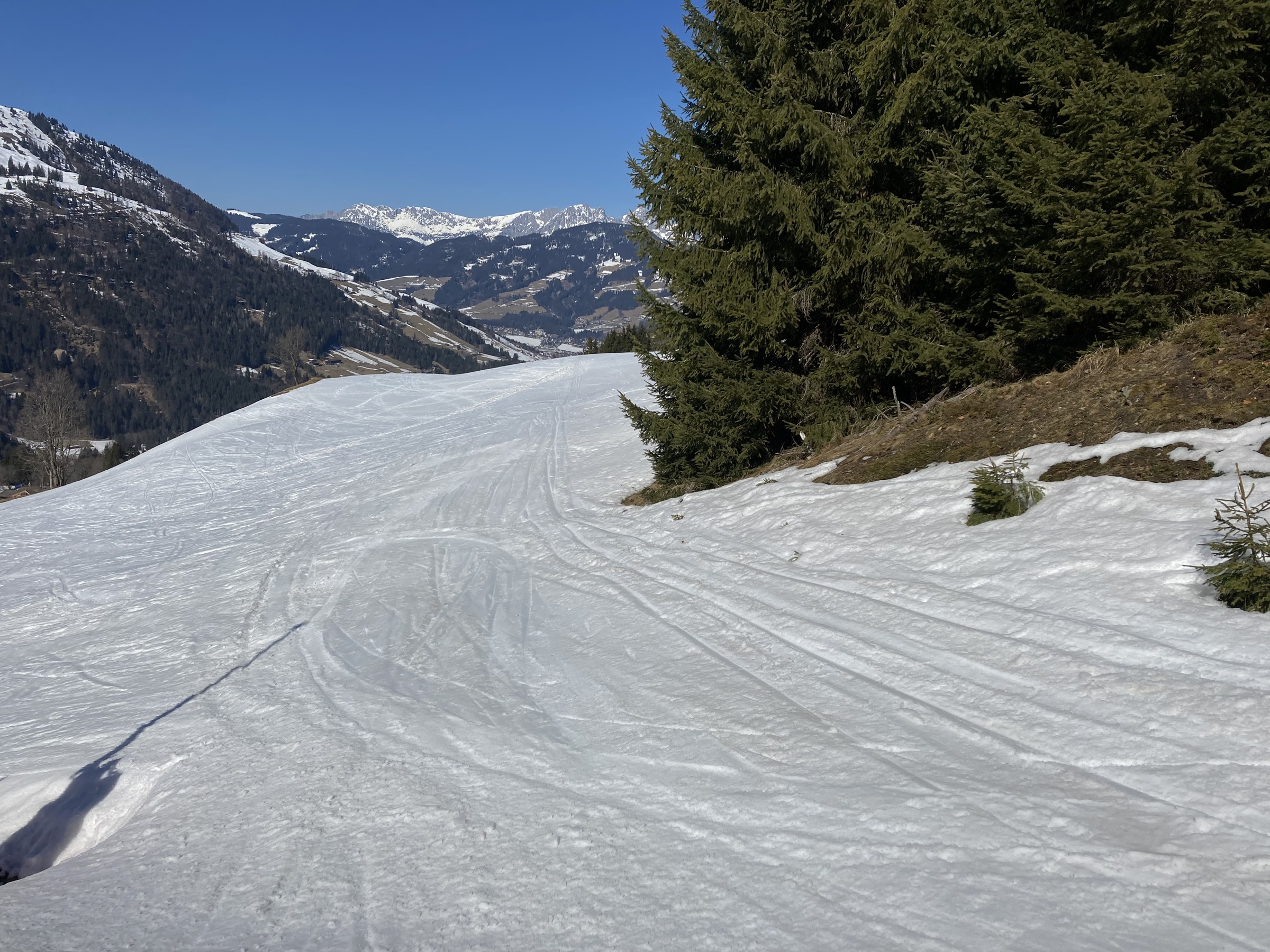 Im Kitzbüheler Höhenskigebiet hat dieser Prozess noch gar nicht begonnen. Zwar hatten wir nun zwei Strahlungswochen, wobei aber die Nullgradgrenze erst vor Kurzem an die 2000m ging. Das habe ich falsch eingeschätzt. Somit waren die SO-S seitigen Hänge an Hochsaukaser und Trattenbach nicht spassvoll fahrbar. Wenigstens konnte ich eine schöne Variante am Talsen finden - ebenfalls SO-seitig, aber sehr tief, sodass ich das erst am zweiten Tag sinnvoll ausfahren konnte.