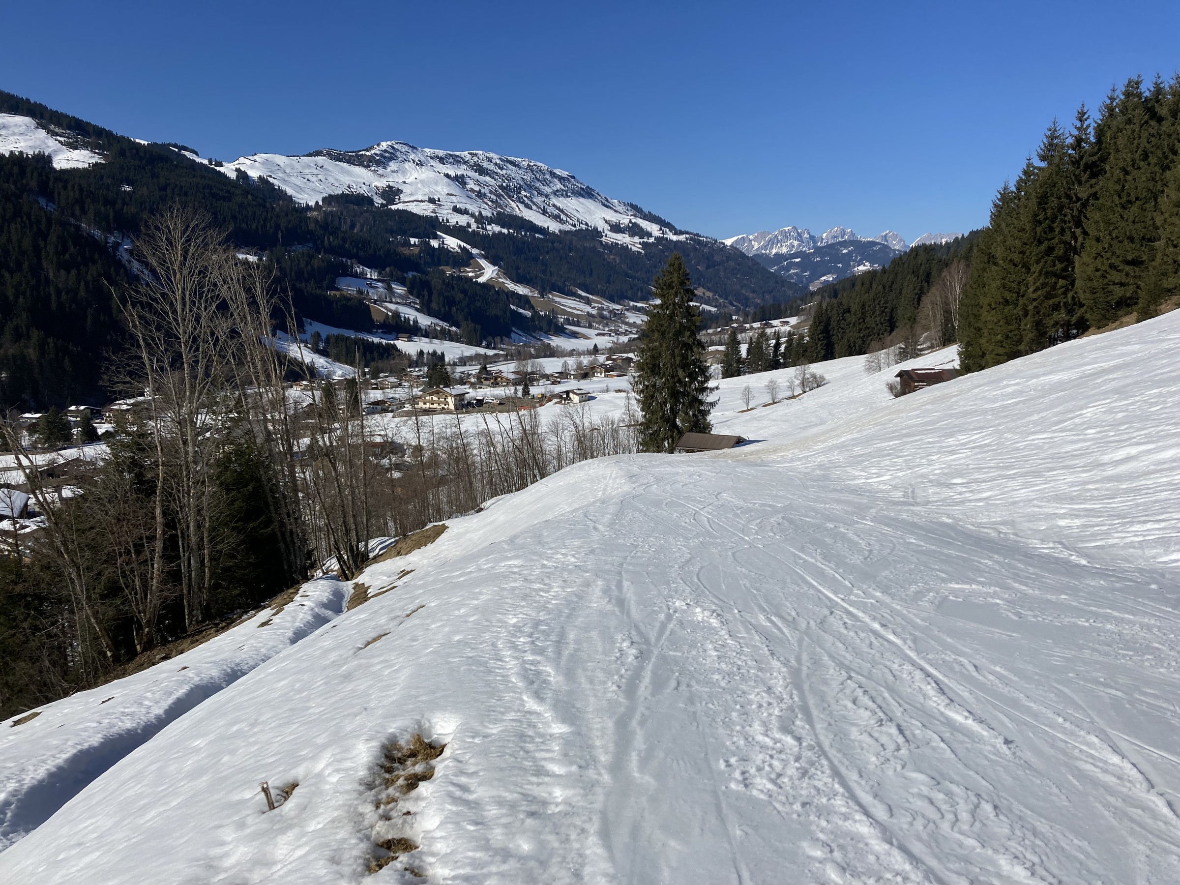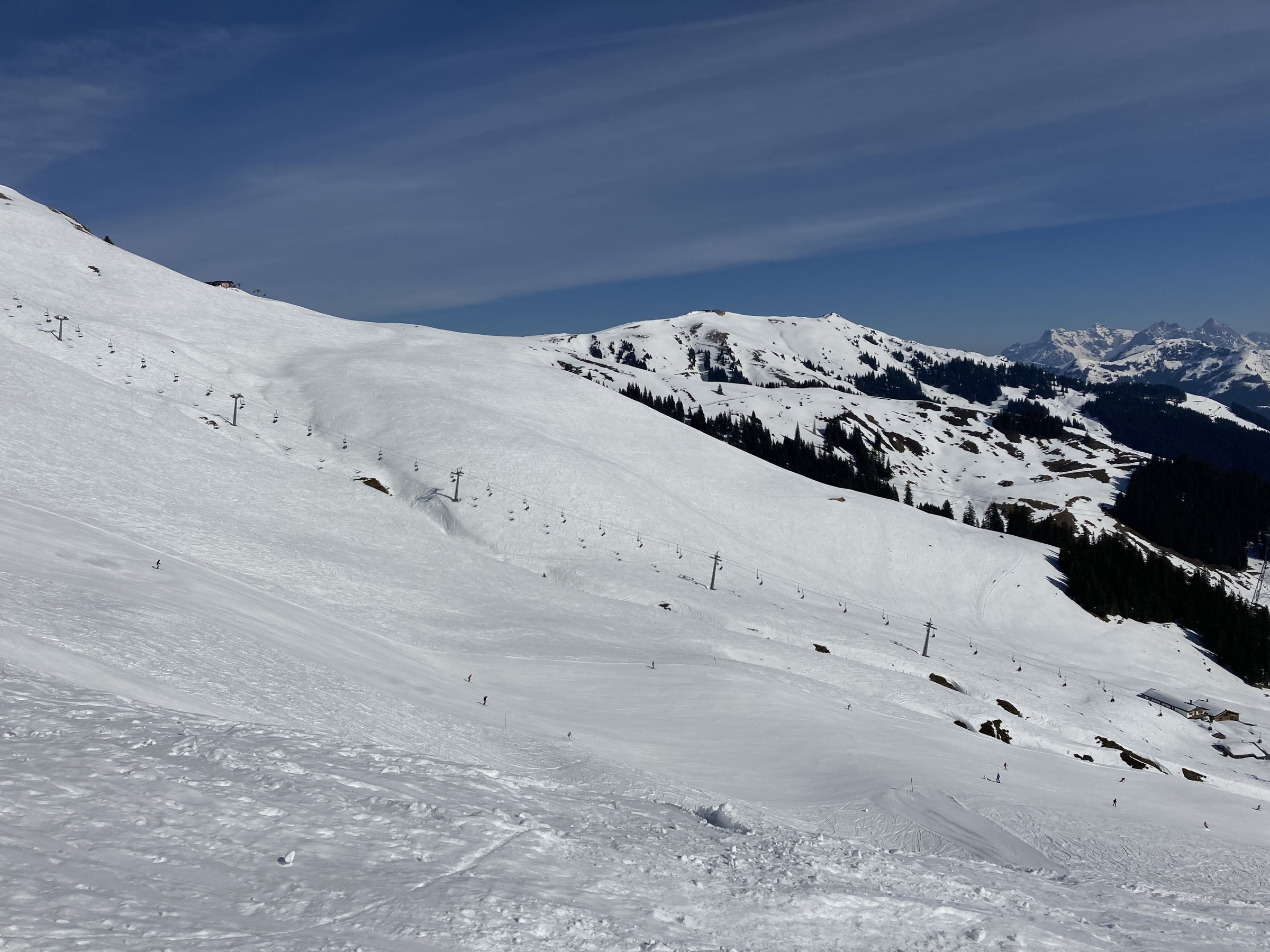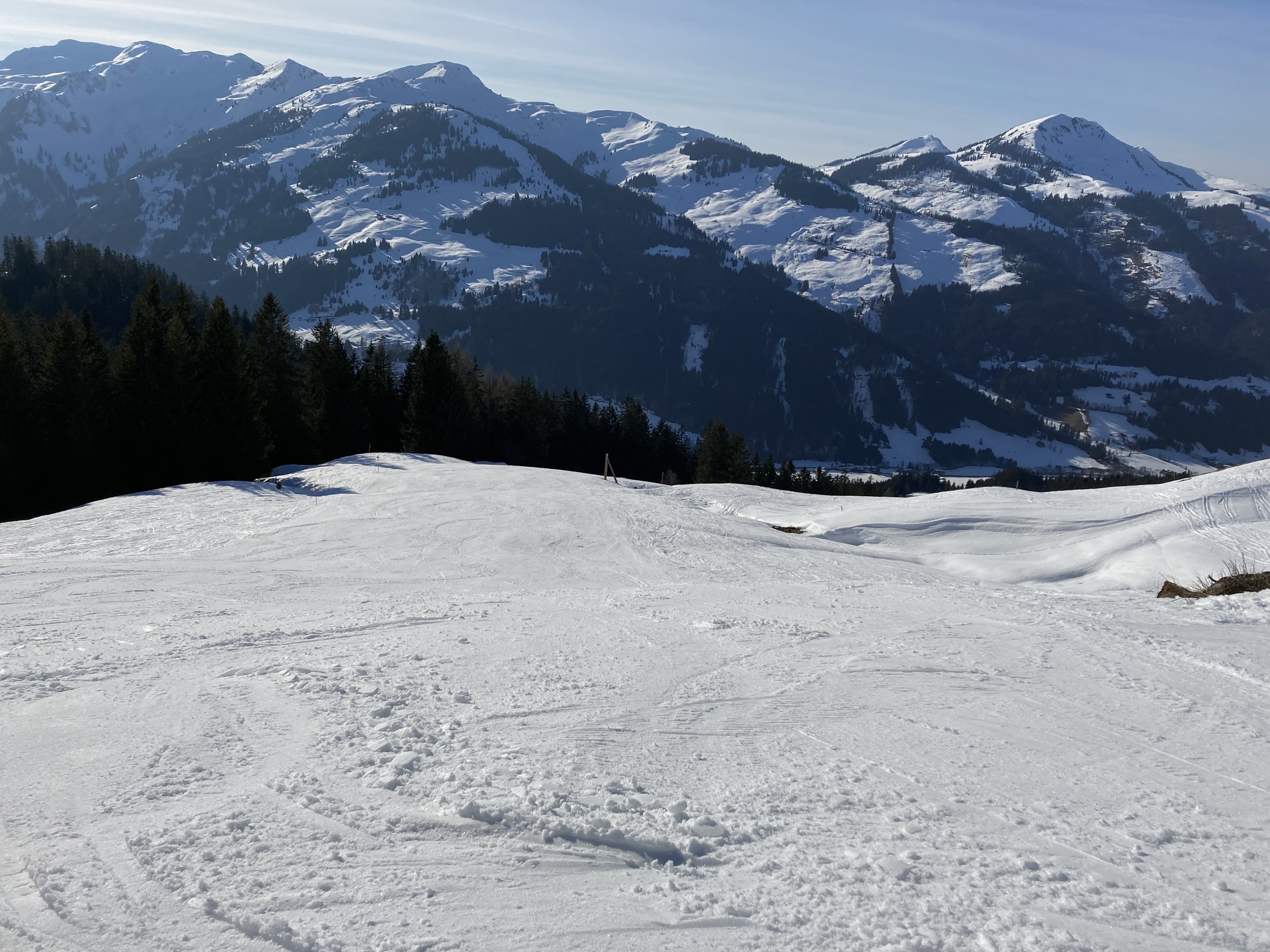 Im Kitzbüheler Höhenskigebiet hat dieser Prozess noch gar nicht begonnen. Zwar hatten wir nun zwei Strahlungswochen, wobei aber die Nullgradgrenze erst vor Kurzem an die 2000m ging. Das habe ich falsch eingeschätzt. Somit waren die SO-S seitigen Hänge an Hochsaukaser und Trattenbach nicht spassvoll fahrbar. Wenigstens konnte ich eine schöne Variante am Talsen finden - ebenfalls SO-seitig, aber sehr tief, sodass ich das erst am zweiten Tag sinnvoll ausfahren konnte.