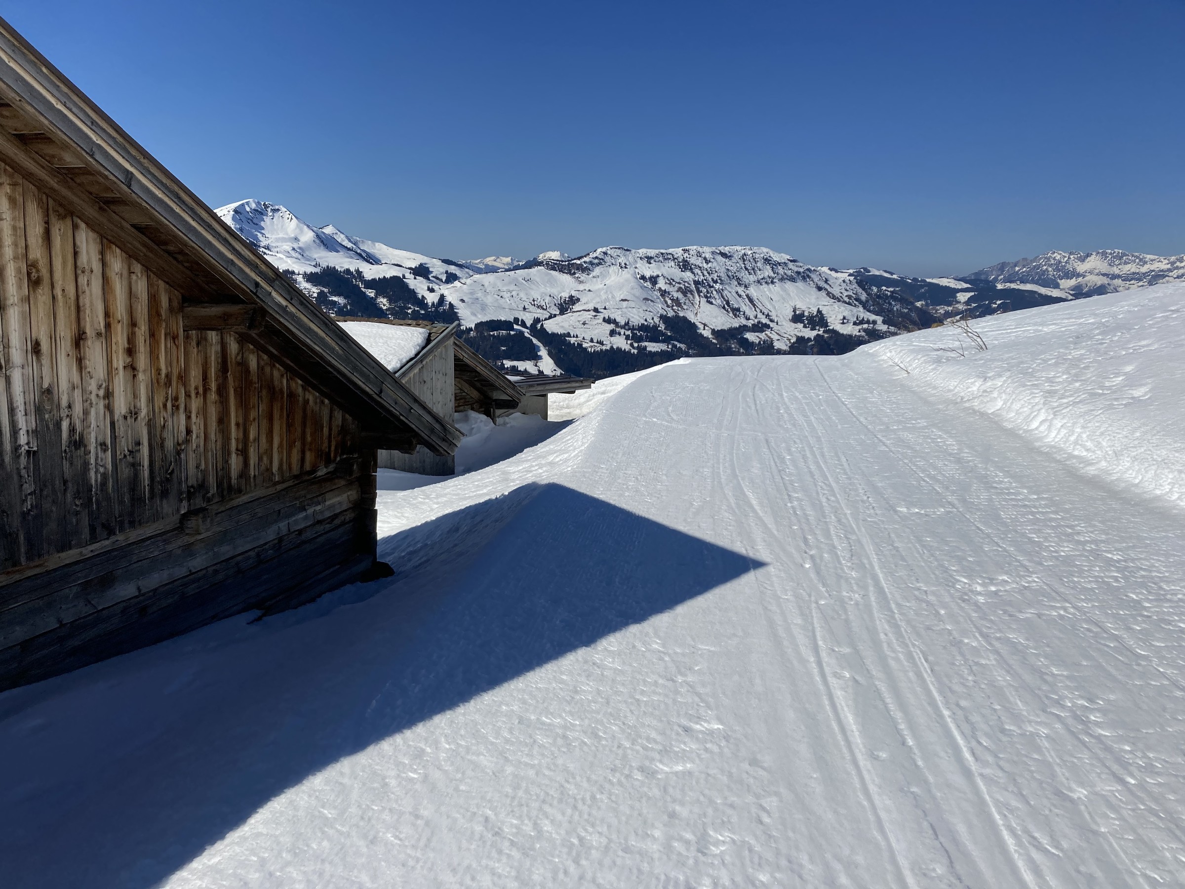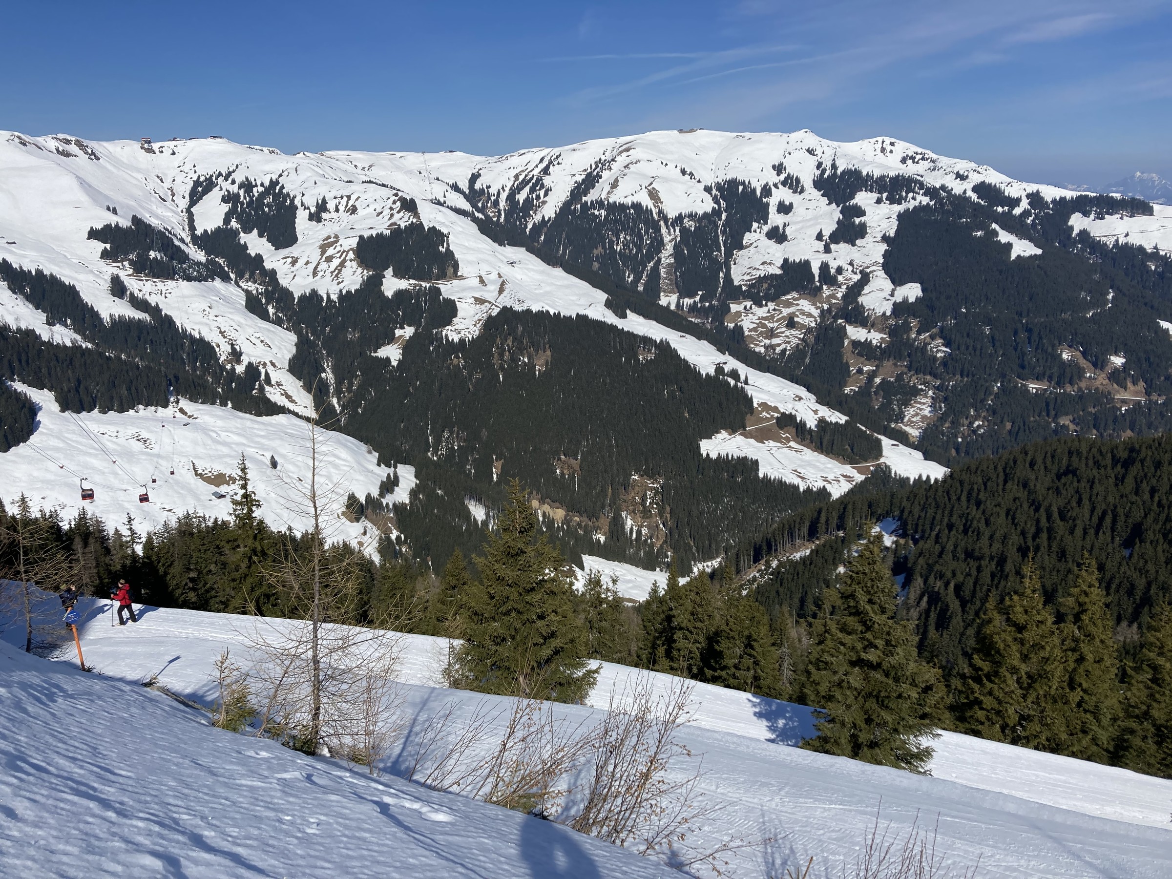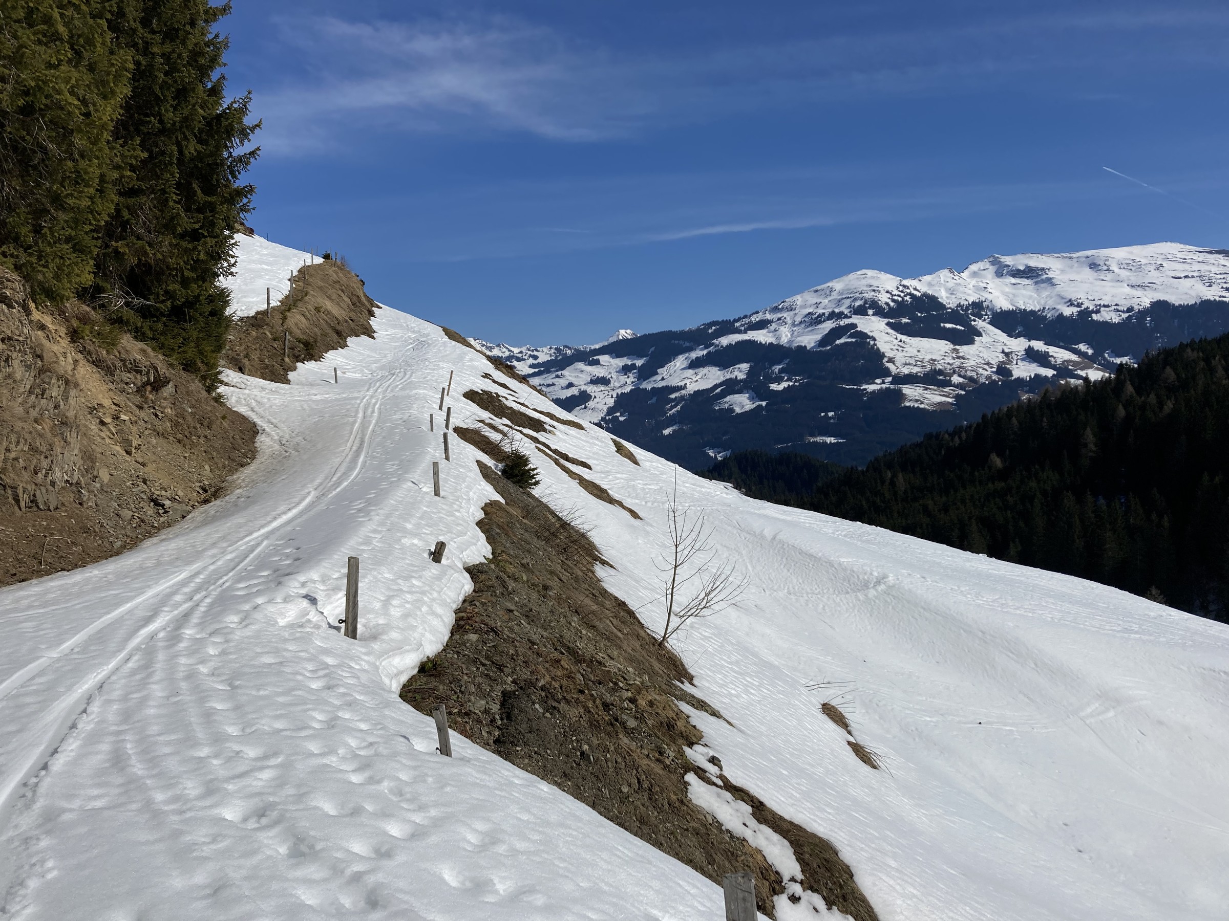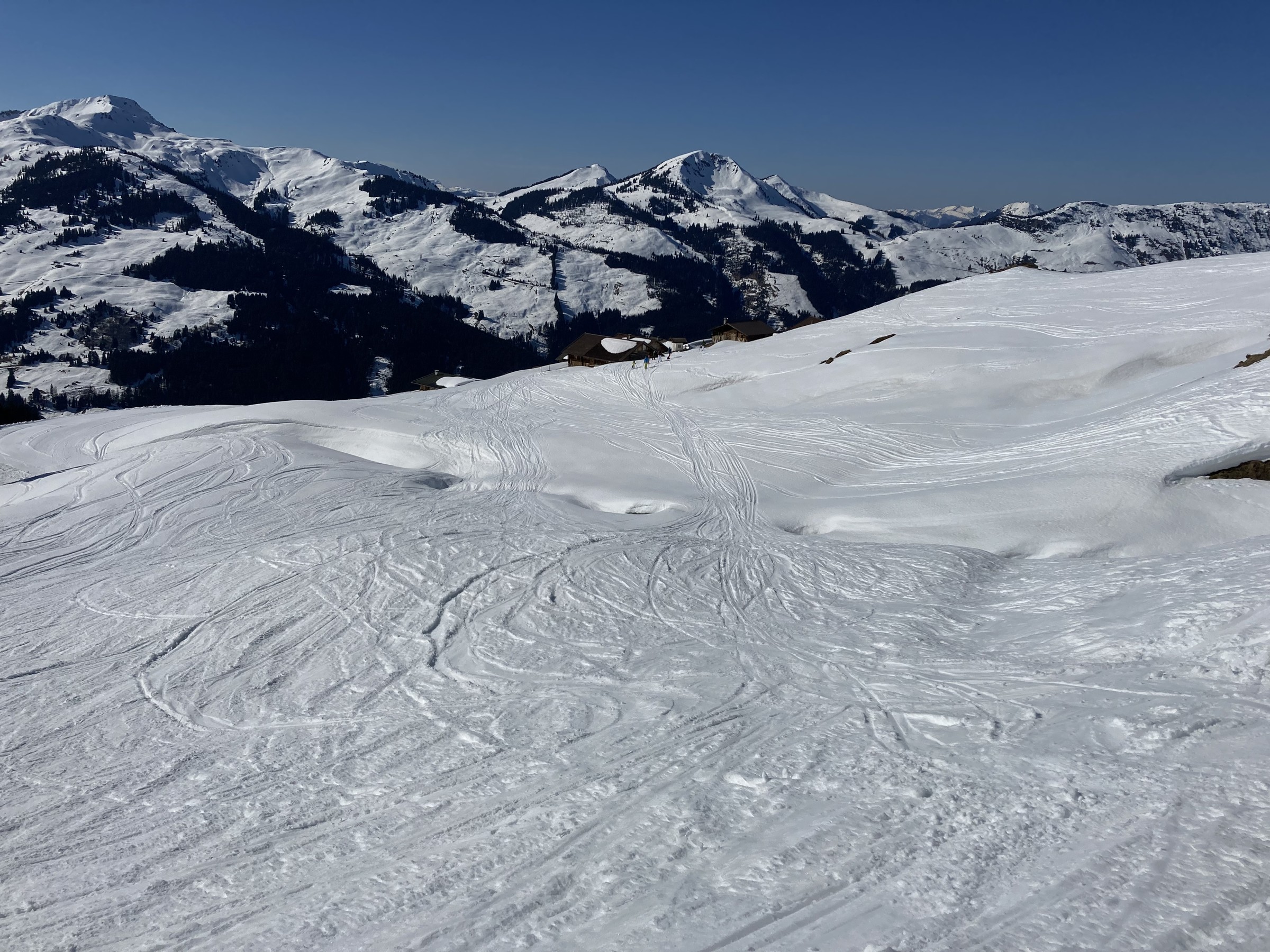 Im Kitzbüheler Höhenskigebiet hat dieser Prozess noch gar nicht begonnen. Zwar hatten wir nun zwei Strahlungswochen, wobei aber die Nullgradgrenze erst vor Kurzem an die 2000m ging. Das habe ich falsch eingeschätzt. Somit waren die SO-S seitigen Hänge an Hochsaukaser und Trattenbach nicht spassvoll fahrbar. Wenigstens konnte ich eine schöne Variante am Talsen finden - ebenfalls SO-seitig, aber sehr tief, sodass ich das erst am zweiten Tag sinnvoll ausfahren konnte.