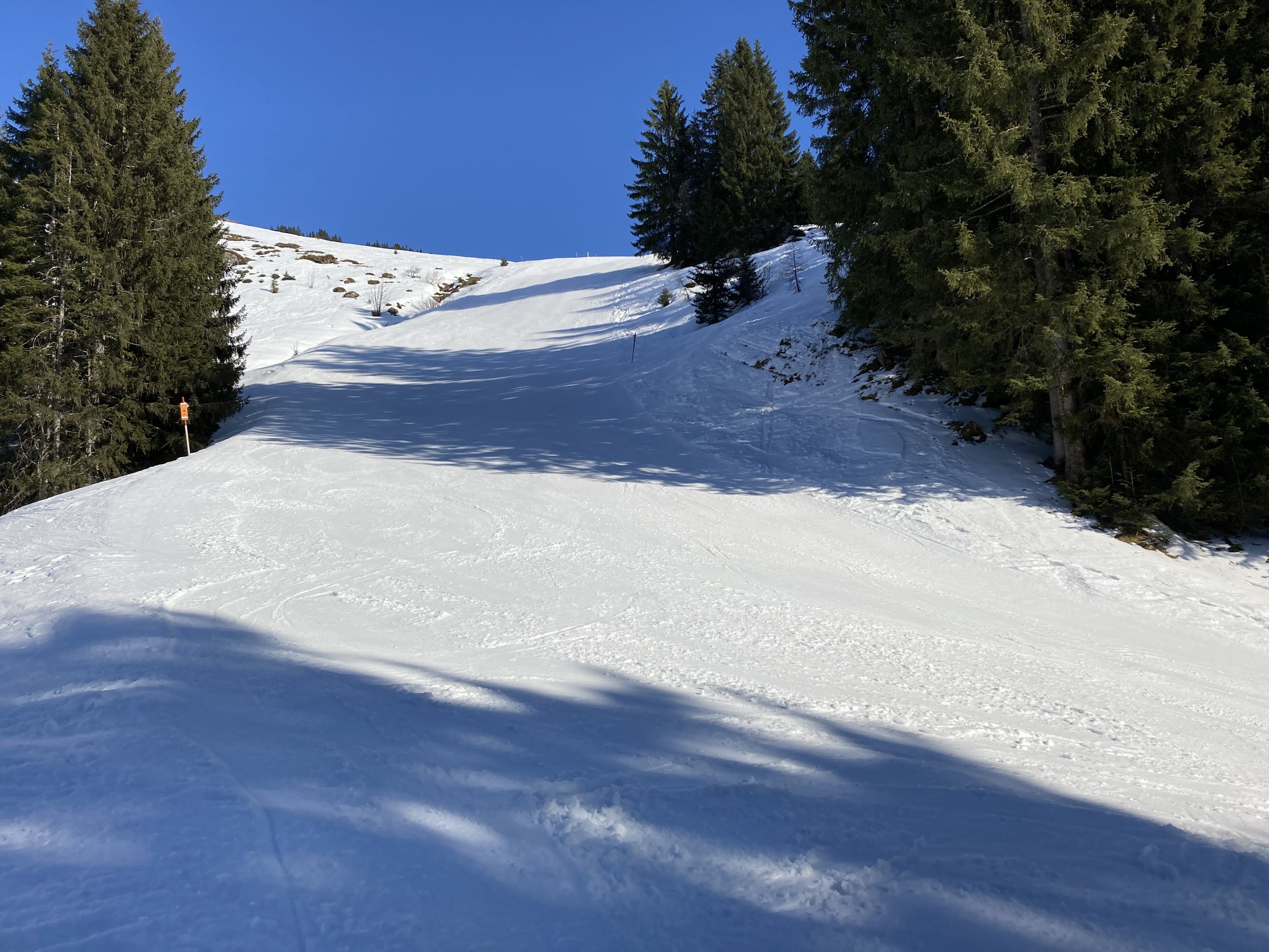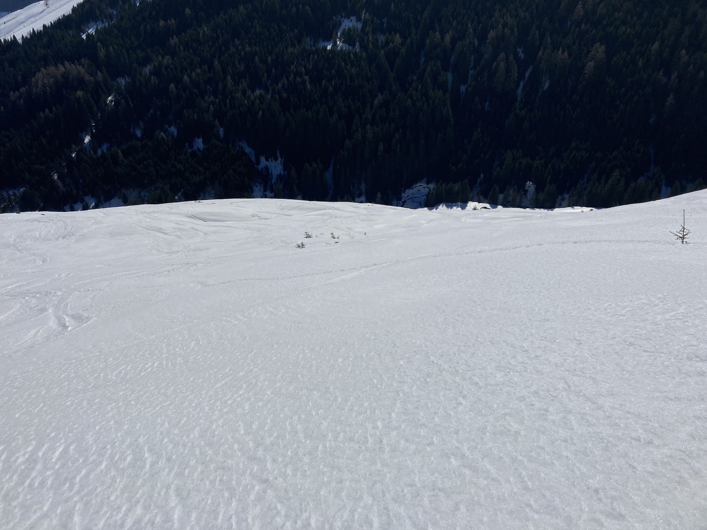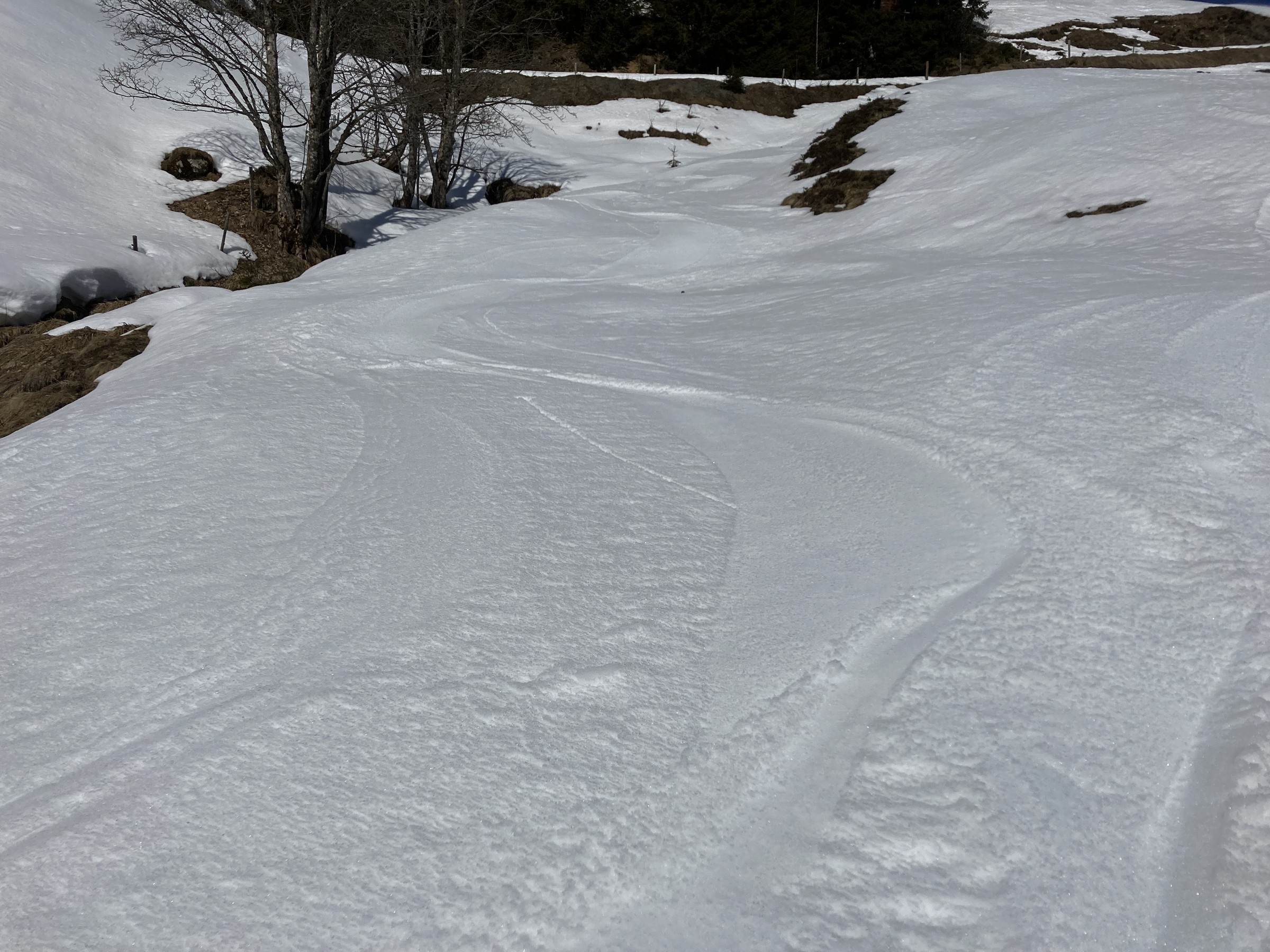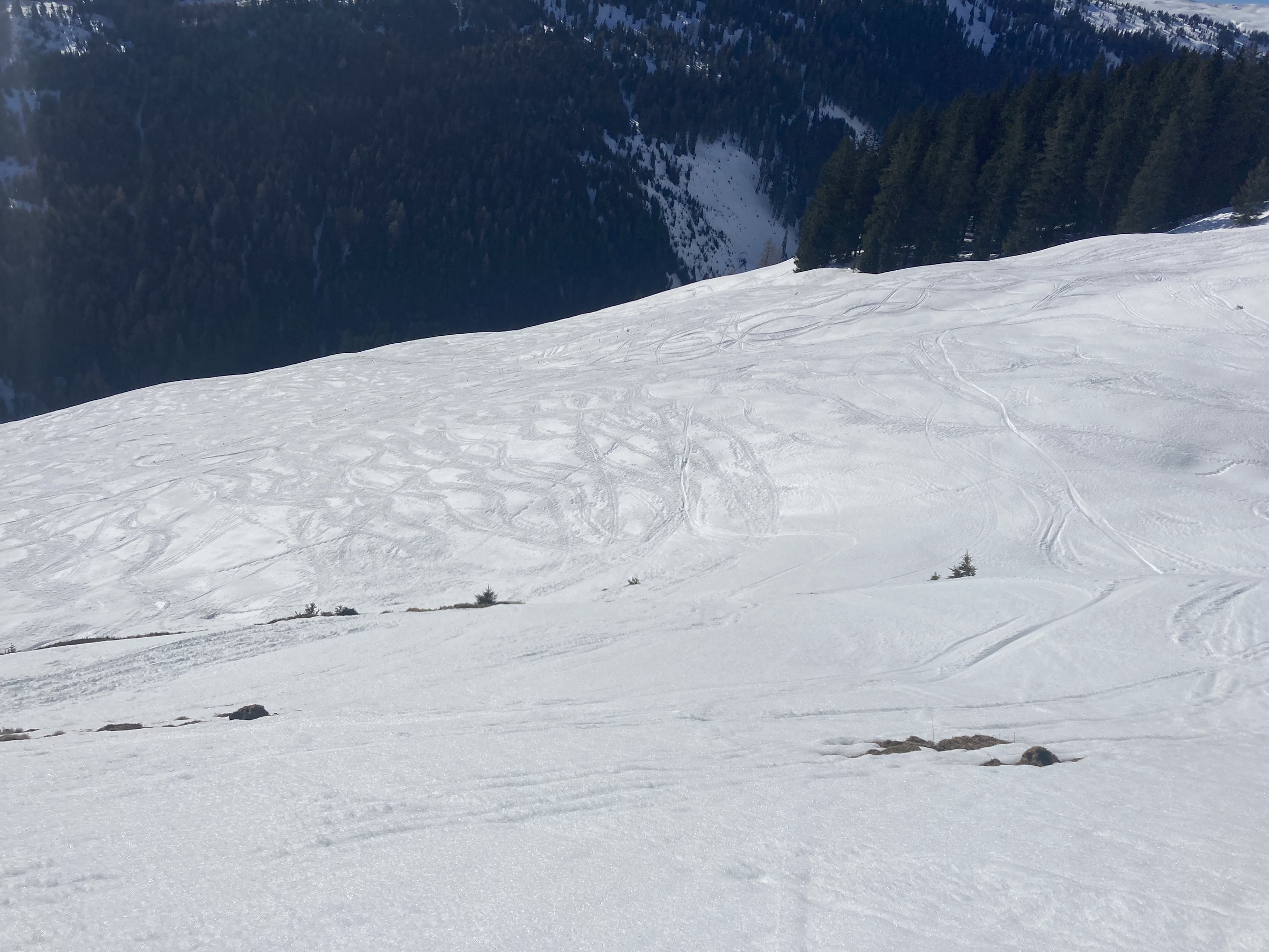 Die Schwarze Piste am Hochsaukaser sah ganz nett aus, aber ich bin ja nicht zum Pistenfahren gekommen. Auf dem Papier ideale Firnhänge, aber eben noch total umgegraben.