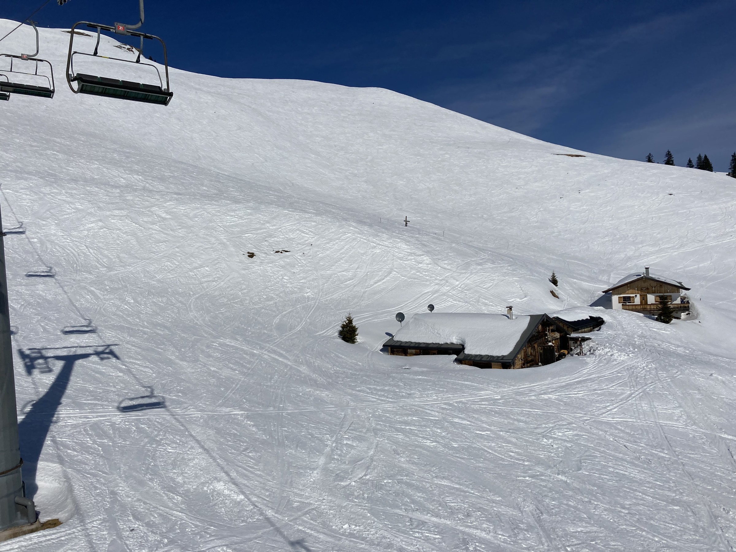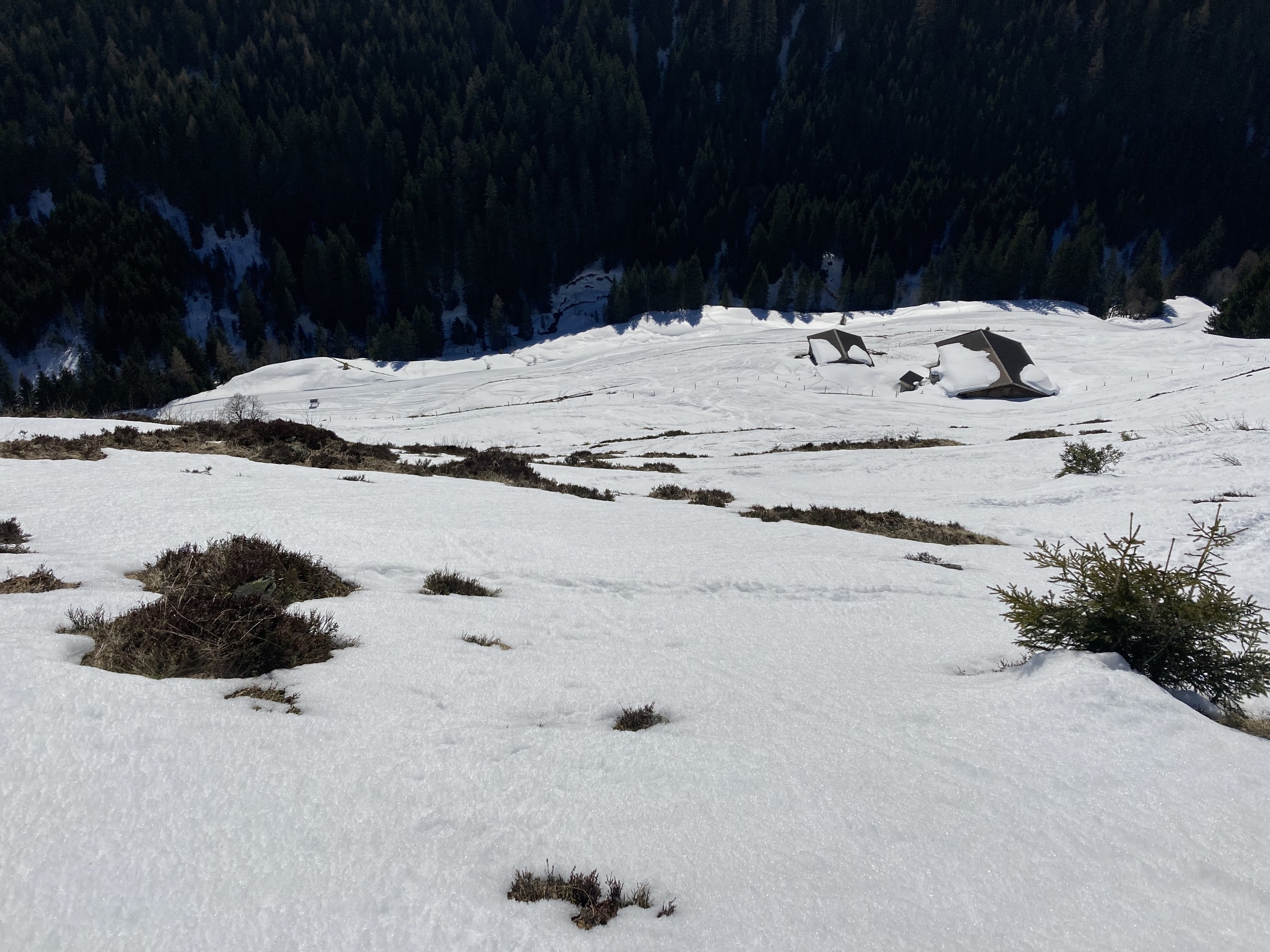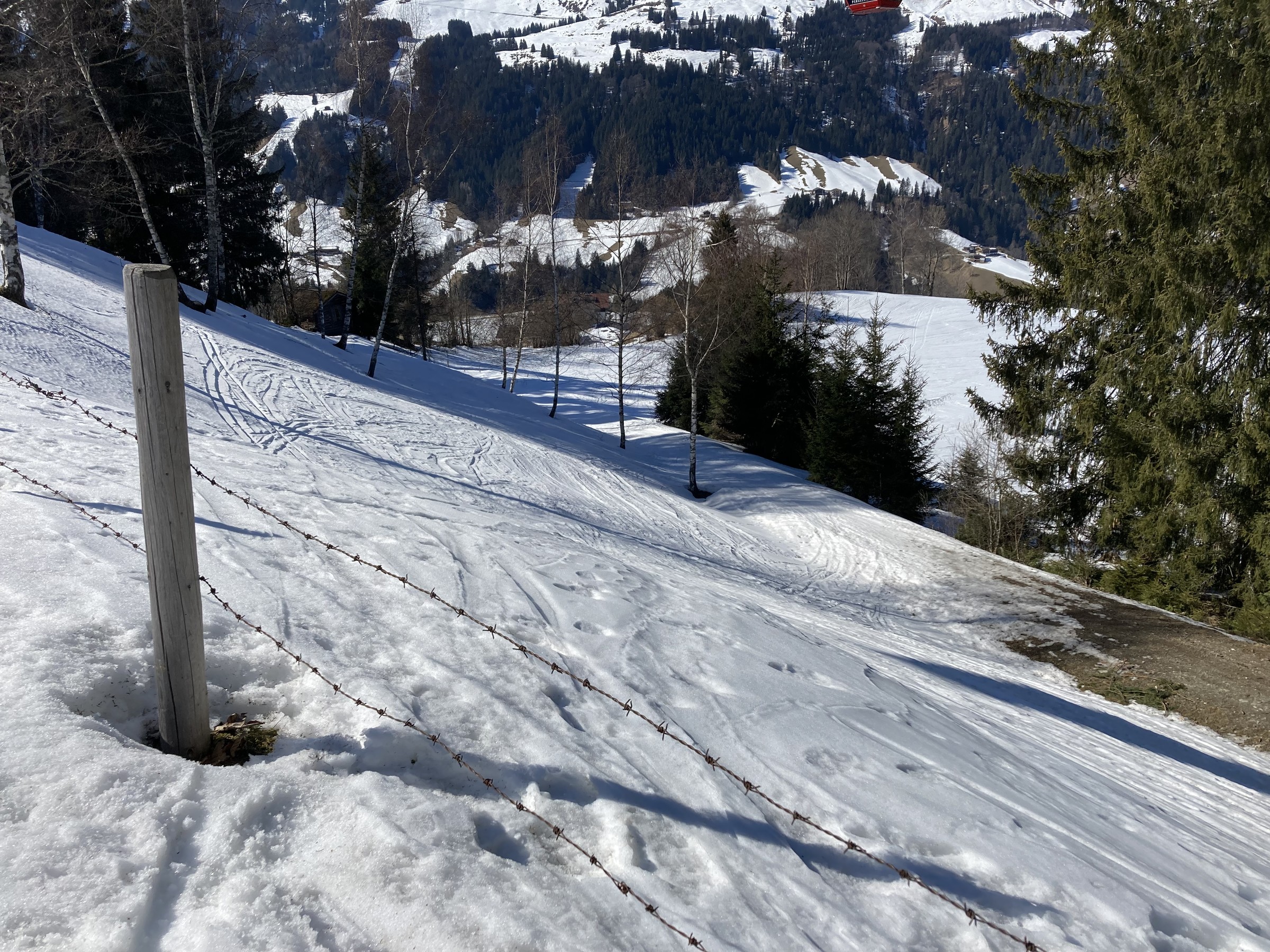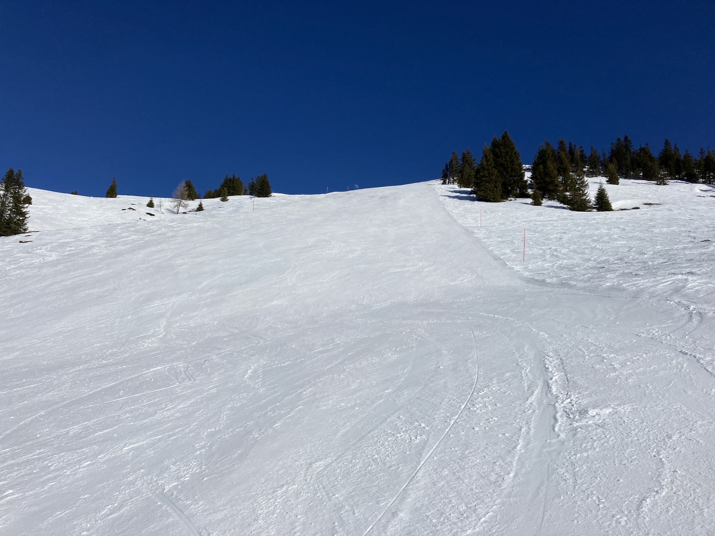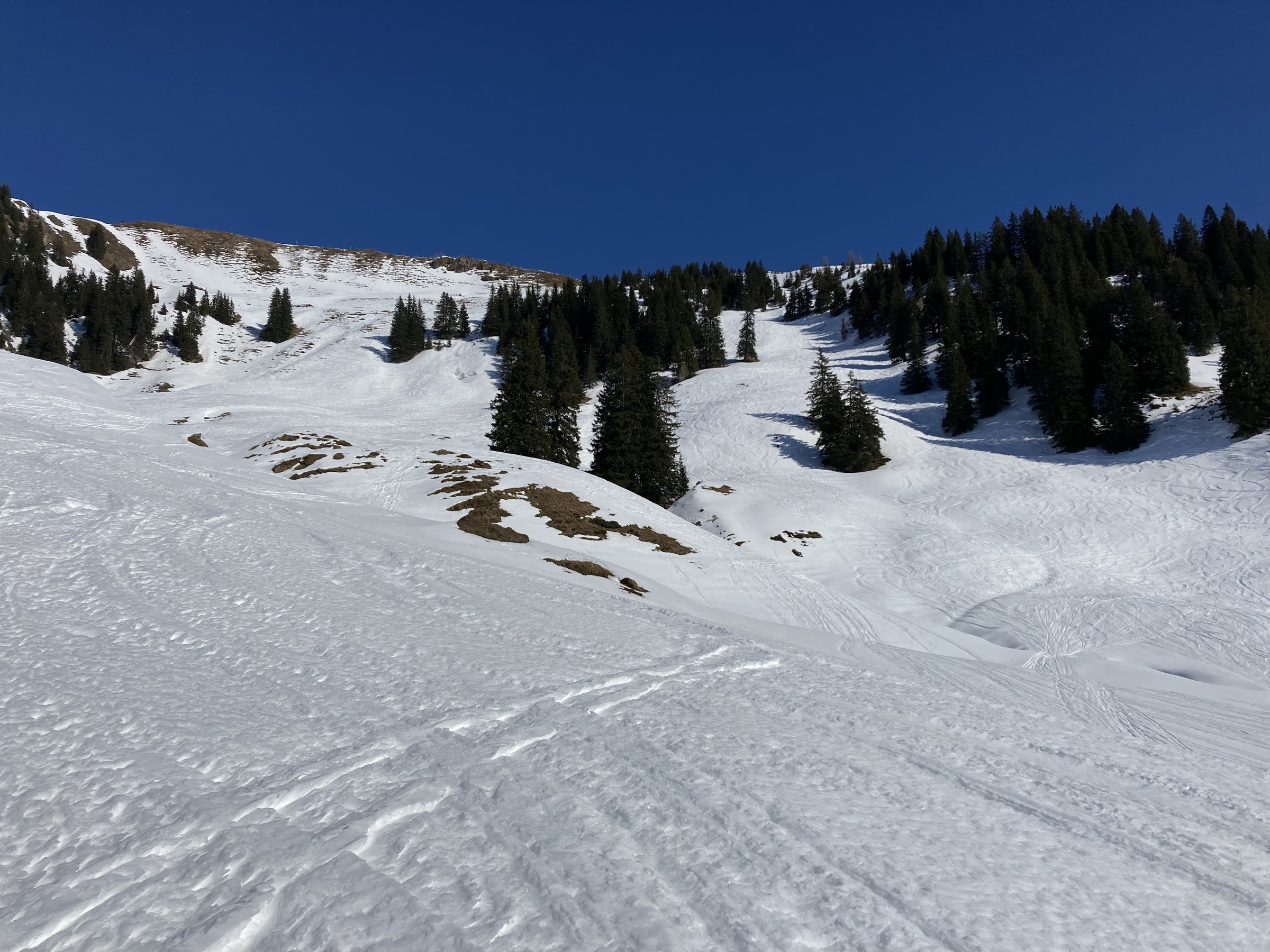 Die Schwarze Piste am Hochsaukaser sah ganz nett aus, aber ich bin ja nicht zum Pistenfahren gekommen. Auf dem Papier ideale Firnhänge, aber eben noch total umgegraben.