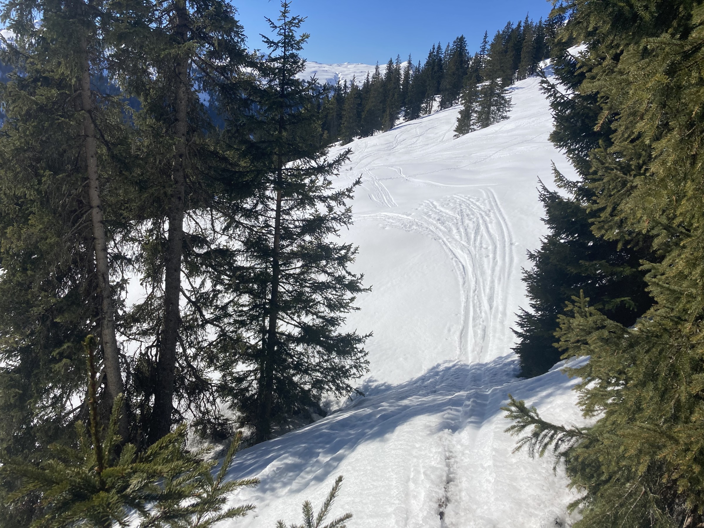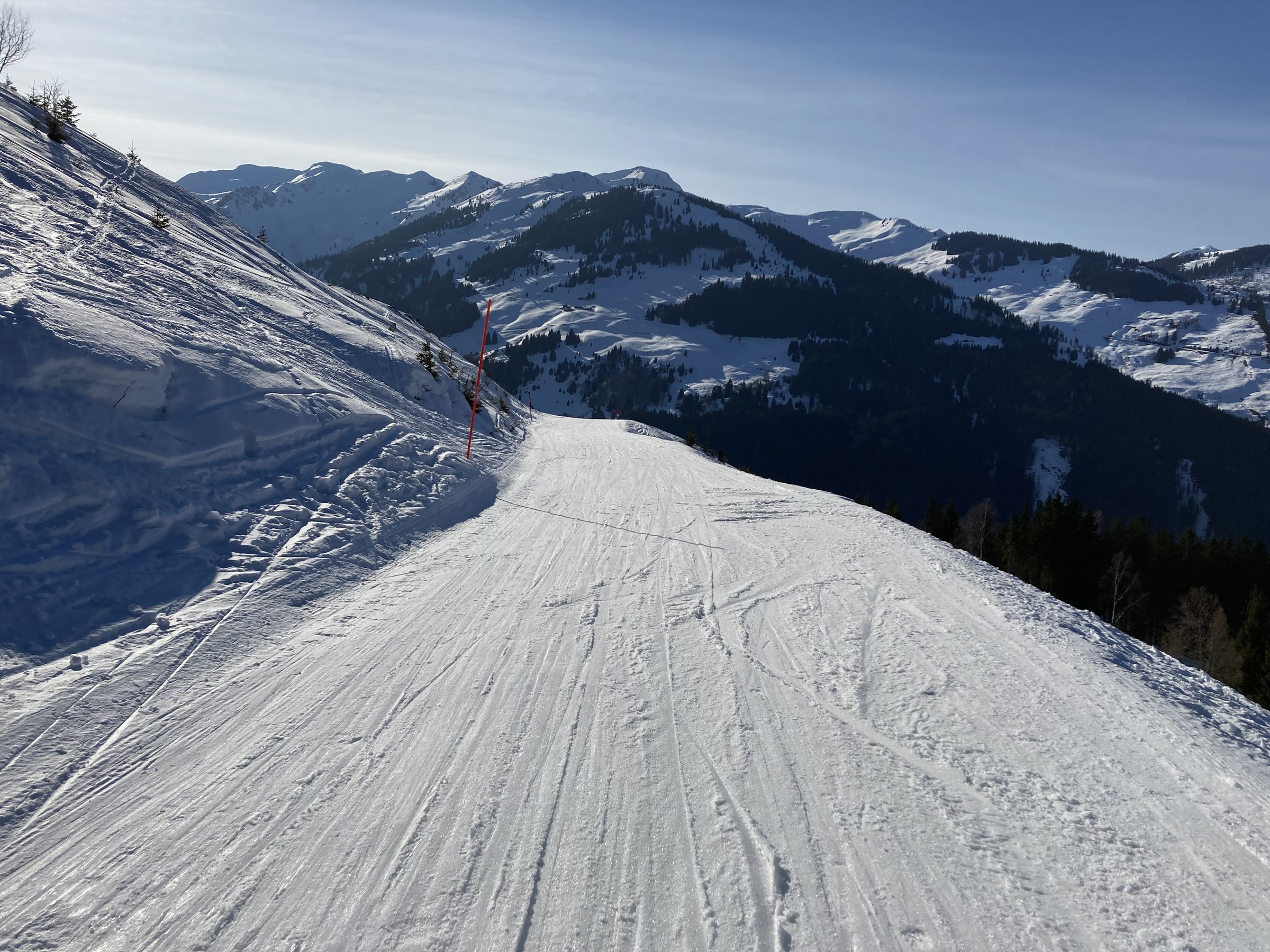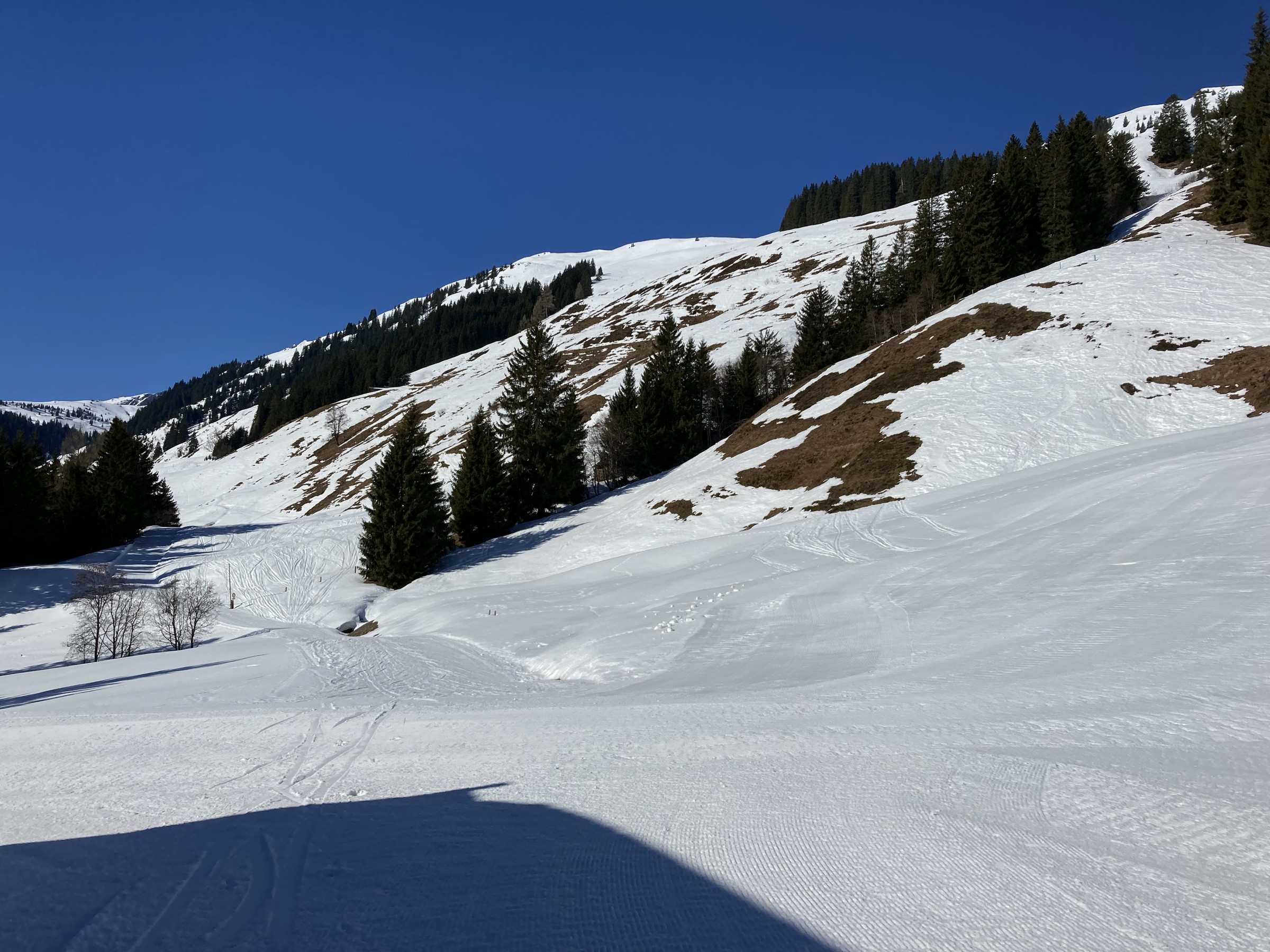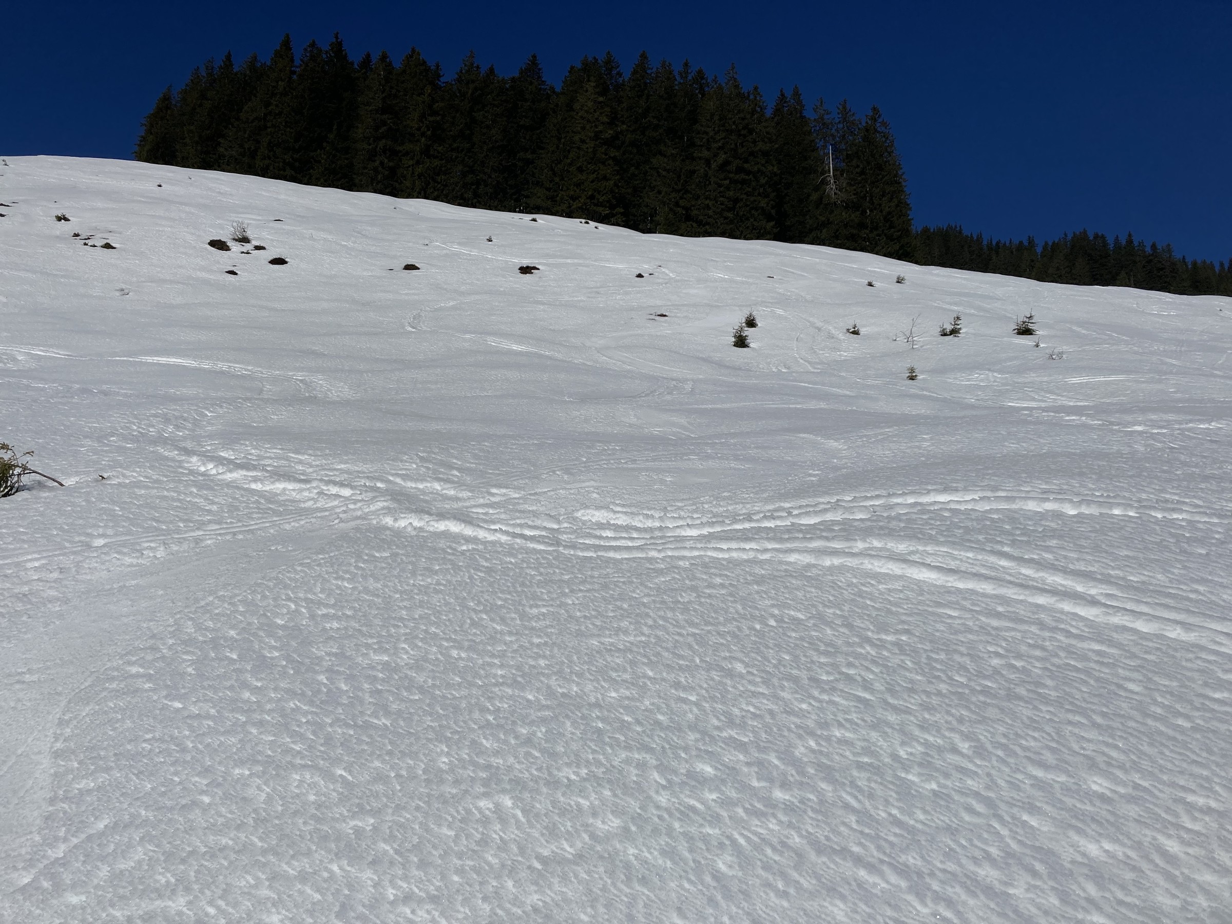 Die Schwarze Piste am Hochsaukaser sah ganz nett aus, aber ich bin ja nicht zum Pistenfahren gekommen. Auf dem Papier ideale Firnhänge, aber eben noch total umgegraben.