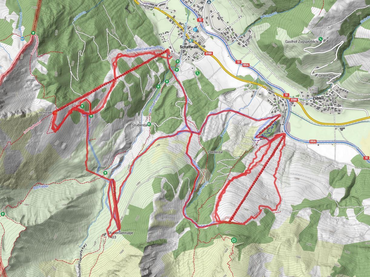 Corona-bedingt war die letzte Saison leider ein Totalausfall und heuer hatte mich eigentlich schon damit abgefunden, dass es in dieser Saison wieder nichts mit schifahren wird - mir sind diese Einschränkungen wie Maskenpflicht (auch am Schlepplift), Kontrollen in den Lokalen, etc. einfach zu mühsam, das verdirbt mir den Spass. Dann wurden aber mit 5. 3. 2022 in Österreich nahezu sämtliche Beschränkungen aufgehoben, zudem ergab es sich, dass ich beruflich nach Tirol musste und mir 2 Tage zwischen den Arbeitseinsätzen frei nehmen konnte. So habe ich die Schi eingepackt und bin am 14. 3. um 4 Uhr früh in Richtung Tirol aufgebrochen. Nachdem die beiden Baustellenbesuche im Raum Innsbruck und im Tannheimertal rascher als vermutet voran gingen, blieb auch an diesem Tag noch die Möglichkeit, 2-3 Stunden schi zu fahren. Da ich nun schon mal im Tannheimer Tal war, entschied ich mich für Schattwald-Zöbelen. Dort gibt es zwei SB auf unterschiedliche Berge, dazwischen gibt es Verbindungsabfahrten und noch zusätzlich einen einzelnen, abgelegenen Schlepplift in einer Geländemulde, schaut laut Pistenplan also sehr interessant aus.