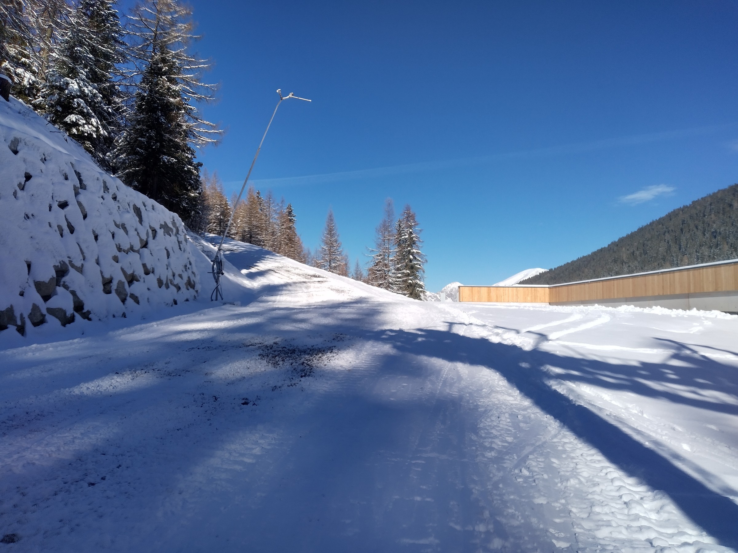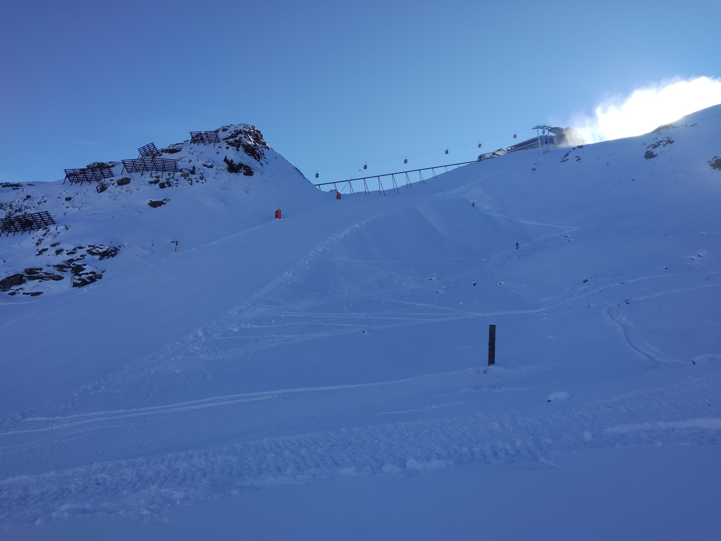Aber hinter dem Grat wird es schnell schlechter. Nur leichte Anzeichen von Grundpräperierung, und an vielen Stellen sehr wenig Schnee. Aber die Kanonen arbeiten fleißig damit die Produktion der Tourismusindustrie auch dieses Jahr nicht still stehen muss.