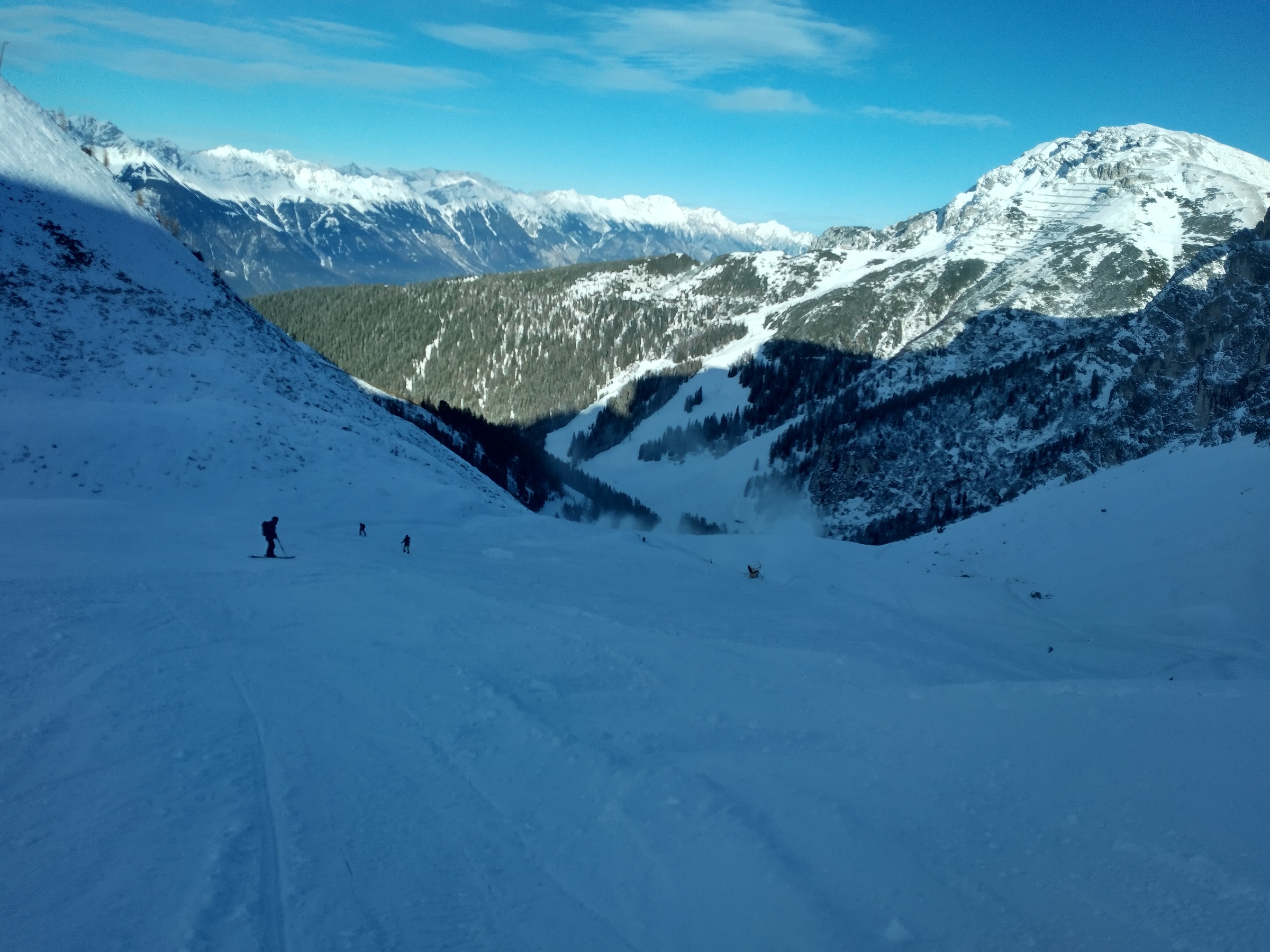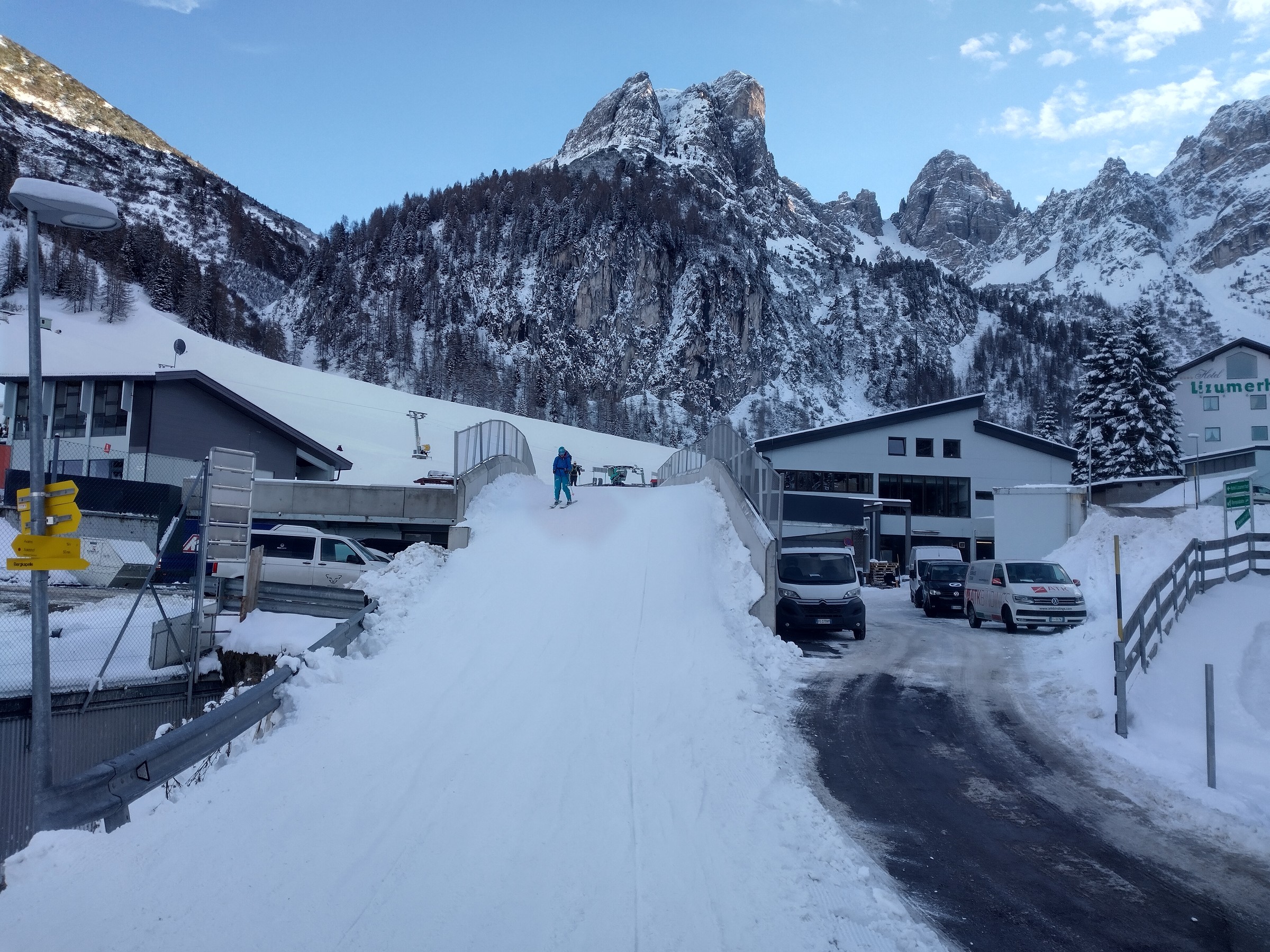 Dem letzten Stück Herrenabfahrt fehlt definitiv noch etwas Schnee für den Skibetrieb. Die meisten die uns Entgegenkommenden schnallen ab und gehen zu Fuß, eine mutige Dame wedelt über den fast steinfreien Bereich am Rand.