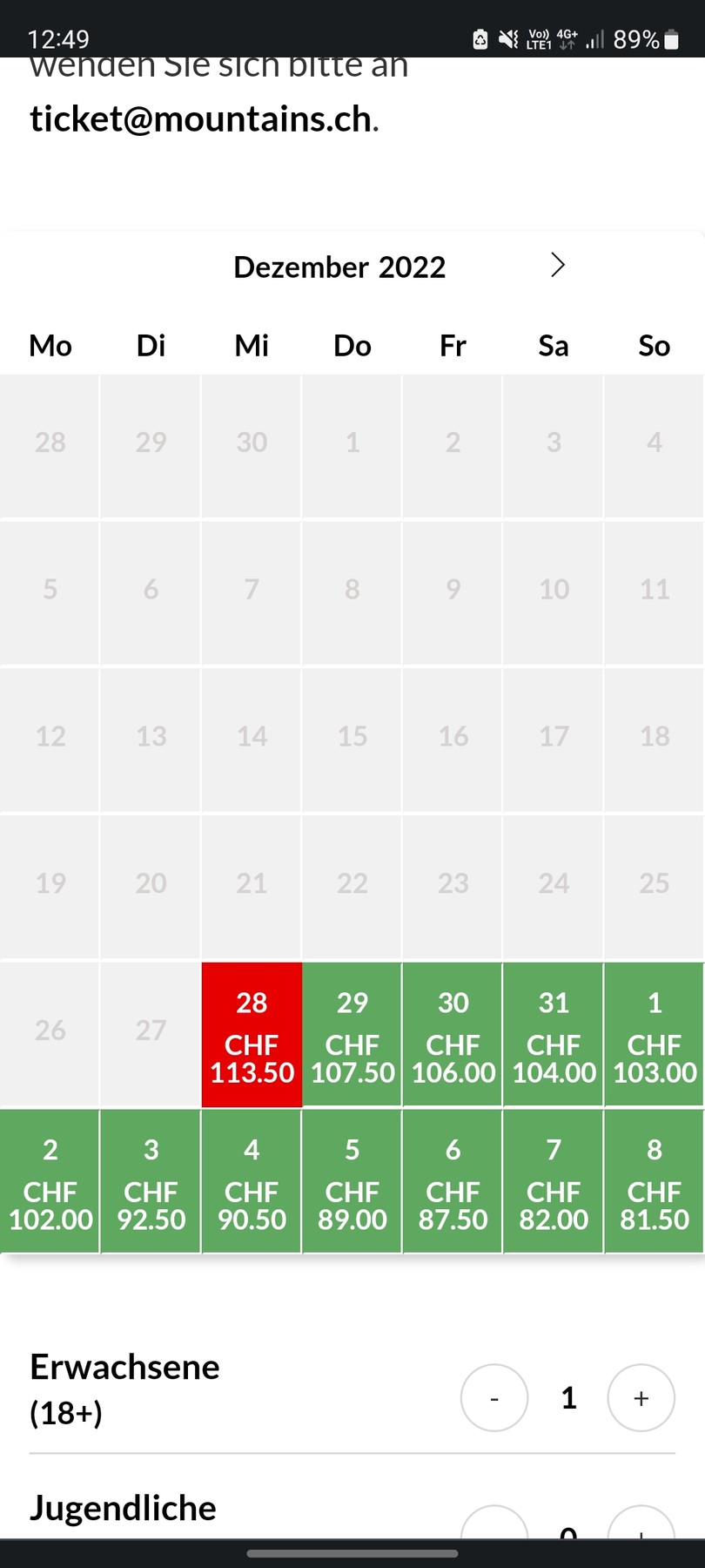 Wenn man jetzt (wird ja später auch teurer) Tageskarten für die jeweiligen Tage kaufen würde dann kommt man nur auf 281,50€ da muss ich sagen finde ich das schon irgendwie schlecht mit dem dynamic pricing scheint so als würde der Mehrtagespreis stärker von Buchungen beeinflusst werden bzw vielleicht gibt es ja auch keine Abhängigkeiten von Mehrtages und Tageskarten bei dem Berechnungsprogramm.