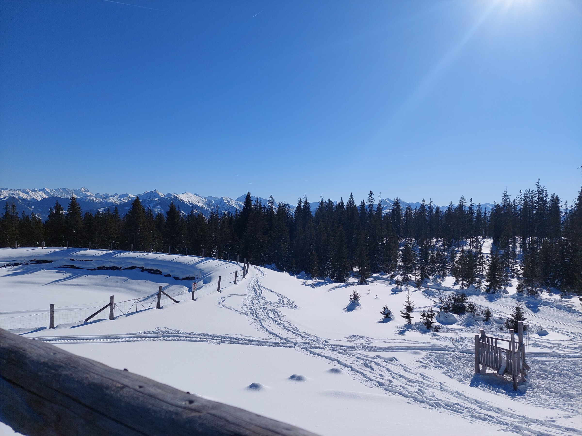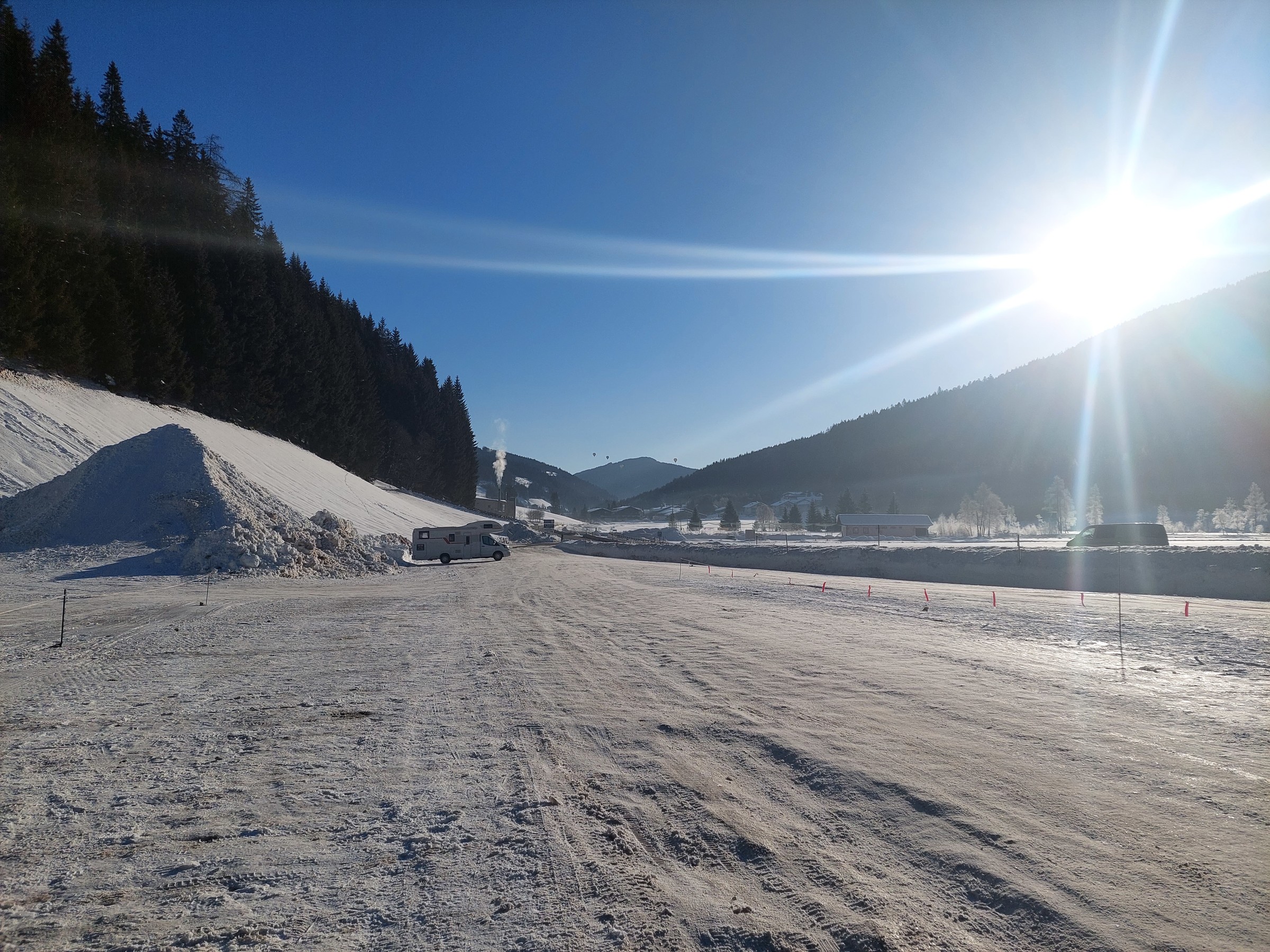 Wetter war wie gesagt traumhaft wolkenlos, Temperaturen den ganzen Tag unter 0, jedoch aufgrund der Sonne angenehm, man bekam selbst beim Anziehen am sonnigen Parkplatz bei -8 keine kalten Finger.