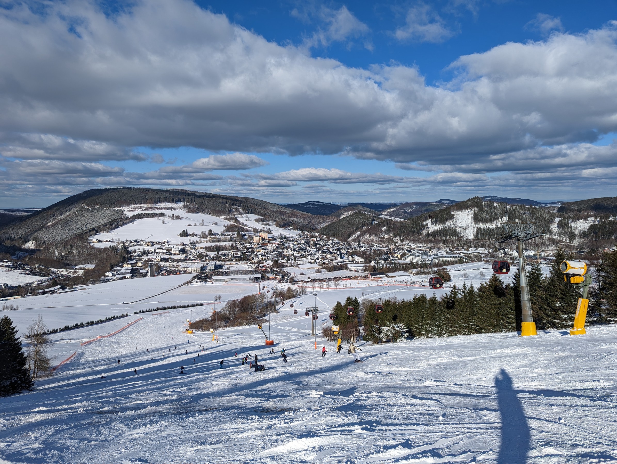 Am Nachmittag an den Köhlerhagen gefahren. Köhlerhagen super in Schuss. Schnee recht stumpf, Buckel nur im Steilhang. Zum Glück hat die Unterlage überlebt. Ettelsberg hingegen eisige Buckelpiste. Das war nix. War auch offiziell gesperrt. Ein Bekannter (mit Alpinski) ist einmal runter und wurde vom Personal direkt angesprochen, dass er bitte nicht erneut die gesperrte Piste runter soll.