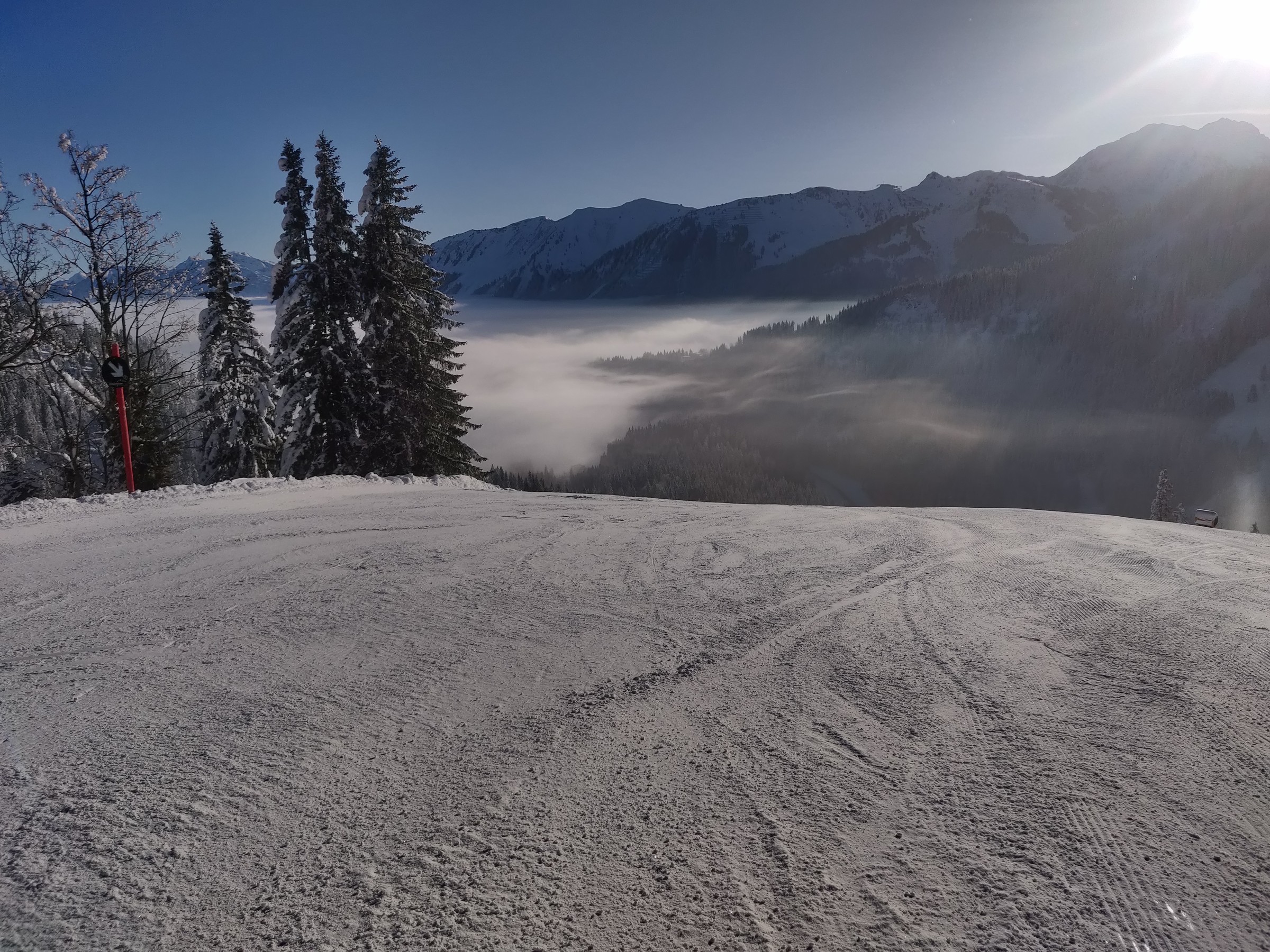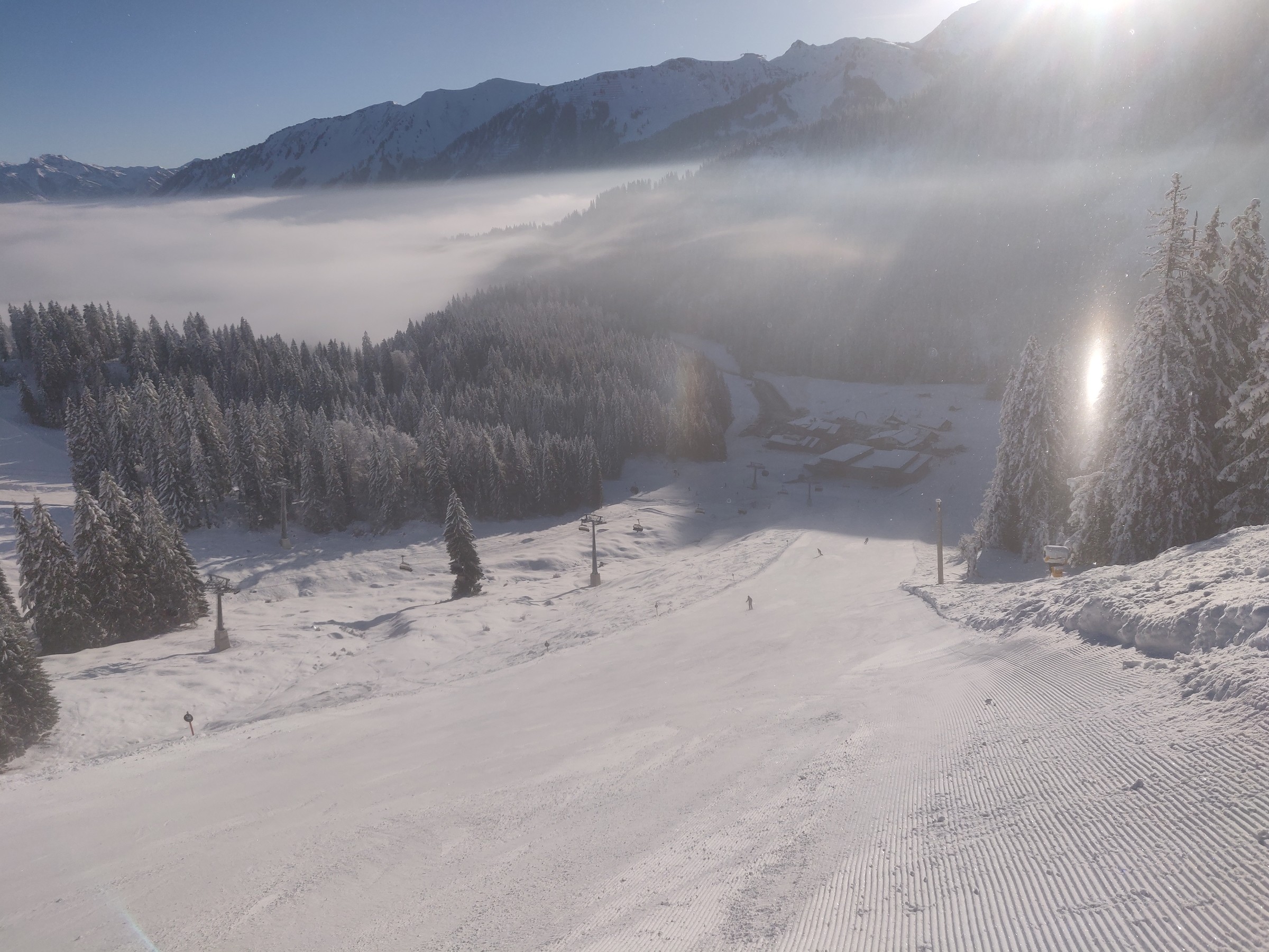 Angekommen am Berg darf man das Nebelmeer, den noch viel mehr als auf dem Foto glitzernden Schnee und die Allgäuer Alpen bestaunen. Die ersten Abfahrten sind wirklich euphorisierend. Denn die tief stehende Sonne sorgt auf dem ostexponiertem Hang für eine beeindruckende Winterstimmung. Manchmal schimmern Nebelschwaden grünlich oder ein Windhauch bläst etwas Schnee von den Bäumen, der zu einer Glitzerwolke wird. Die leeren und frisch präparierten Pisten verleihen dem Skifahren eine Leichtigkeit, die echt Spaß macht. Auch wenn die Pisten nicht ganz so griffig sind wie erhofft.