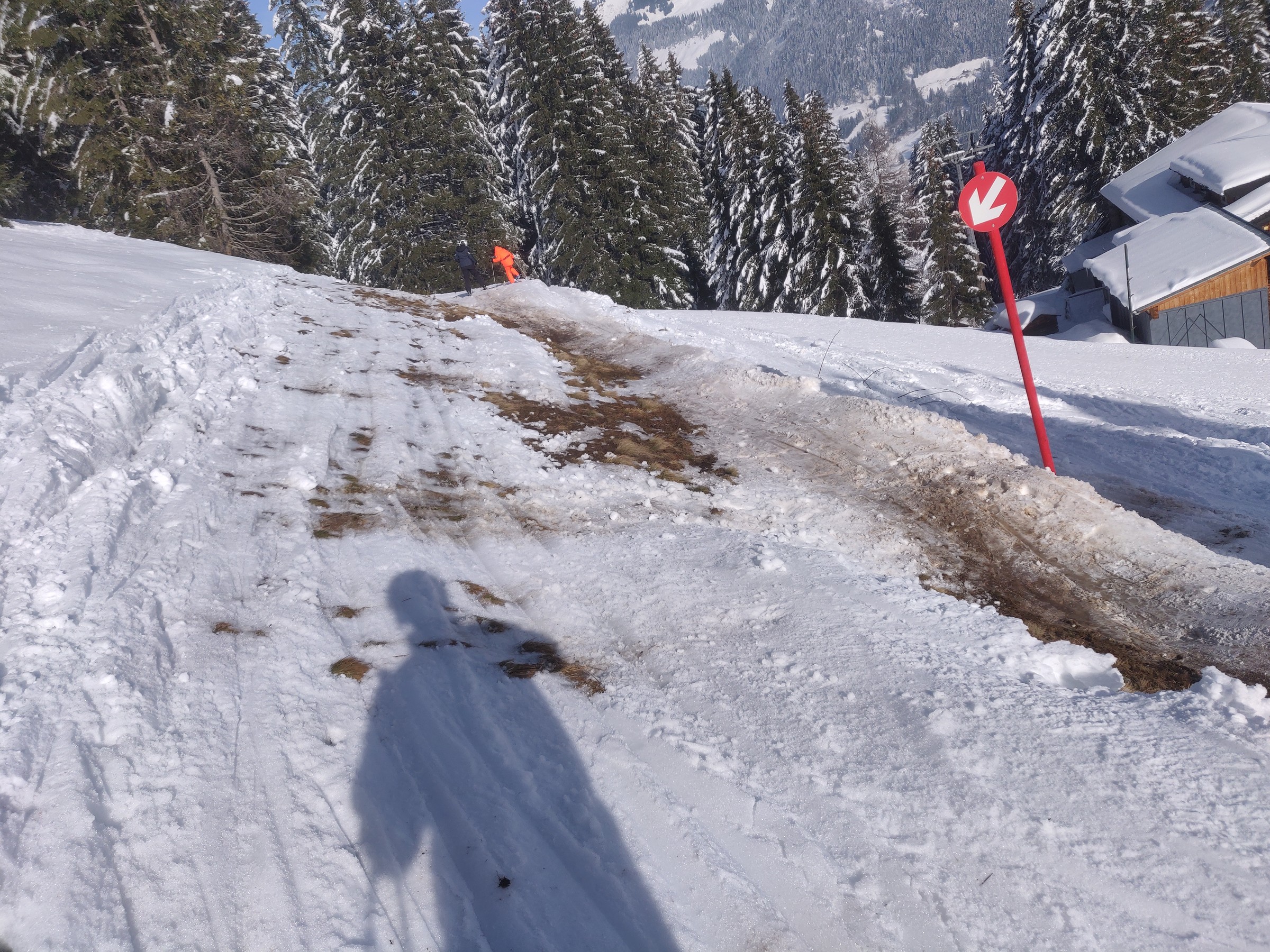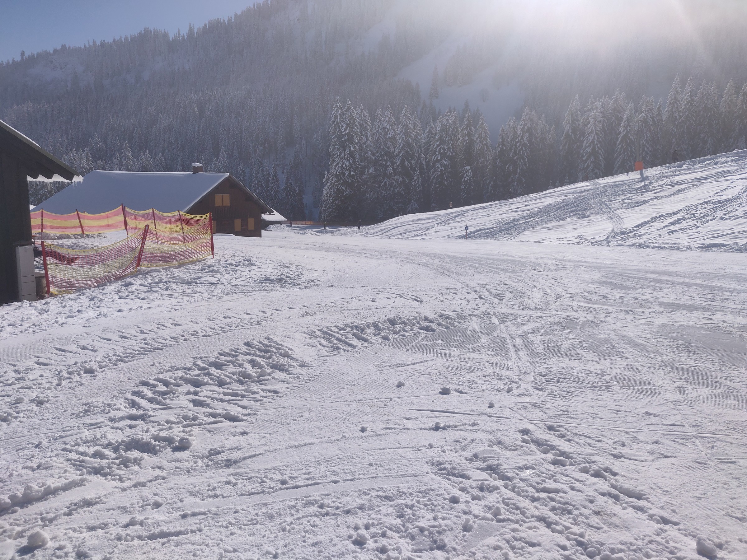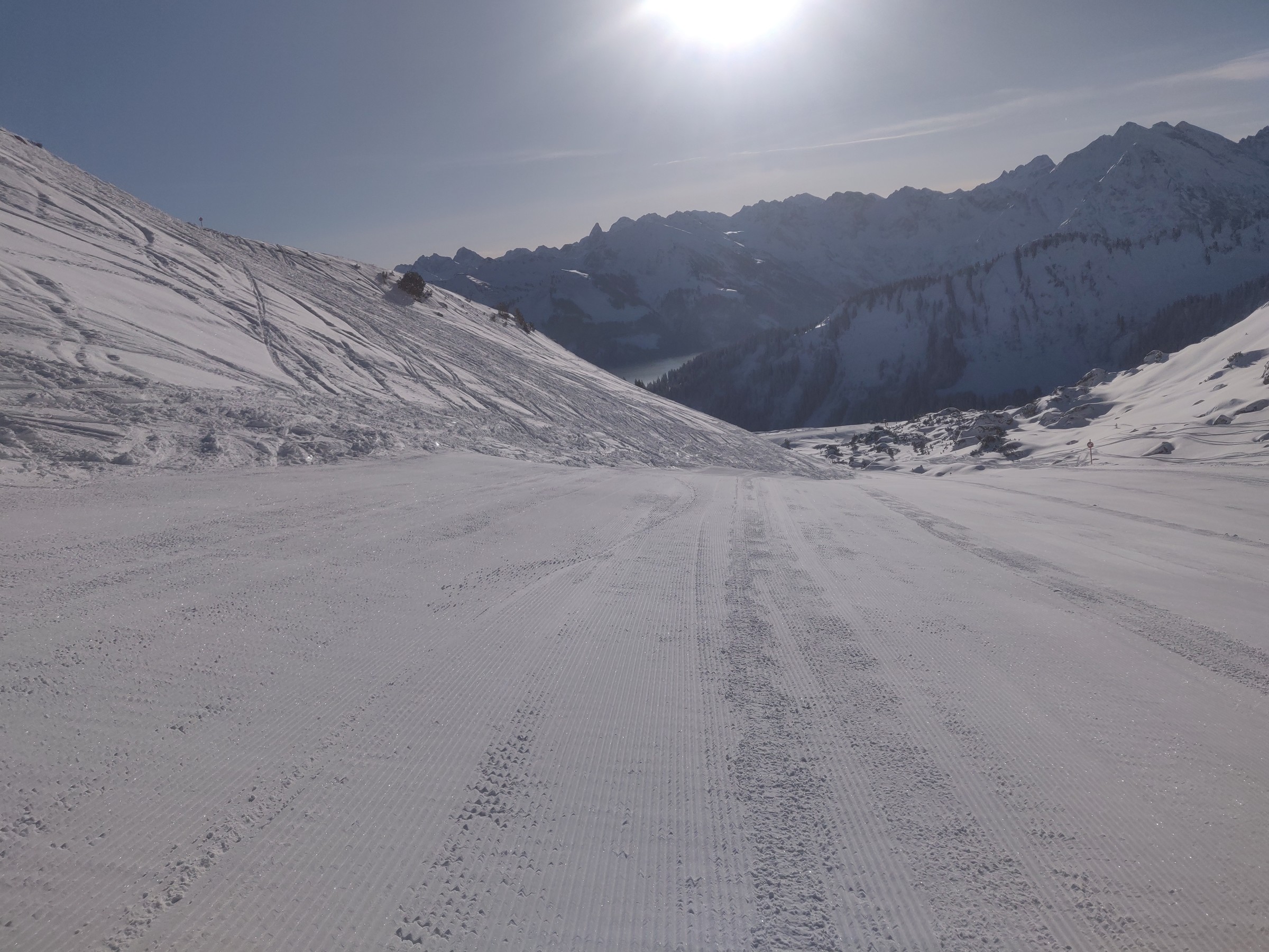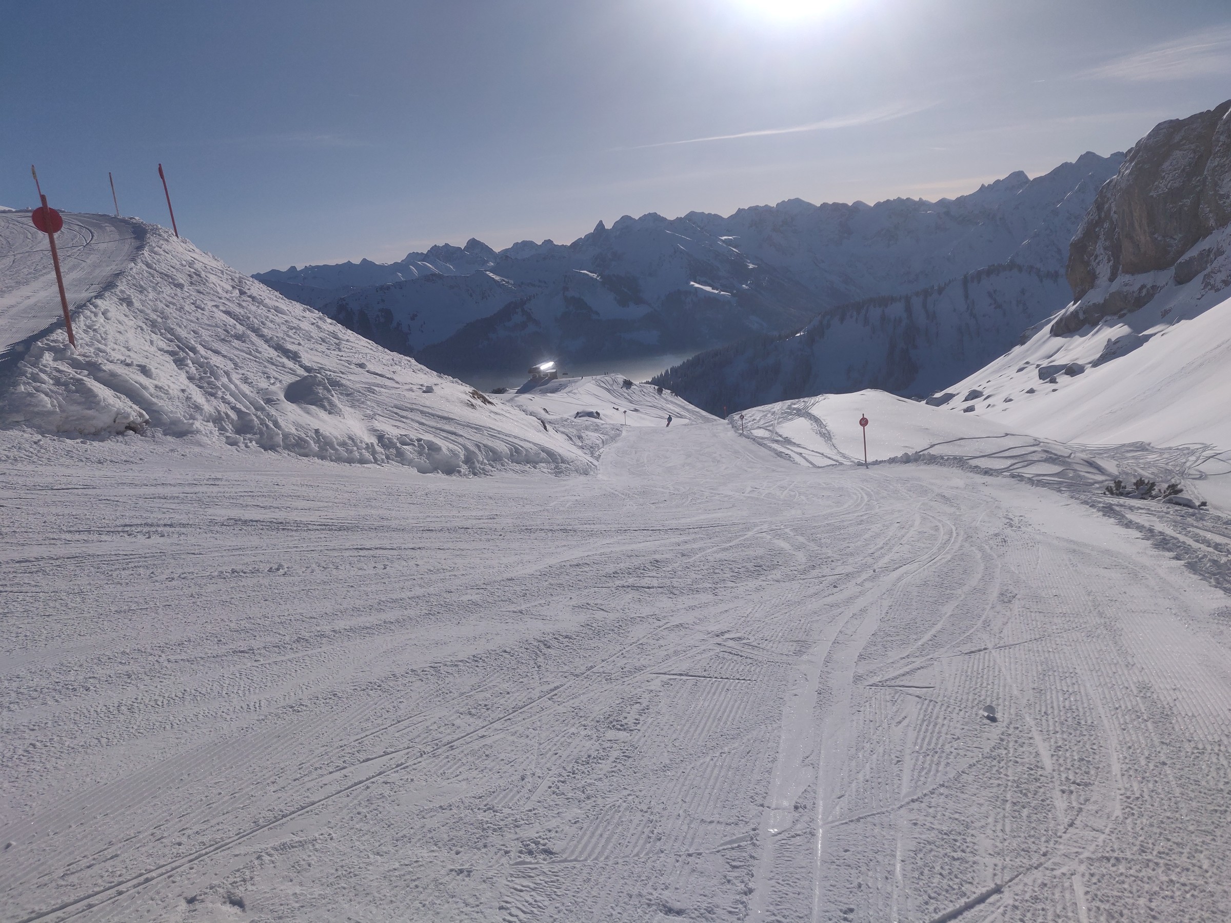 Etwas später dann auf dem Gleitweg Gottesacker. Schöne Außenrumabfahrt. Wobei Gleitweg die Steigung besser beschreibt. Nur beim Zusammentreffen mit der Piste Schäfalp wird es etwas eng. Ich fürchte, die Abfahrt Kellerloch wird diesen Winter nicht mehr aufgehen.