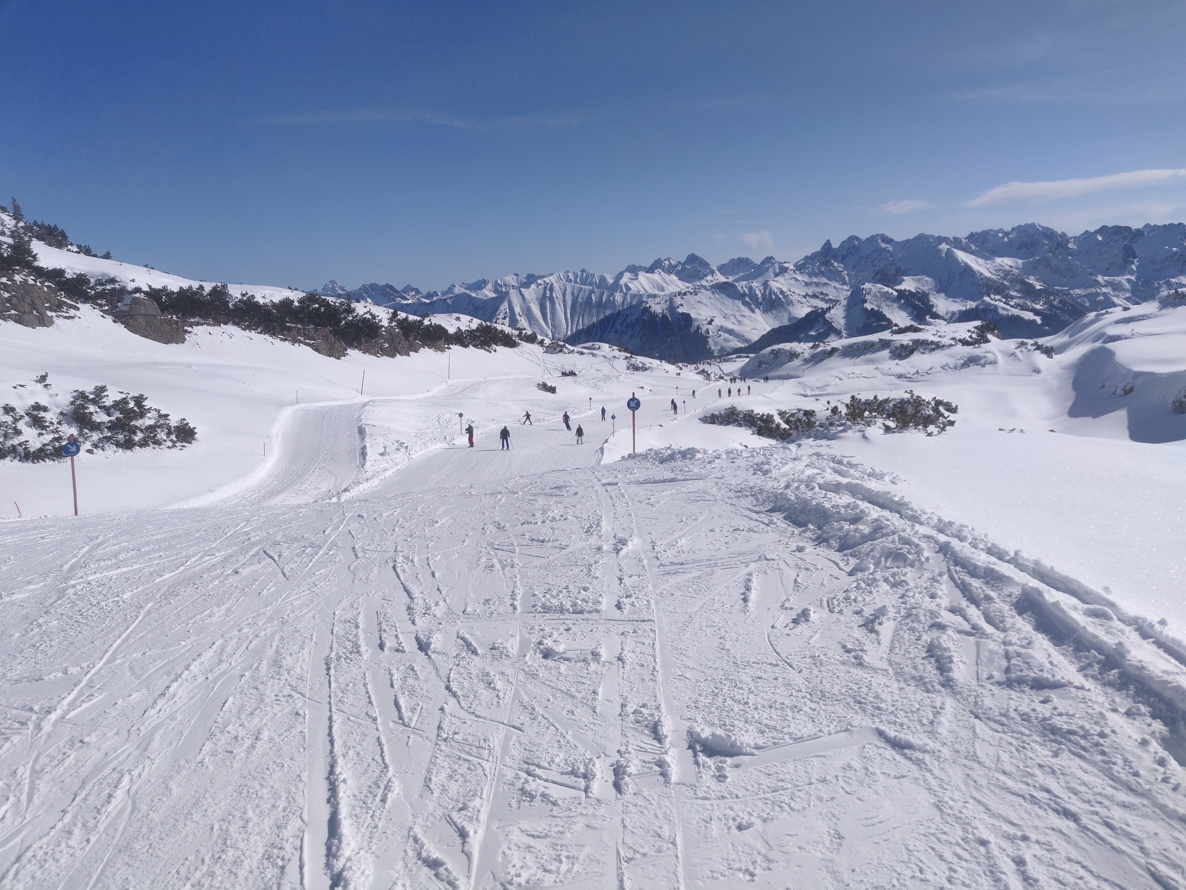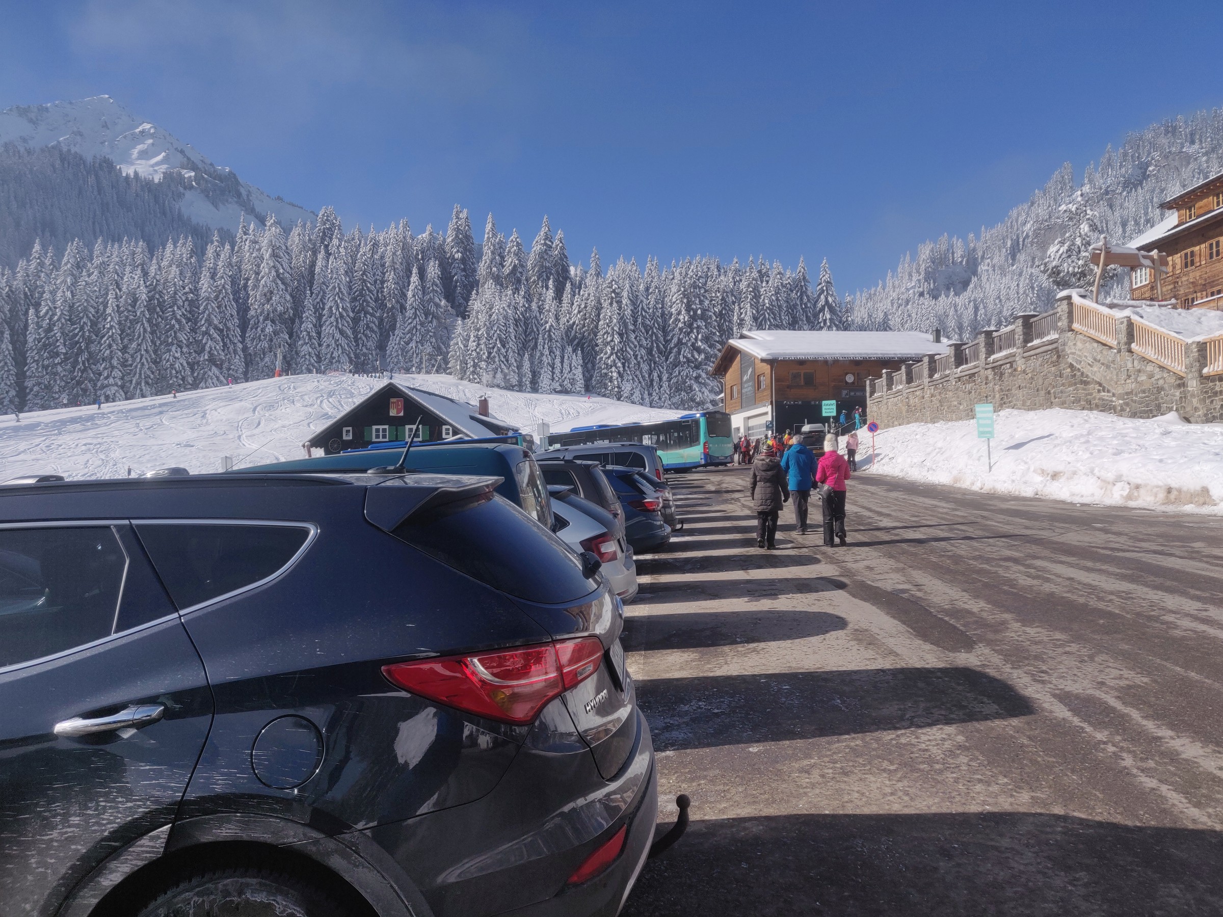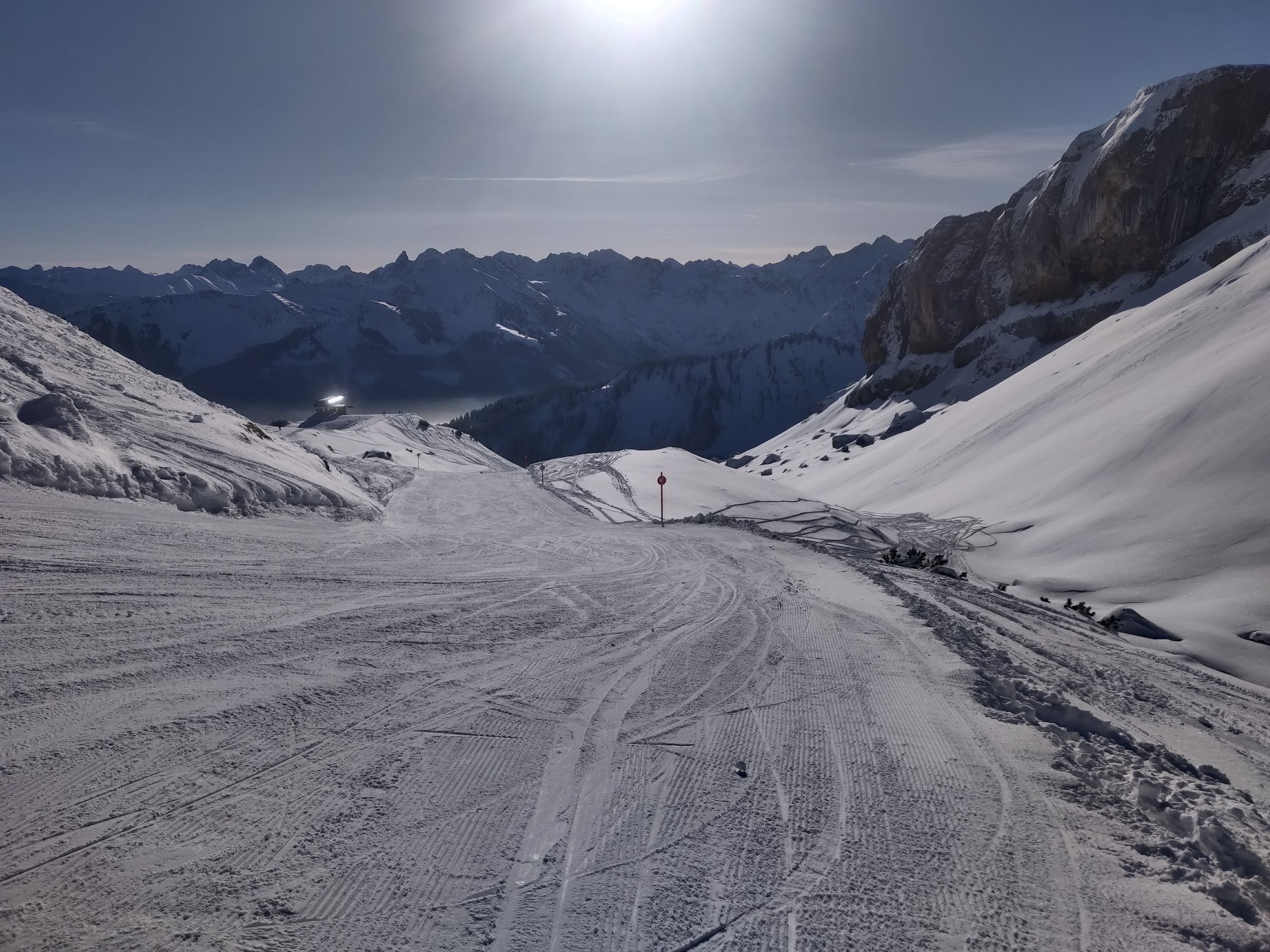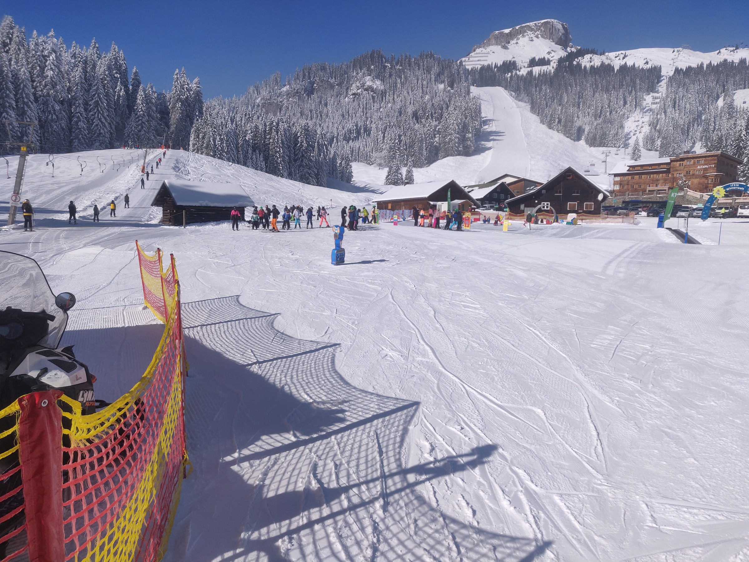 Schon um 10:00 mache ich die erste Pause, schließlich habe ich auch schon mehr als 2 Stunden Skitag hinter mir. Sehr positiv am Ifen ist, dass man verhältnismäßig viel Skivergnügen pro Zeit hat. Denn es gibt kaum nervige Ziehwege oder Engstellen und die beiden Anlagen (aber insbesondere die Sesselbahn) haben ein gutes Höhenmeter / Zeit Verhältnis. Das Skigebiet lädt sehr zum sportlichen Fahren ein. Das Bedürfnis beim Skifahren an die Grenzen zu gehen, Geschwindigkeit, Höhenmeter fressen, all das kann der erste Teil des Skitages. Und bei dem Wetter ist selbst der Blick vom Parkplatz beeindruckend.