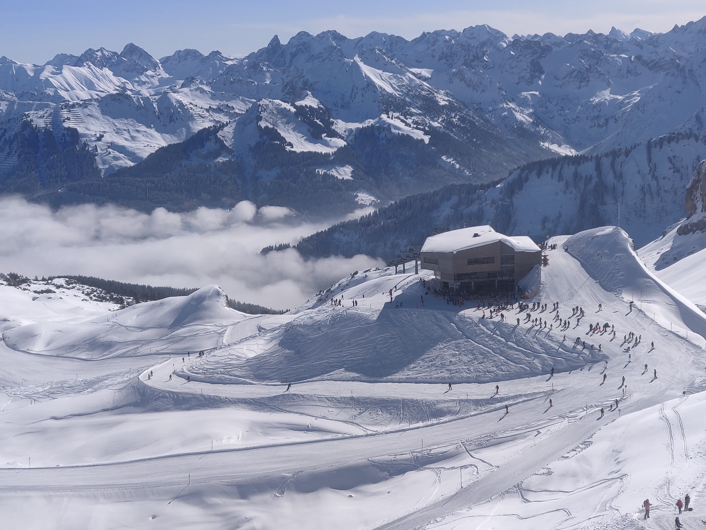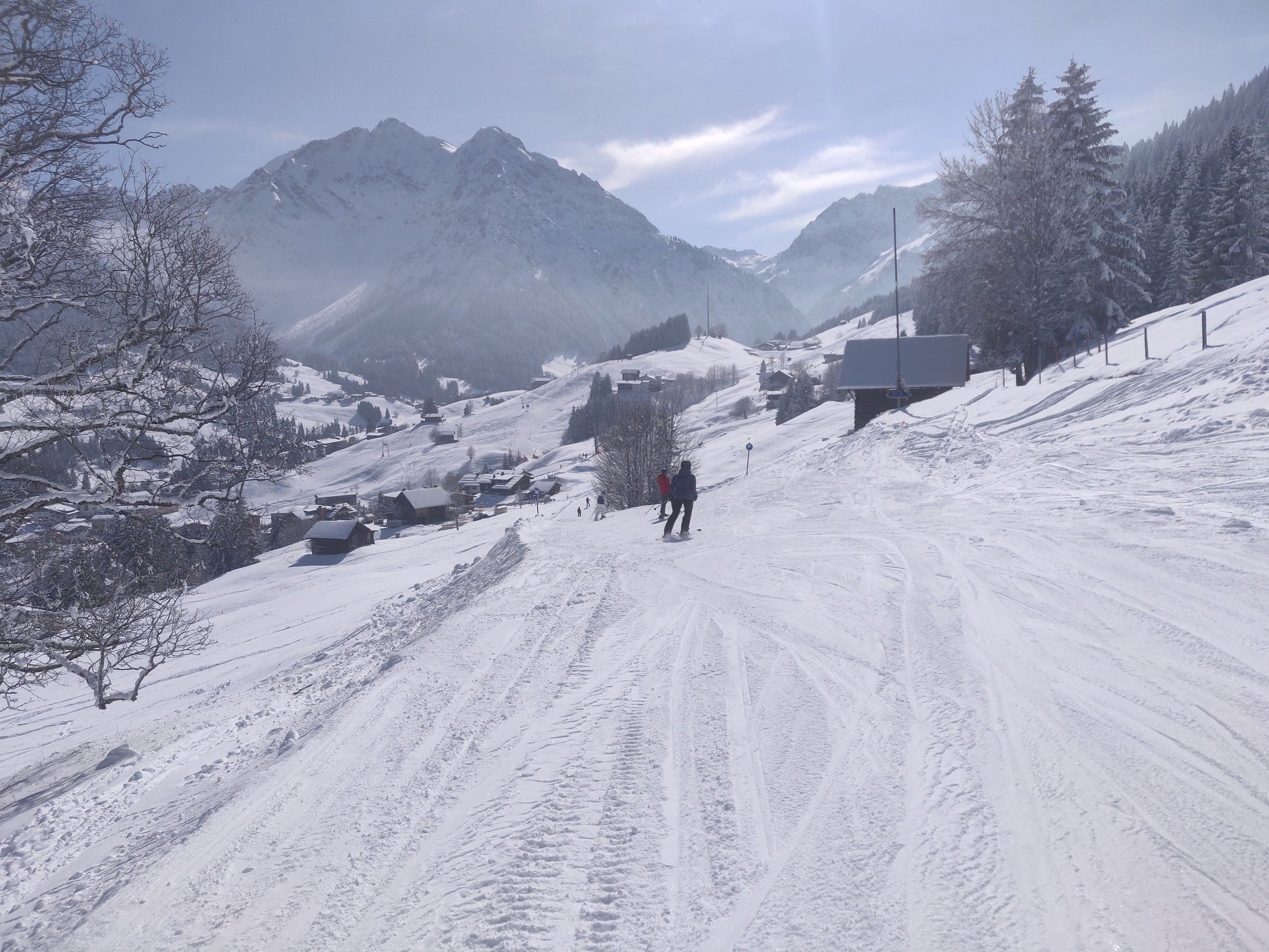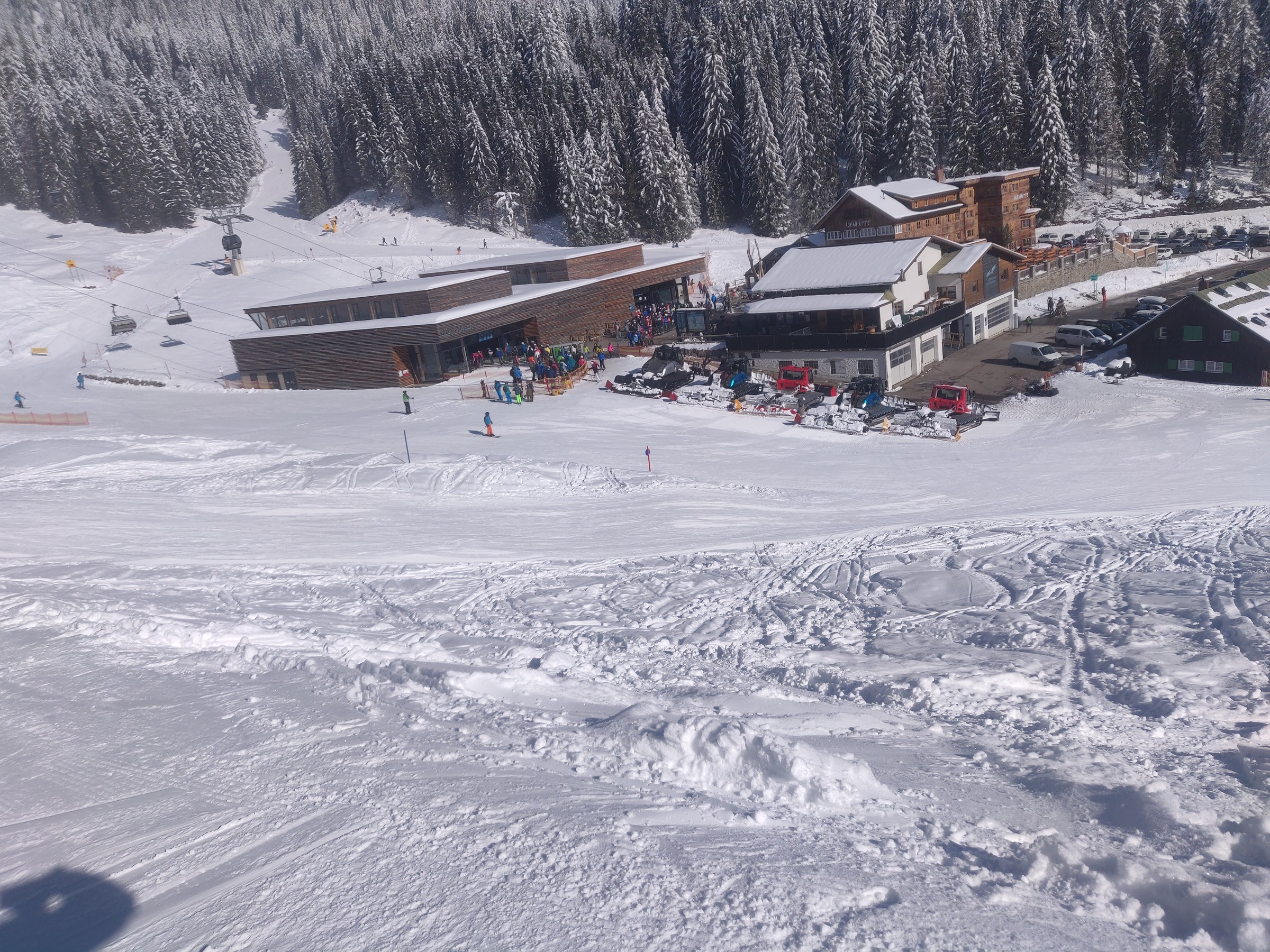Schon um 10:00 mache ich die erste Pause, schließlich habe ich auch schon mehr als 2 Stunden Skitag hinter mir. Sehr positiv am Ifen ist, dass man verhältnismäßig viel Skivergnügen pro Zeit hat. Denn es gibt kaum nervige Ziehwege oder Engstellen und die beiden Anlagen (aber insbesondere die Sesselbahn) haben ein gutes Höhenmeter / Zeit Verhältnis. Das Skigebiet lädt sehr zum sportlichen Fahren ein. Das Bedürfnis beim Skifahren an die Grenzen zu gehen, Geschwindigkeit, Höhenmeter fressen, all das kann der erste Teil des Skitages. Und bei dem Wetter ist selbst der Blick vom Parkplatz beeindruckend.