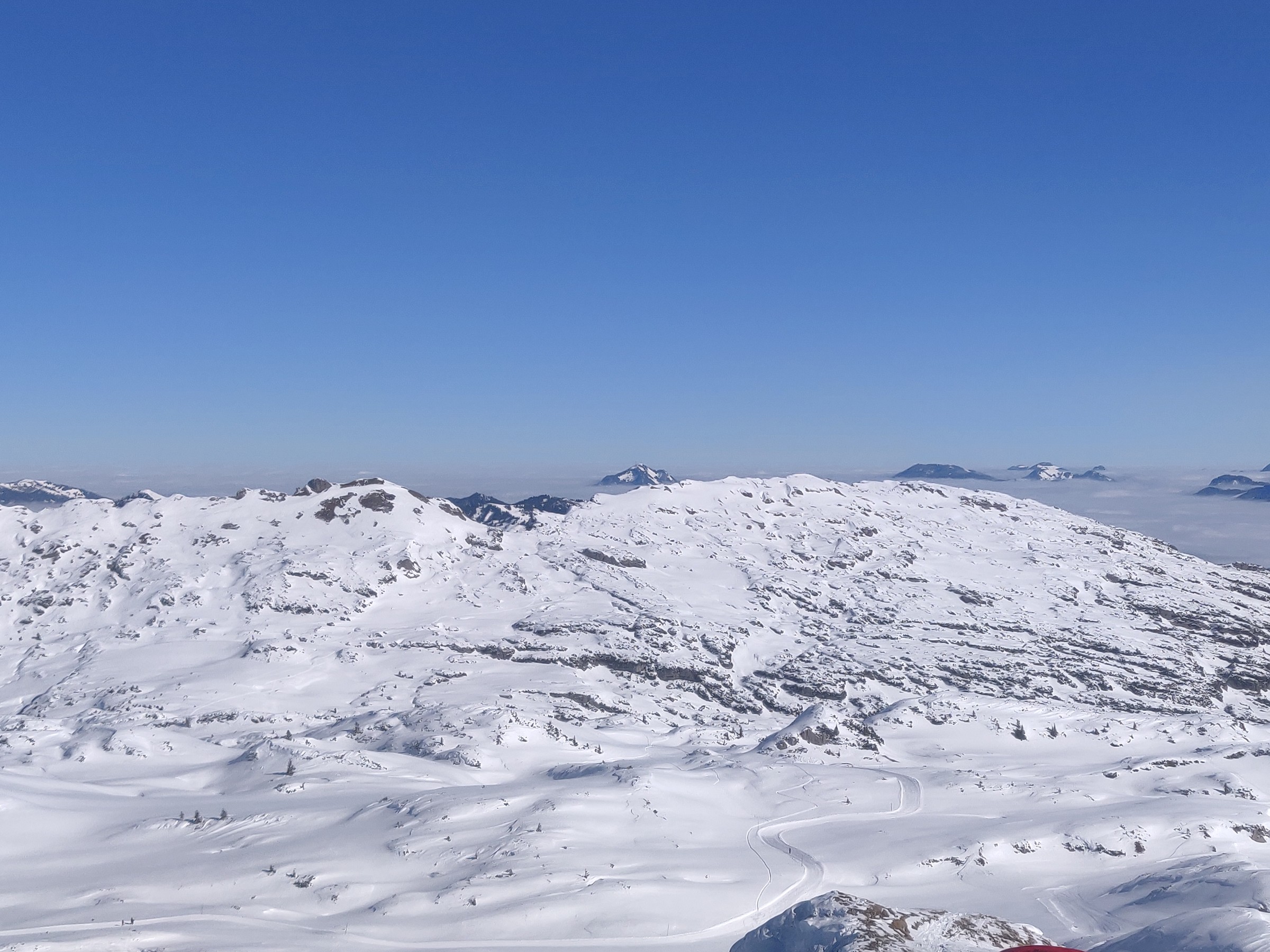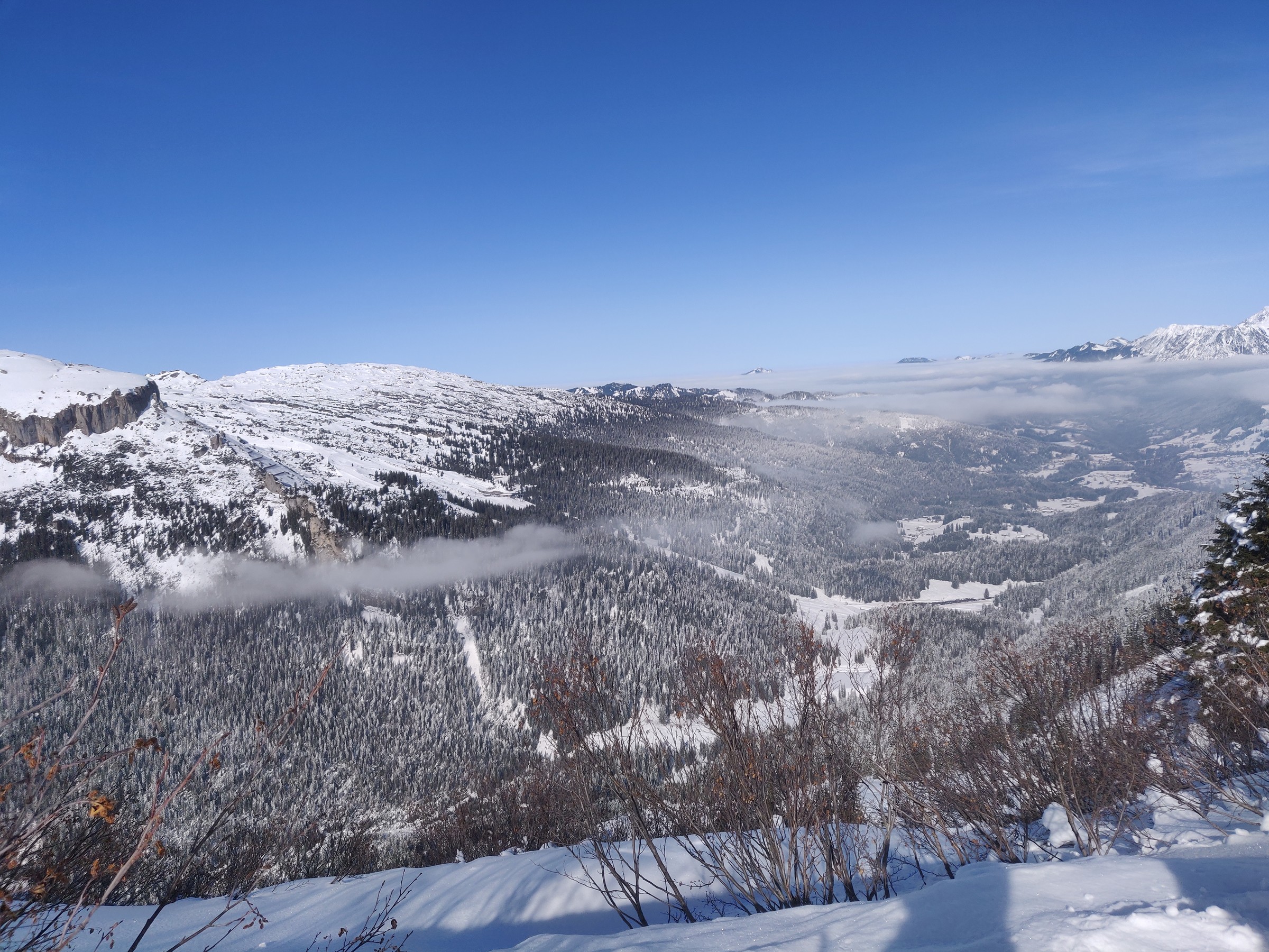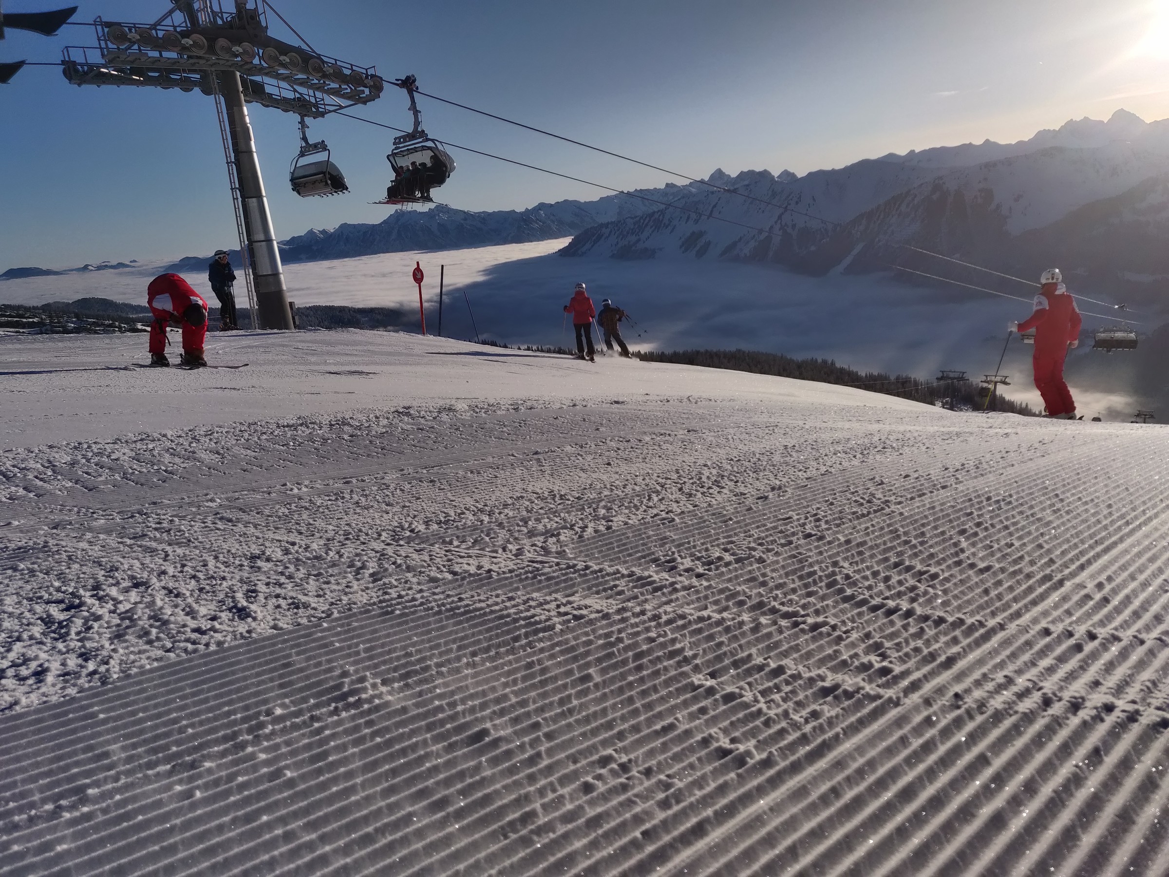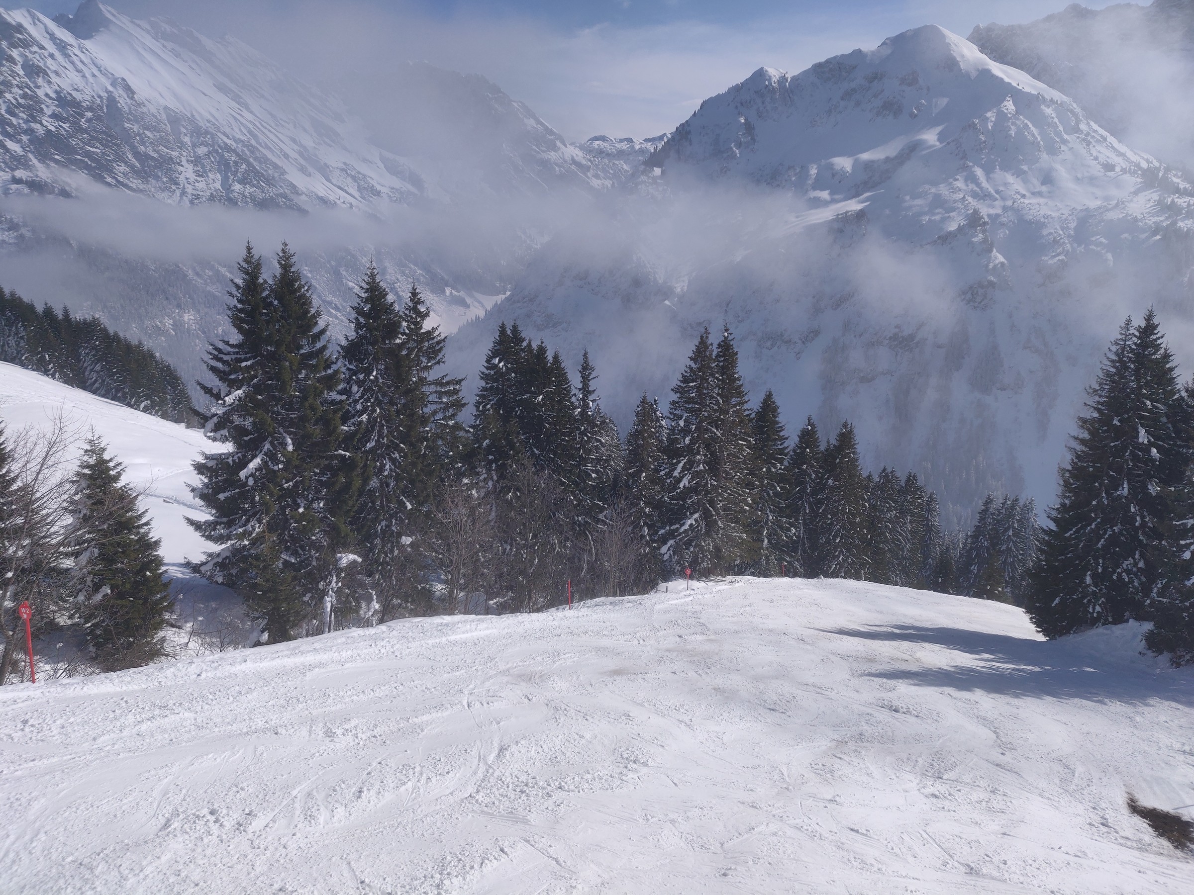 Schon um 10:00 mache ich die erste Pause, schließlich habe ich auch schon mehr als 2 Stunden Skitag hinter mir. Sehr positiv am Ifen ist, dass man verhältnismäßig viel Skivergnügen pro Zeit hat. Denn es gibt kaum nervige Ziehwege oder Engstellen und die beiden Anlagen (aber insbesondere die Sesselbahn) haben ein gutes Höhenmeter / Zeit Verhältnis. Das Skigebiet lädt sehr zum sportlichen Fahren ein. Das Bedürfnis beim Skifahren an die Grenzen zu gehen, Geschwindigkeit, Höhenmeter fressen, all das kann der erste Teil des Skitages. Und bei dem Wetter ist selbst der Blick vom Parkplatz beeindruckend.